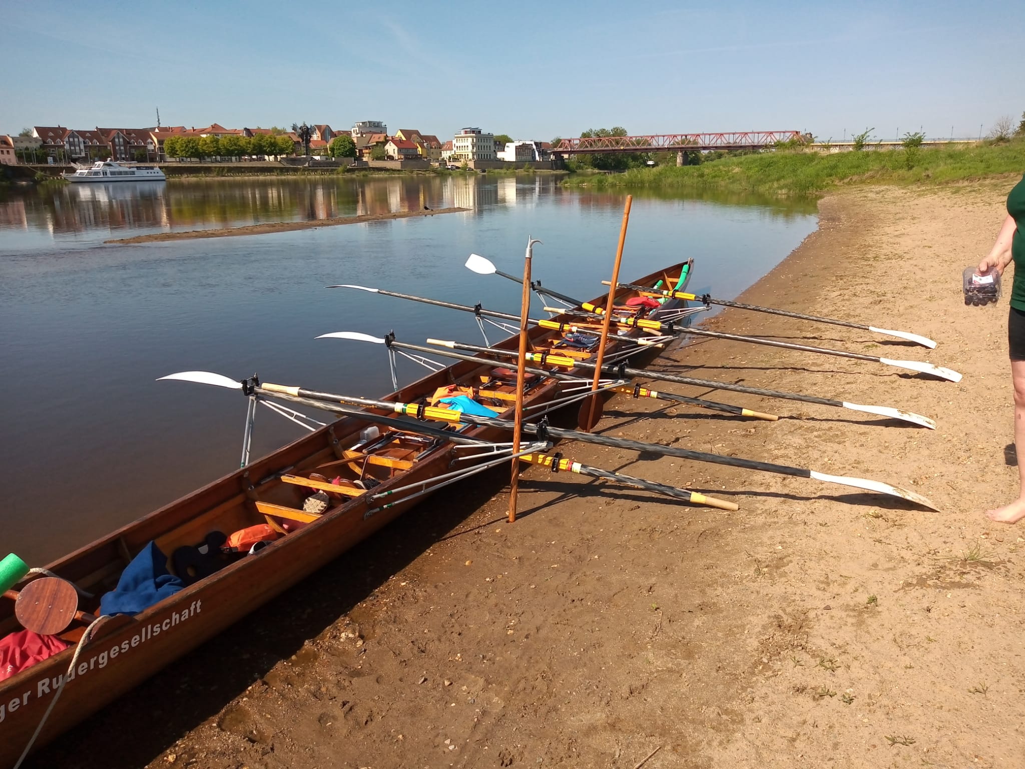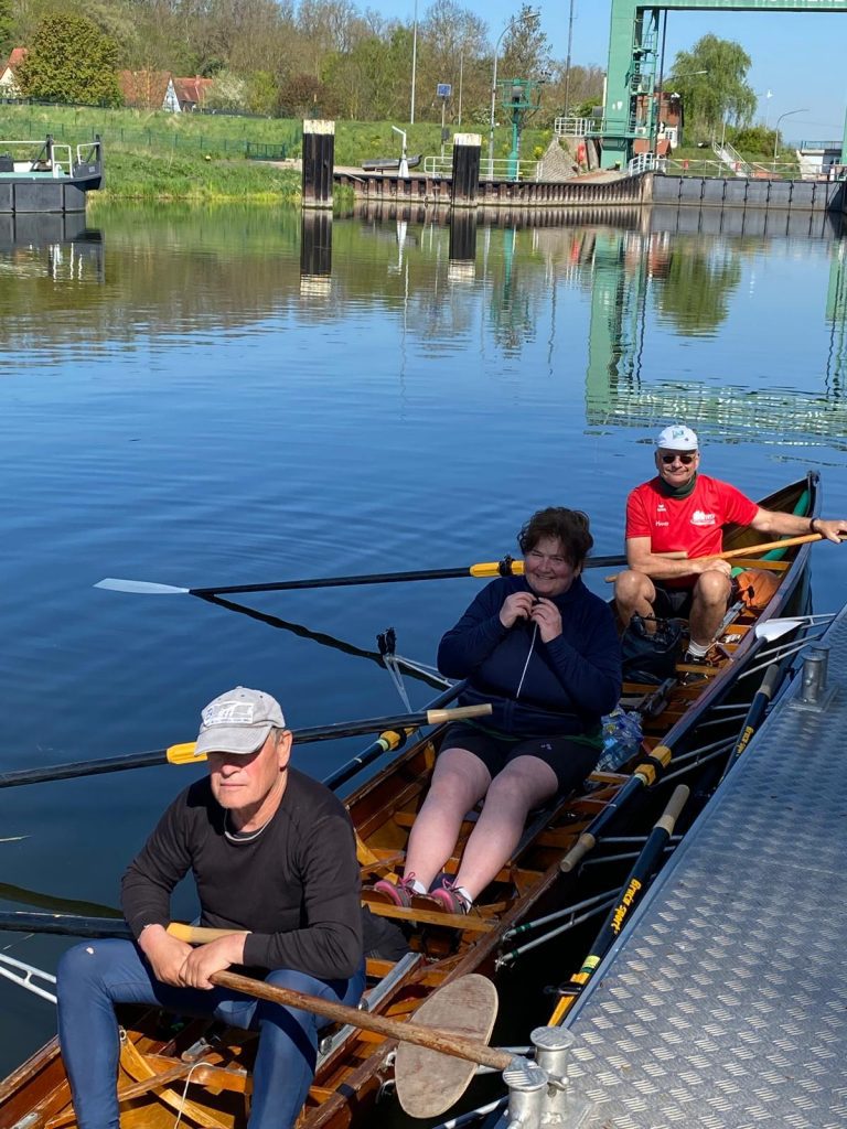 Am nächsten Morgen dann das letzte Stückchen (ca. 28 km) nach Magdeburg. Und da waren wieder die Klischees: die Damen machten in der Natur (Sandstrand) bei Schönebeck Rast, während die Herren sich einen bequemen Steg suchten – mit Erfolg! Ein kleiner Motorboothafen lud förmlich zum Rasten ein. Wurde auch ausgiebig genutzt. Und wieder konnten wir die vorbei“schießenden“ Damen (strömungstechnisch) bewundern. Jetzt nochmal ca. 10 km und wir konnten Petra am Ziel winken sehen. Noch mal alles ruderische Können gezeigt und wir lagen am Steg. Später erklärte uns Petra, dass wir eigentlich auf Sandbankkurs waren. Sah aber auch mit etwas Phantasie aus wie der Suezkanal.Aber es waren 2 unerschütterliche Ruderrecken/in von der Nordseeküste am Steuer – also null Chance auf „Havarie“!