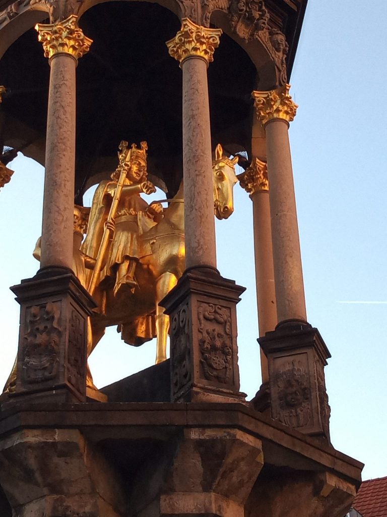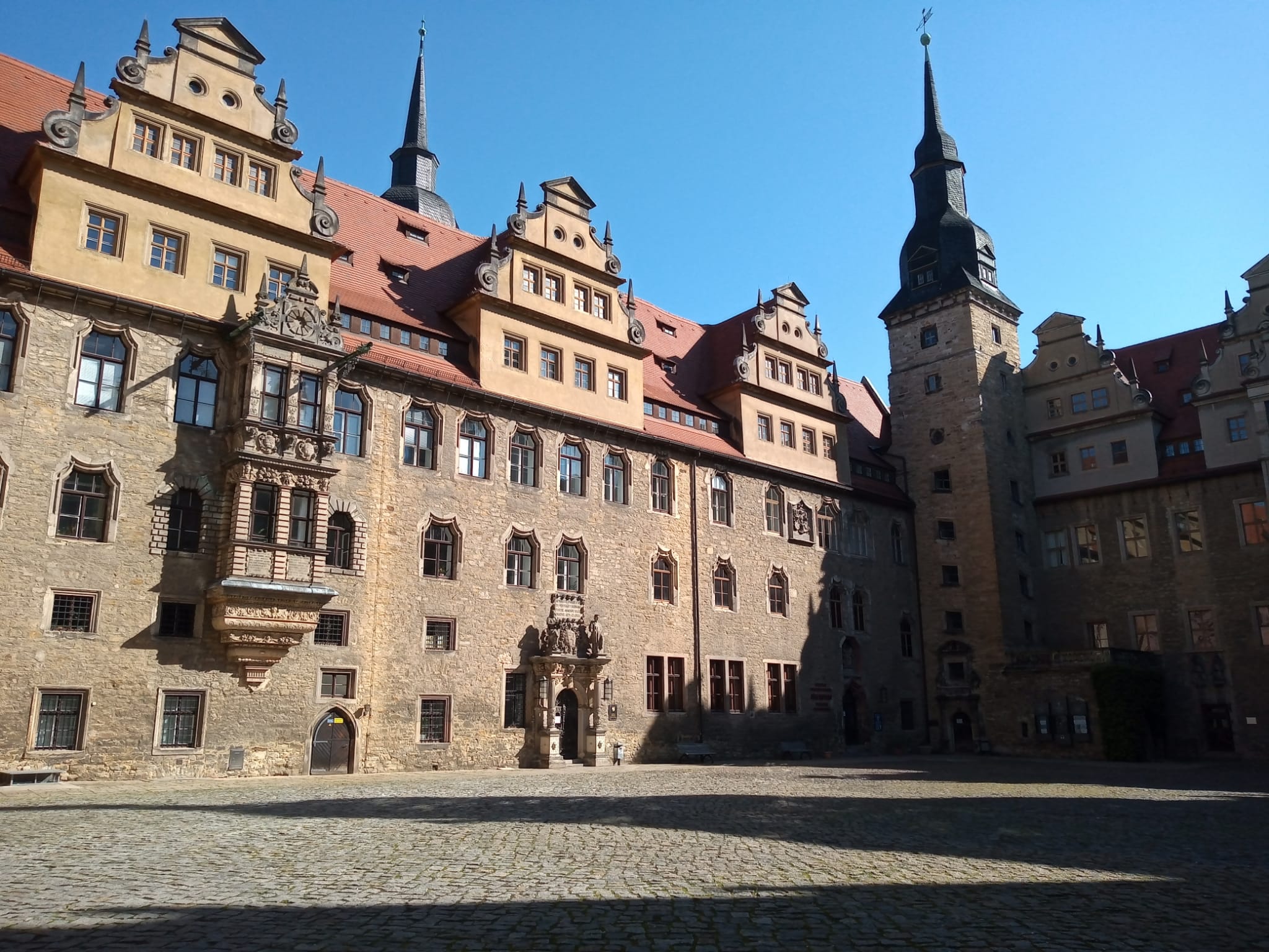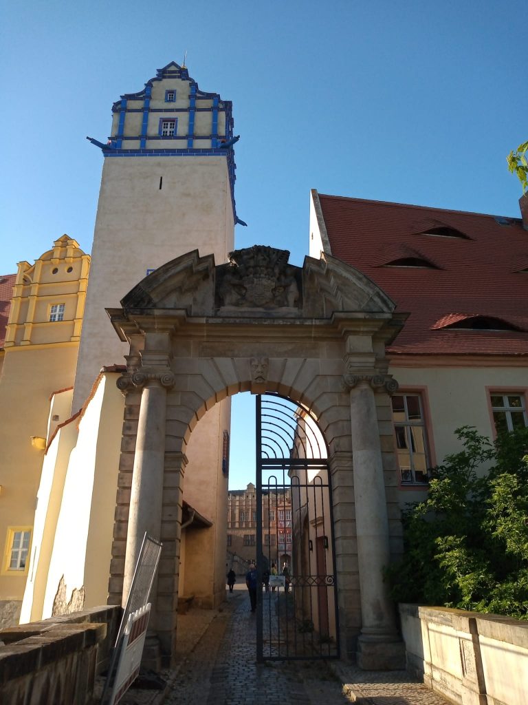 Dadurch hatten wir am nächsten Tag bei bestem Sonnenschein einen, im wahrsten Sinne des Wortes, Wandertag. Zuerst von der Unterkunft nähe Bootshaus ins Zentrum von Merseburg mit dem Dom (Nr. 1) und seiner über 1000-jährigen, vor allem das frühe Deutschland prägenden Geschichte, und die restaurierte Altstadt. Nach einer sachkundigen Führung war „Ausschwärmen“ im Sinne von Selbsterkundung angesagt. Und der Kontrast könnte nicht größer sein: von den „Merseburger Zaubersprüchen“ (ältestes Literaturdokument Deutschlands – 1300 Jahre alt) über die sehenswerte Altstadt, den obligatorischen Rabenkäfig (war leider ausquartiert wegen Umbauarbeiten) zu einer hinter dem schönen Klosterpark stattfindenden Rocker-Hochzeit (mindestens 1300 PS aus allen Teilen Deutschlands) eines hiesigen Harley Davidson Clubs . Also – Petra hatte da gaaaaaaaaaanz tief in die Kiste gegriffen wie man so sagt.