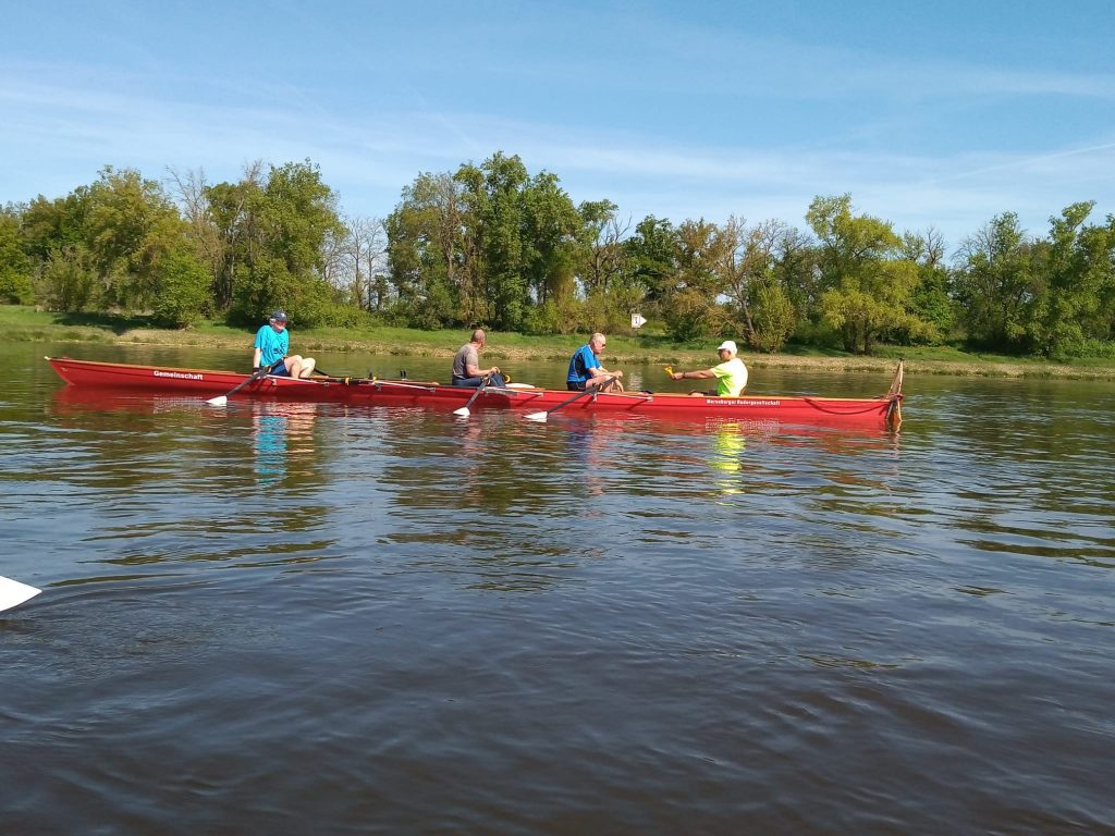 Nach Frühstück und obligatorischer Schleusung am Anfang ging es dann los zur „Totschlag-Etappe“ über ca. 45 km auf die Elbe und nach Pretzien (analog zur „stillen Post“ gingen auch hier die Annahmen bunt durcheinander – von 42 km bis 52 km). Sei‘s drum: Gegen 9:00 Uhr waren die Ruderer los und Bernburg eine „Attraktion“ ärmer („stille Post“ endet mit: „…die Bären sind los!“ und Petra: „…die Ruderer sind los…“). Und die Etappe zog sich! Erst wurde das Mittagspicknick immer weiter nach hinten verlegt (keine vernünftige Anlegemöglichkeit), sodass kurze Sandpause angesagt war (durch die Mäandrierung der Saale und dadurch bedingter erhöhter Fließgeschwindigkeit sehr kräftezehrend) aber in Klein-Rosenberg fischte uns doch die gute Petra zu einem schönen Picknick aus den Booten. Da die Herren als letzte anlegten (Ladies first!) mussten sie auch als erste wieder los. Dabei ging auch ein auf der Rampe liegender Paddelhaken aus dem Damenboot mit den Herren auf Reisen. Was liegt der auch so herrenlos rum (grins,grins). Nur noch wenige km und dann kam die Elbe – doch welche Enttäuschung: zwar breiter als die Saale aber sonst? Erst bei der Abzweigung Pretziener Wehr merkte man, dass die Elbe doch eine kräftige Strömung hat. Da die Herren kurz nach der Einfahrt auf Sandbank aufliefen fiel der Entschluss: warten wir auf die Damen, damit sie nicht auch auflaufen. Es sah fast so aus, als ob das Boot vorbeischießt – obwohl die Mädels protestierten und behaupteten dass alles ganz normal war (hüstel,hüstel). Dann ging das Rätselraten los: „wo ist Fahrtenleitung und Anlegestelle?“. Den Kanal hochgerudert bis zum Hochwasserwehr (gute Dienste bei Hochwasser 2013 für Schutz Magdeburgs), ein Stück zurück in Seitenarm (wo die angelnden Campingfreunde langsam unruhig wurden wegen unserer Ziellosigkeit) und dann noch schlechte Handyverbindung. Die Chefin war unterwegs zum Kanal und Handy in Powerbank – nicht damit rechnend, dass wir doch so schnell sind. Ende gut, alles gut! Auf einer Landspitze, die wir 10 min. vorher passiert hatten, saß sie und wartete. Eine alte Rampe (von Steinverladung früher) war als Ausstieg gedacht. Nasser Ausstieg, Boote aus dem Wasser und dann konnten wir nochmal in aller Ruhe das Wehr bestaunen. (Alles überschattet von der Frage: „habt ihr unser Paddel?“) „Nein haben wir nicht. Großes Ehrenwort!…“ Am nächsten Morgen lag er doch im Herrenboot – Sachen gibt‘s… tz,tz,tz. Dann kleiner Fußmarsch von ca. 10 min (war schließlich eine „Wander“fahrt) durch das ruhige, gepflegte Örtchen (nichts zu merken von seiner überragenden Bedeutung für den Hochwasserschutz) in eine kleine ruhige Pension (wie die ganze Tour hatte auch hier die Petra ein glückliches Händchen). Gutes Essen und gemütliches Bierchen – das Leben kann so schön sein! Das einer der „Jungs“ gleich 2x sein Bier umkippte: er war wohl soviel „Anstrengung“ von seinem gemütlichen Rhein nicht gewohnt!?