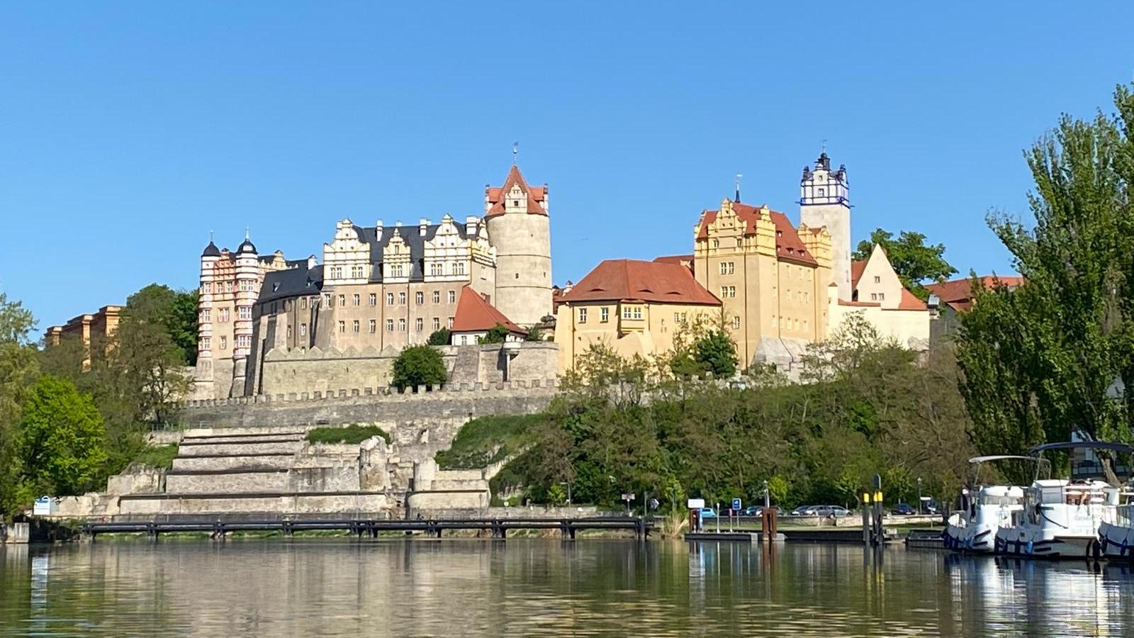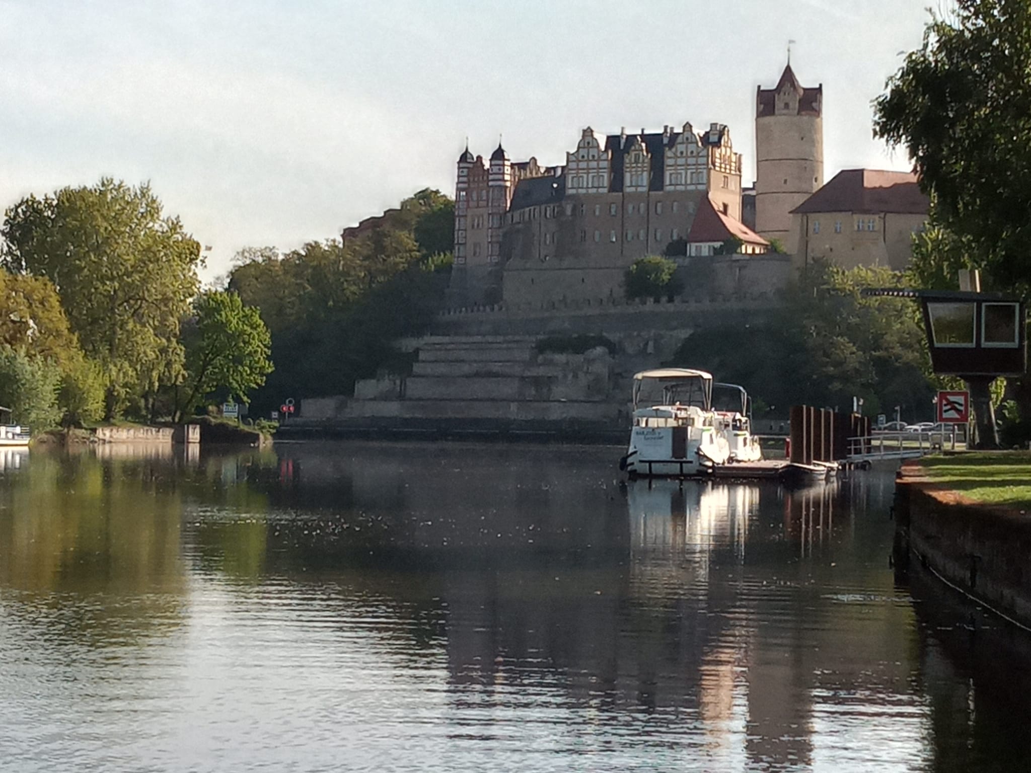 Am nächsten Morgen dann nach einem sehr guten Frühstück in der gemütlichen Unterkunft hätte es losgehen können. Aber ein kleines Handicap war: eine Ruderin war erkrankt und hatte sich von der Tour kurzfristig abgemeldet. Für die erste Etappe hatte Petra noch kurzfristig „Ersatz“ besorgen können (eine Kameradin aus Ihrem Magdeburger Club) aber jetzt ging es nur noch mit Loch weiter. War wenigstens jeden Morgen etwas Spannung: wer heute mit wem? Aber die Fahrtenleiterin Petra B. war ganz Diplomatin: „Männer! Ist das schlecht wenn Ihr mit ‚Loch‘ fahrt!?“ Selbstverständlich waren wir damit einverstanden – man ist ja schließlich Gentleman!!! Außerdem haben ja Saale und hoffentlich auch Elbe passable Strömungen und „bergab“ – „….Magdeburg! Wir kommen!…“ Erste Schleusung und dann: „Hammeretappe 2“ – ca. 36 km nach Bernburg. Damit wir nicht zu früh ankommen (Einchecken Hotel) waren wir „gezwungen“ Höhe Schleuse Alsleben Mittagsrast zu halten. Und da muss man sagen: aufgrund des Hochwassers 2013 hatte z. B. der Salzlandkreis Geld in die Hand genommen und neue Anlegemöglichkeiten für Wassertouris wie uns geschaffen! Kurz vorm Einschlafen erinnerte uns Gabi als Petras (ebenfalls) charmante rechte Hand an die noch anstehenden letzten Km. Durch die Pause gekräftigt waren wir dann auch recht zügig in Bernburg. Und dann: Kurve – Ruder halt – Boot quergestellt – und da lag die Perle Sachsen-Anhalts in aller majestätischen Schönheit vor uns. Schloss Bernburg! Ein erhabener Anblick mit den auch von weitem erkennbaren unterschiedlichen Baustilen. Nach dem „ewig“ langem Marsch ins Hotel (unter anderem vorbei auch an der „Stillen Post – ein kindergerechtes Ensemble über die Gerüchteküche) und Frischmachen im Hotel ging es auch los ins Schloss. Vorbei an einer riesigen Blumenuhr (wo früher stündlich „An der Saale hellem Strande, …“ erklang; endlich hatten wir das Rätsel von Halle/S. her gelöst) noch um 2 Ecken und über den Bärenzwinger (der leider aus Tierschutzgründen schon länger verwaist ist) und wir waren im Schlosshof. Und zugegeben: zumindest bei mir waren nach dem Anblick vom Fluss her die Erwartungen wohl doch zu hoch; obwohl es immer noch viel zu entdecken gab. Vor allem der wuchtige Eulenspiegelturm dominiert das gesamte Ensemble. O-Ton Uwe: „ … Eulenspiegel ist doch von uns aus Moelln. …“ Nach dem obligatorischen Gruppenfoto mit Saaleaue im Hintergrund ging es dann zum Essen in das einzige (!) Montag geöffnete Restaurant Bernburgs. War aber den Weg wert!