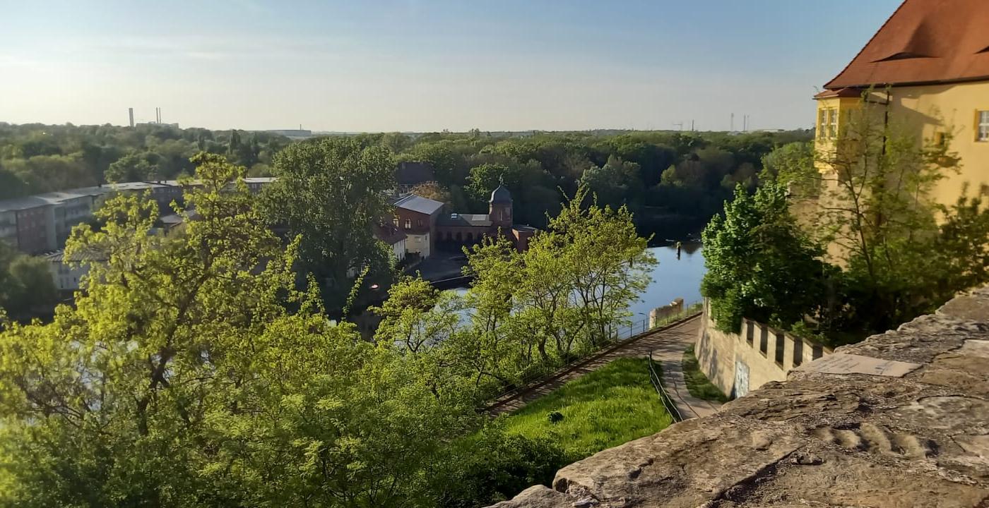 Aber dann! Am Sonntag Vormittag ging es dann endlich los! Nach Frühstück ging es (wieder mit Straßenbahn) zum Startplatz nach Halle-Trotha. Dort war schon lebhafter Betrieb, man ließ sich aber nicht stören – Platz war genug. Und aufgeriggert war schnell und es konnte losgehen. Um gemeinsam in die ca. 100 m entfernte Schleuse einzufahren machten wir erst noch einen Warmruderabstecher Saaleaufwärts bis Burg Giebichenstein (Halle-Kröllwitz) und beginnendem Raten: wie war das nochmal mit „…an der Saale hellem Strande, …“ Lösung einen Tag später. Dann – Schleusung problemlos und „Hammertour“ durch fast 18 km Natur pur. Vorbei an Investruine Hafen Halle-Trotha (kein Saaleausbau zur Wasserstraße aus Naturschutzgründen) entlang einzelner kleiner Dörfer zum Ziel Wettin. Schon von weitem grüßte die Burg – Stammsitz eines der ältesten Herrschergeschlechter Deutschlands. Ist schon eine imposante Anlage mit ihren fast 3 km Mauerumfang; musste natürlich erkundet werden. Auf einem der höchsten Punkte war auch noch ein kleines schmuckes Cafe – mit Klasse-Panoramablick inklusive.