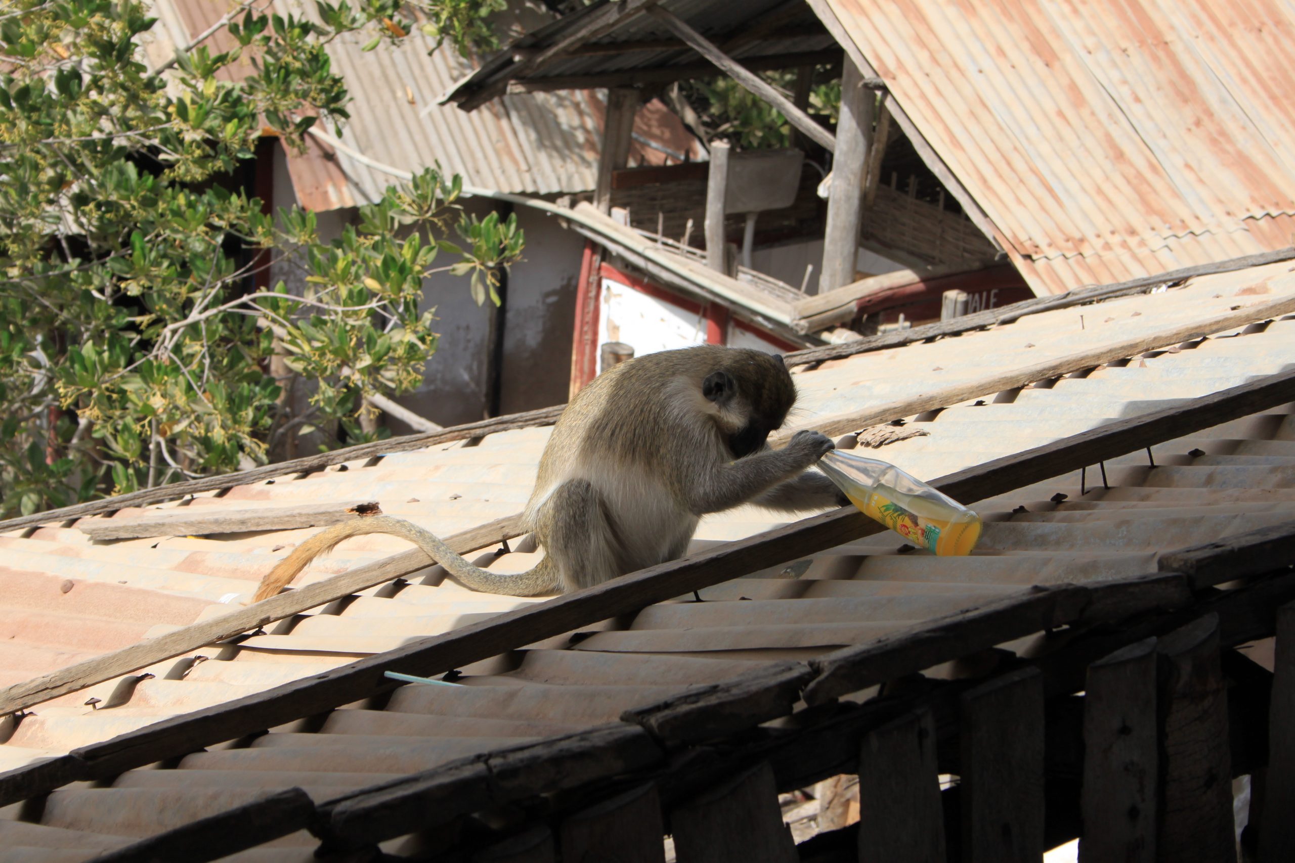 Wir erreichen eine Verbindung zum eigentlichen Gambia River und können die Hauptstadt Banjul in der Ferne erkennen. Für uns geht es aber auf dem Nebenarm weiter, bis wir, von Mangroven begleitet, unser Tagesziel erreichen. Die Lamin Lodge ist ein dreistöckiges, luftiges Holzgebäude. Hier haben wir die Möglichkeit zum Essen. Das Schild am Eingang hat uns schon gewarnt: „Don’t feed the monkey.“ Tatsächlich laufen einige Affen durchs Gebäude. Irgendwann bleibt eine Saftflasche unbeaufsichtigt auf dem Tisch stehen. Nicht viel später hat ein Affe sie geschnappt, setzt sich – für uns unerreichbar – aufs Dach und genießt den Saft.