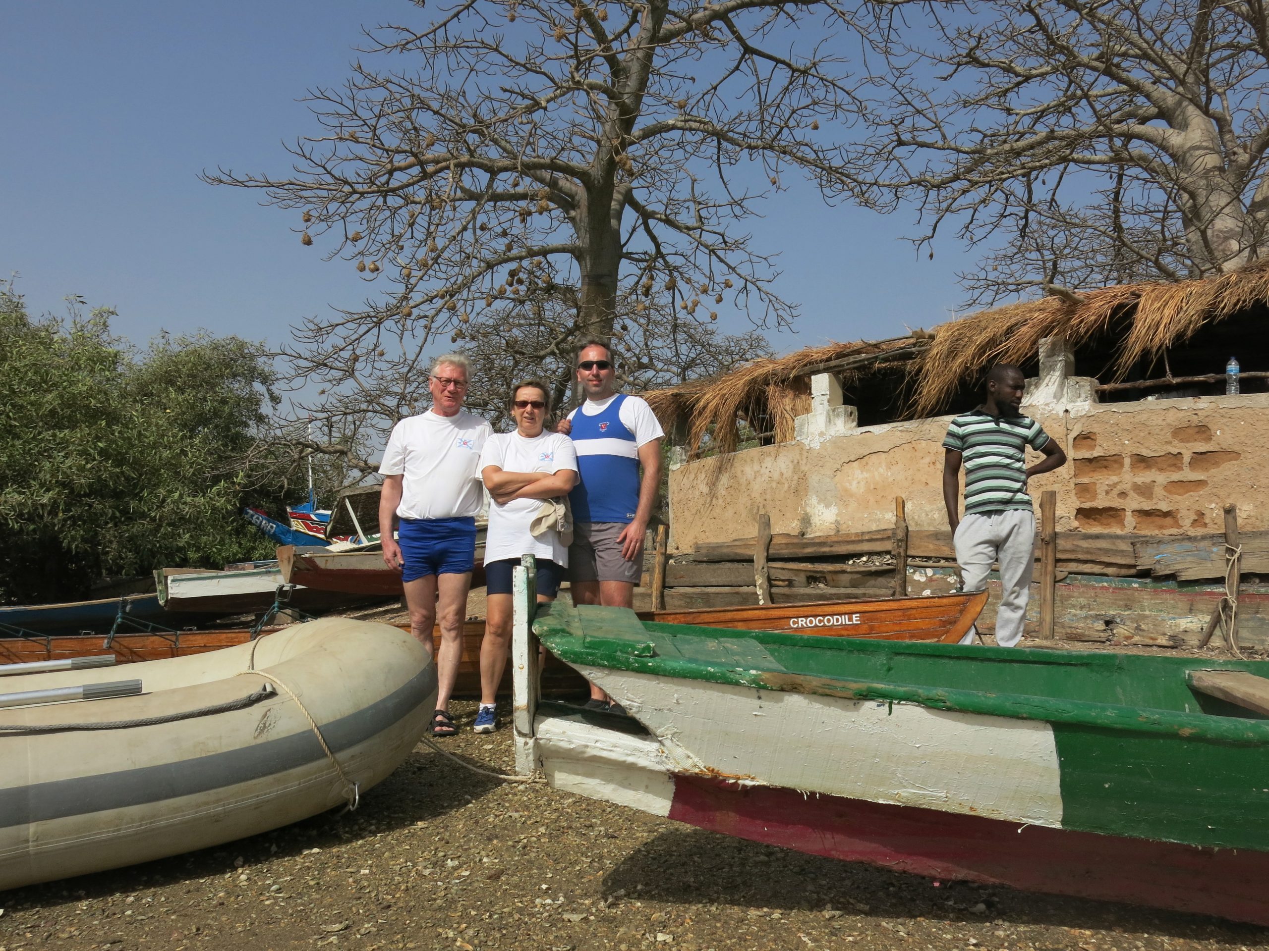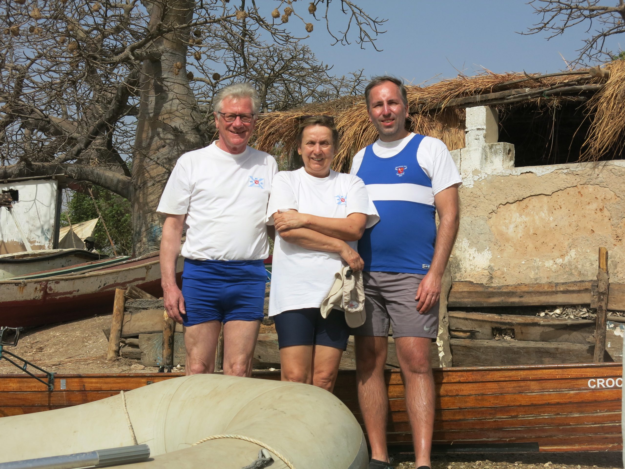 Ein Anruf bei der Veranstalterin – eine Ruderin aus Berlin – und die Sache war gebucht. Das Rentnerinnendasein war Karin Bößenroth zu langweilig. Daher ließ sie zwei alte Klinkerboote nach Gambia verschippern und organisiert dort nun Rudertouren. Ein kurzer Anruf und die Sache war gebucht. Unser Vereinskamerad Christian war auch sofort mit dabei und unsere Freunde aus Brüssel – mir denen wir bereits in Franz. Guyana gerudert sind – waren auch zugleich begeistert. Die Gruppe wurde von Ruderfreunden aus Magdeburg und D-dorf komplettiert und so begaben sich 12 Ruderer auf die abenteuerreiche Reise nach Schwarzafrika.