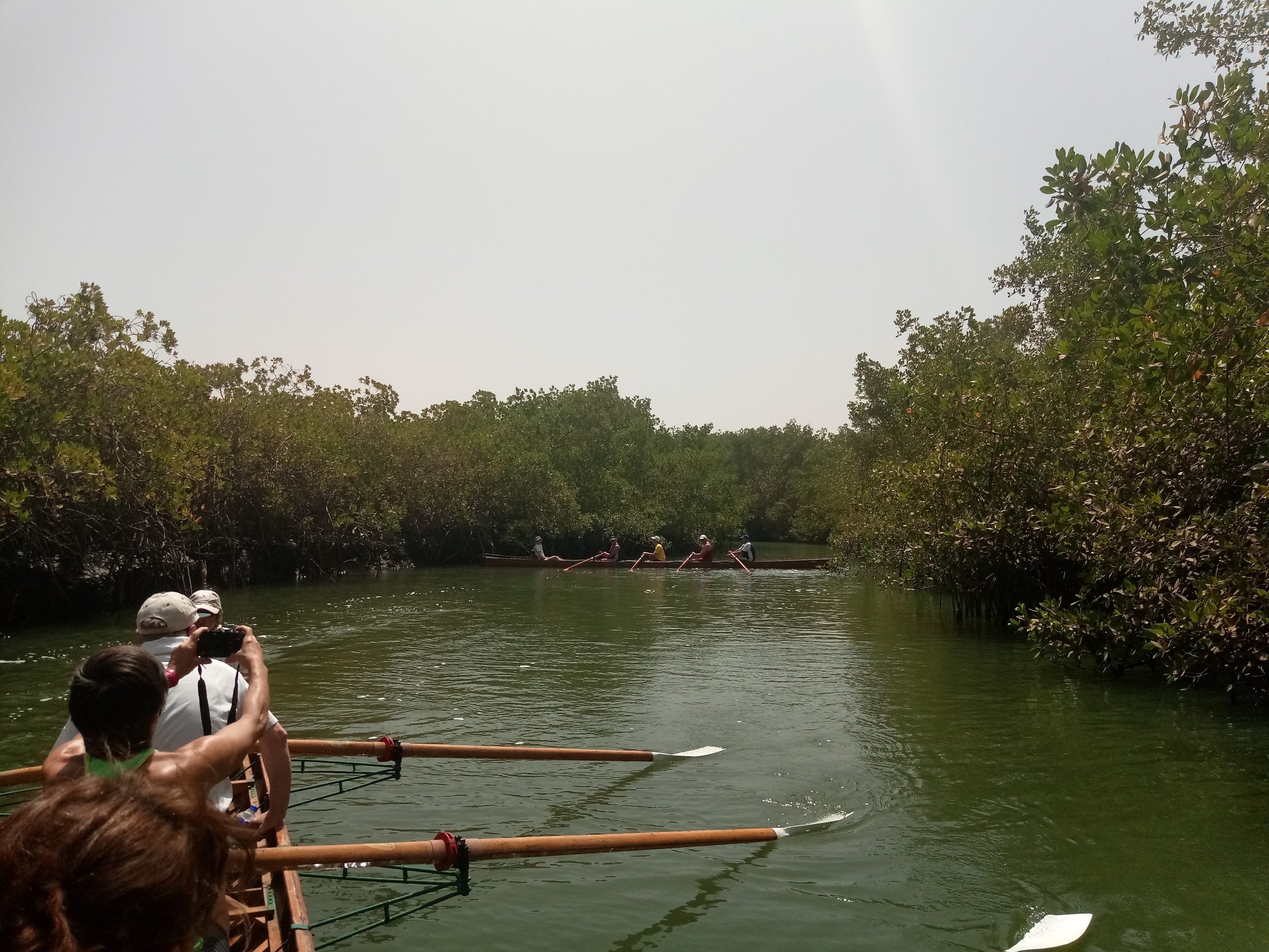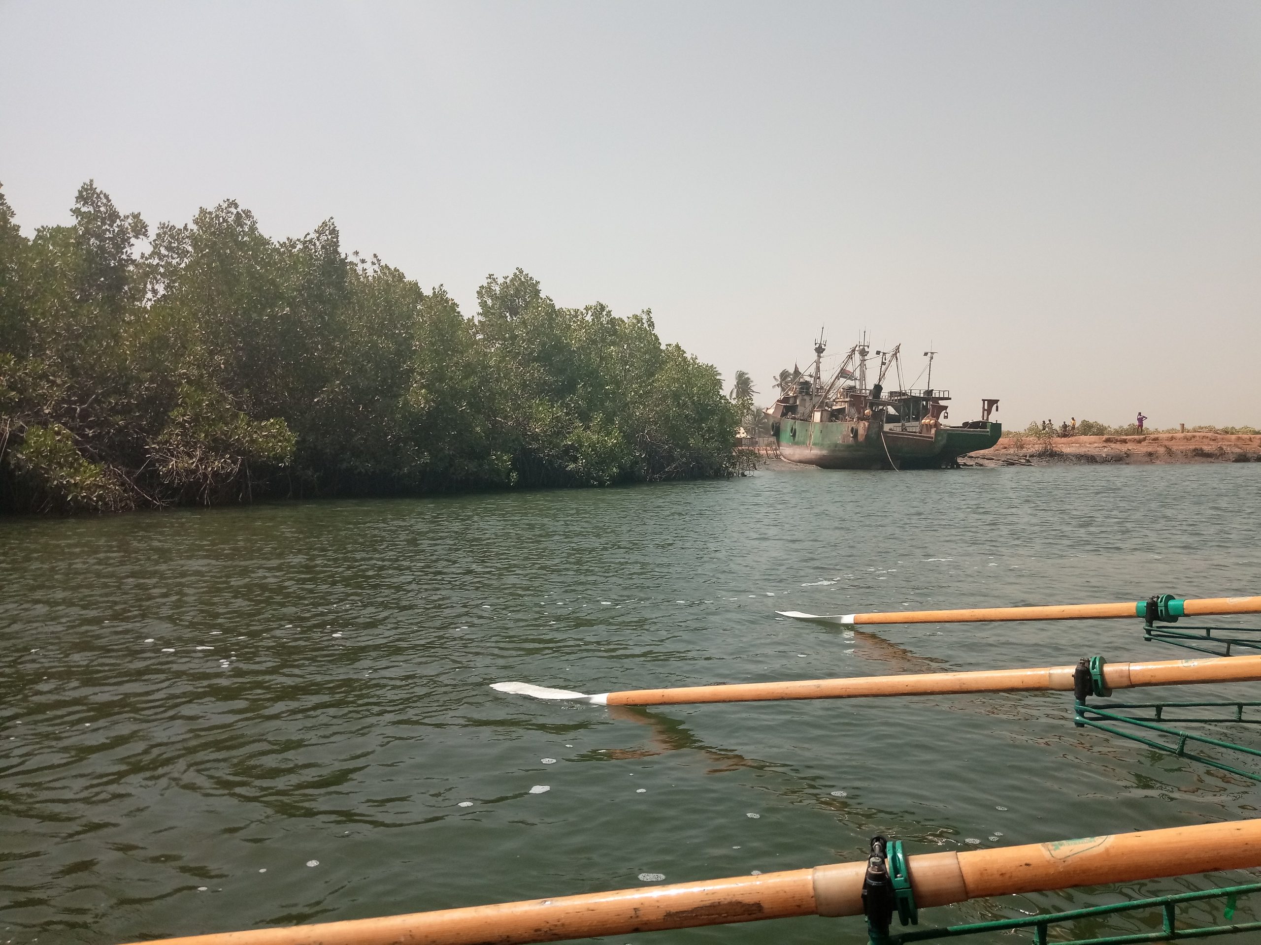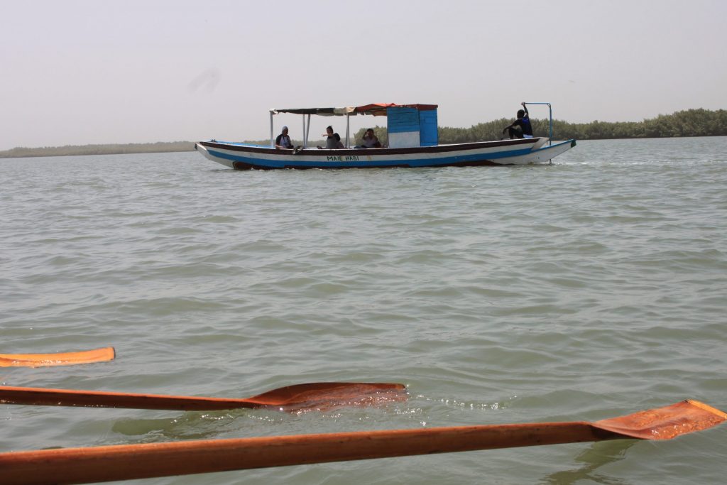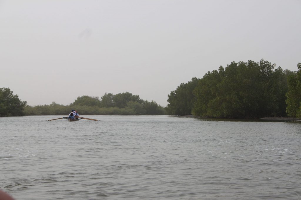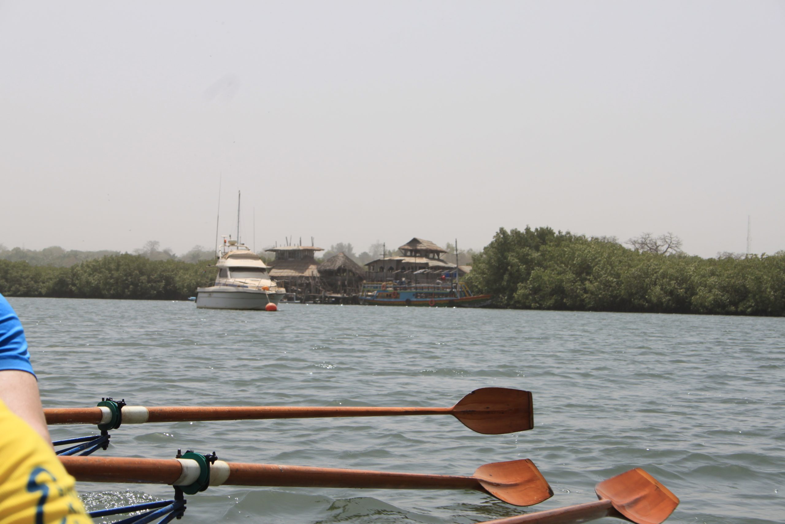 An unserem zweiten Rudertag hat der Harmattan aber nachgelassen und bringt uns weniger Sahara-Sand als am Vortag. Nach einem entspannten Frühstück geht es für uns zur Mündung des Lamin Bolong, einem Nebenarm des Gambia River. In Begleitung eines Motorbootes rudern wir heute zur Lamin Lodge. Am Bug des Begleitbootes steht unsere Fahrtenleiterin Karin und dirigiert uns mit einer Warnweste mal nach Backbord, mal nach Steuerbord.