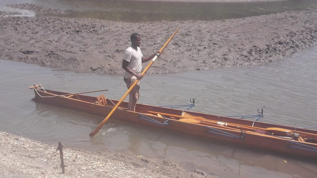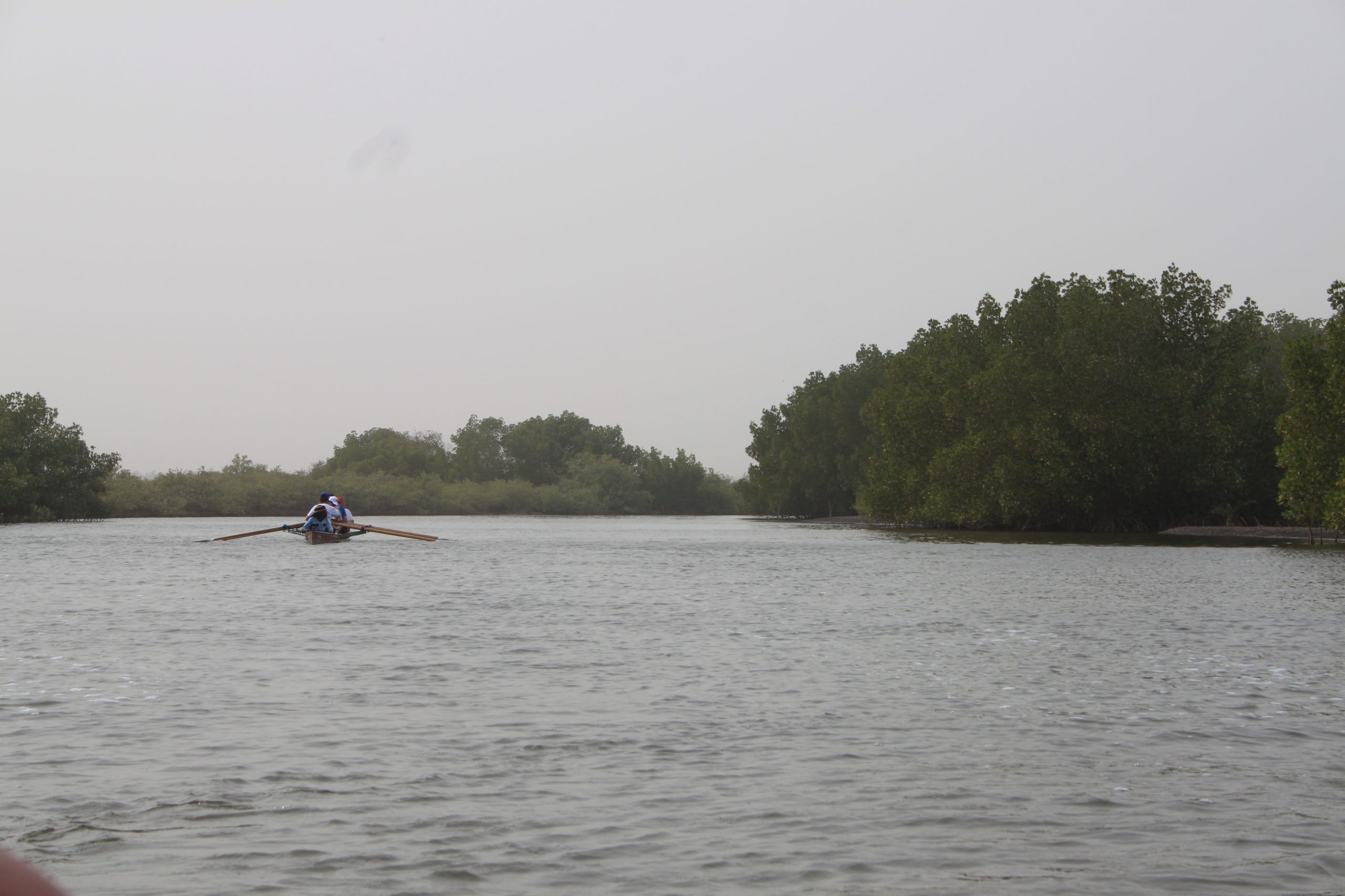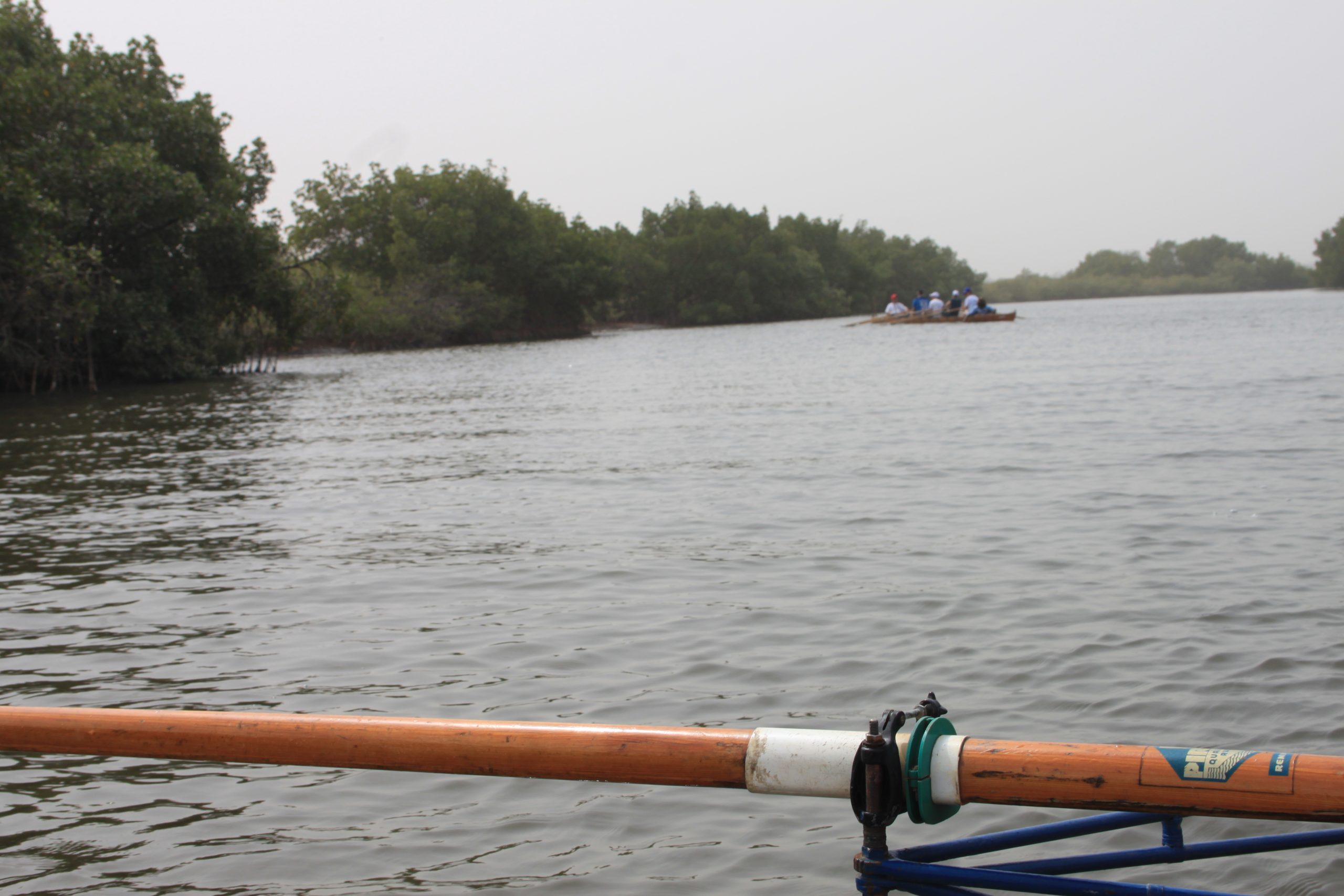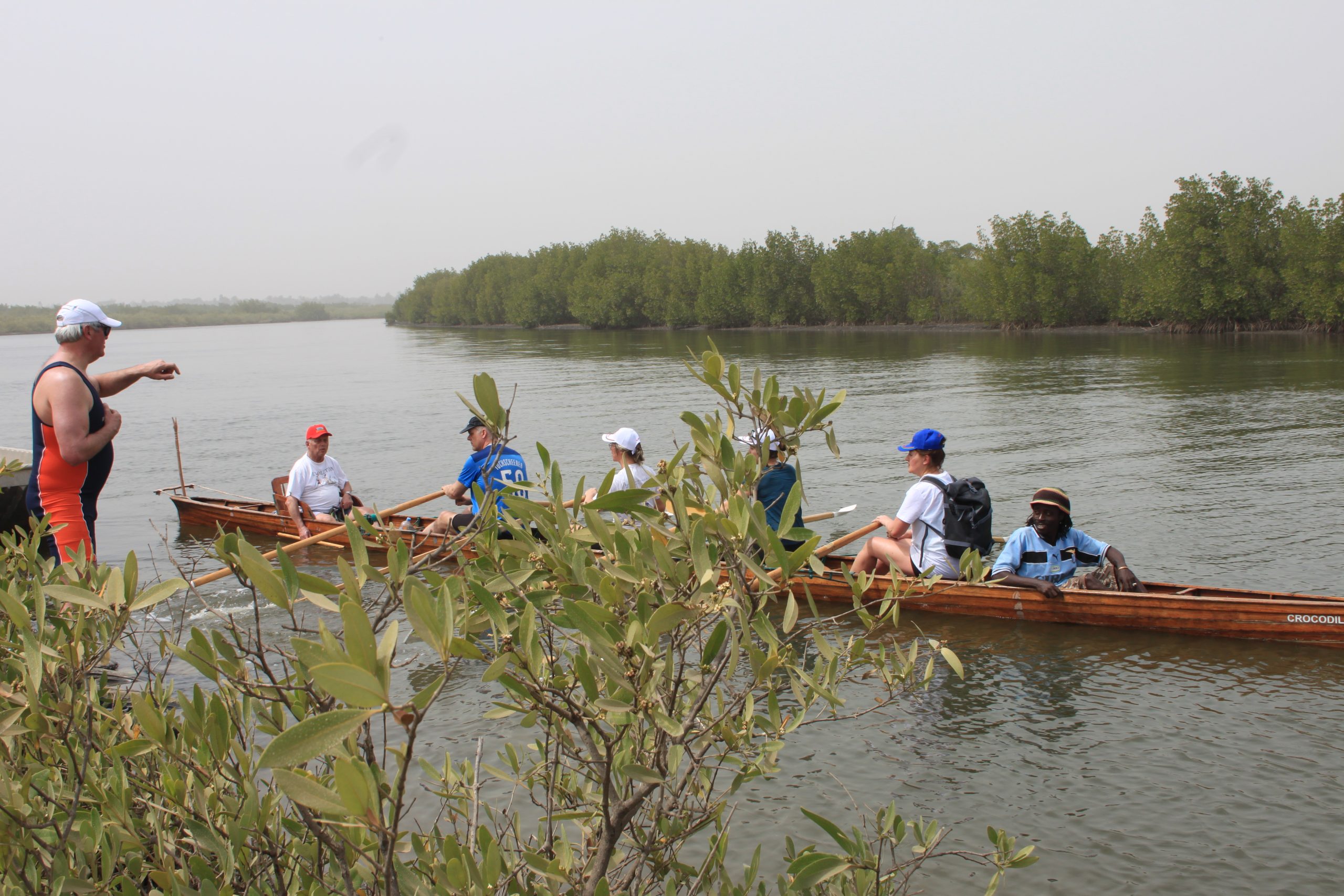 in Gambia – wurden von Deutschland per Container nach Afrika verschickt. Da es natürlich keinerlei Infrastruktur für Ruderer gibt, Boote und Hänger nicht dem besten technischen Standard entsprachen waren die Anfahrten zu den Ruderrevieren und die Rudertouren immer wieder spannend. Mit den Booten Crocodile und Hippo ging es dann aufs Wasser. Zum Glück gibt es an dem küstennahen Teil des Gambia-River und dessen Nebenarmen noch keine Flusspferde und nur kleine Reptilien. Die Ufer sind größtenteils von Mangroven bestanden. Immer wieder ergeben sich Ausblicke auf die Savannen-Landschaft.