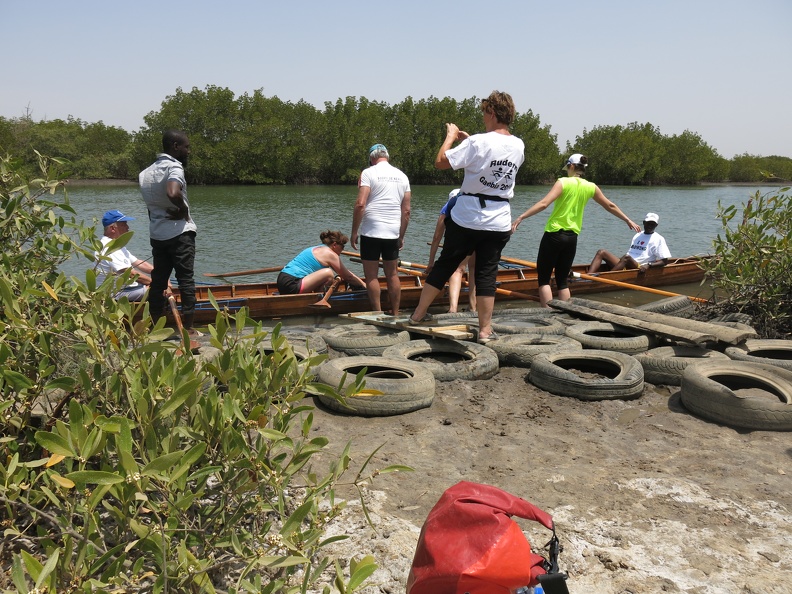 Mit zwei Booten rudern wir unsere ersten Kilometer in Gambia. Der Allahein bildet hier die Grenze zum Senegal. Von Grenzposten bleiben wir unbehelligt. Uns begegnen einige einheimische Fischer und – man glaubt es kaum – auch Kajak- und Kanu-Fahrer sind hier unterwegs. Die Ufer sind größtenteils von Mangroven bestanden. Immer wieder ergeben sich Ausblicke auf die eher karge Savannen-Landschaft. Nach unserer Ausfahrt werden die Boote auf einen vor Ort gefertigten Bootshänger verladen und mitgenommen. Am nächsten Tag wartet schon das nächste Ruderrevier.