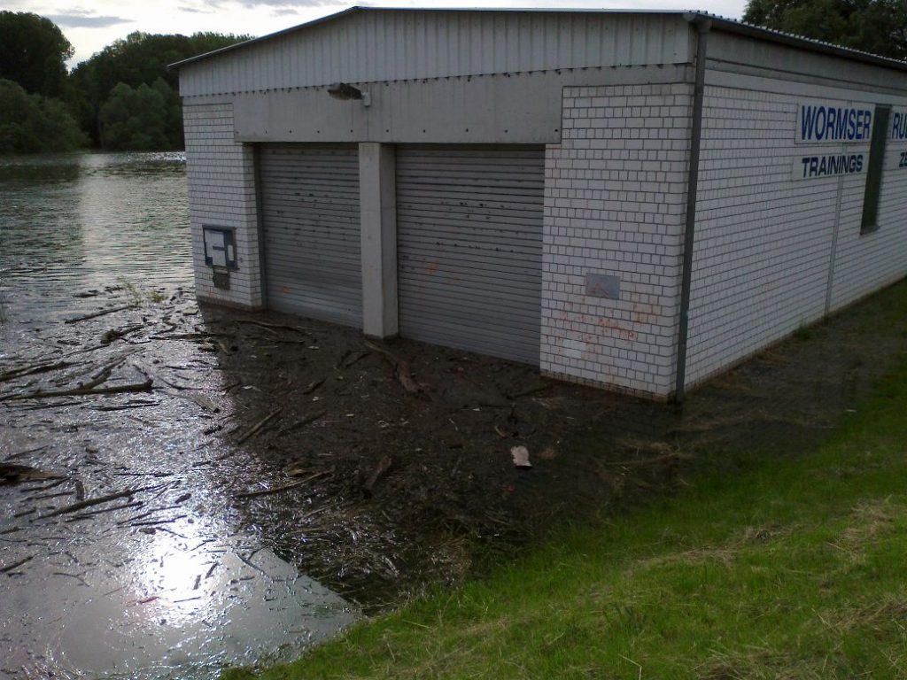 Glück gehabt! Zumindest wenn man über das Bootshaus in Worms und die Halle am See spricht. Es waren wohl außergewöhnlich vorausschauende Ingenieure, Landschaftsgärtner oder auch ganz „normale“ Menschen beteiligt, die die Bootshallen und Bootsplätze gebaut haben! Das Wasser stieg bis an die Tür…und floß dann in Worms rechts zum Boule- und weiter bis zum Festplatz. Bei der Halle am See gleiche Situation: Wasser bis Beginn des Betonweges, dann stürzte das Wasser links auf den Zufahrtsweg und weiter auf das Feld. Dieses war dann so überflutet, dass ich tatsächlich abends dort einen Windsurfer gesehen habe. Leider hatte ich keine Kamera dabei.