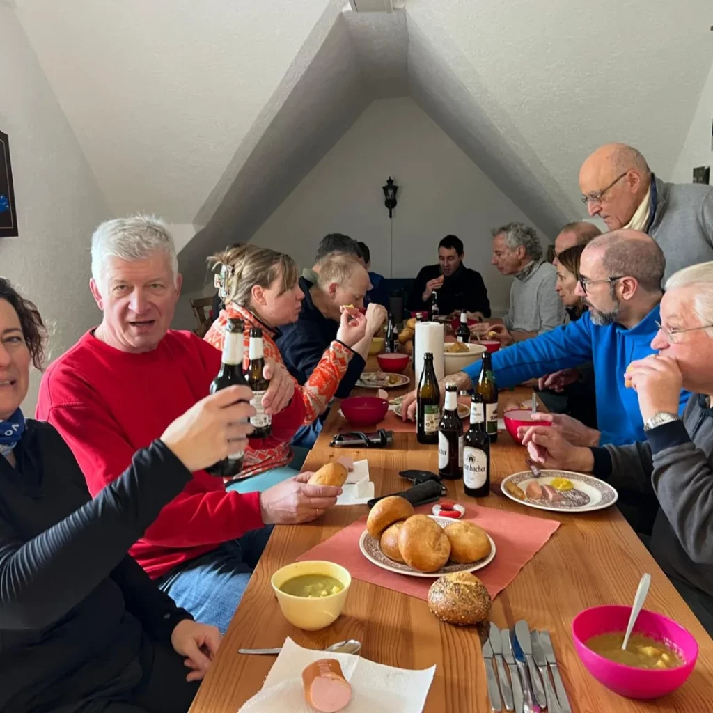 Nach getaner Arbeit gab es zur Stärkung Erbsensuppe, Fleischwurst, Brötchen und für den ein oder anderen auch ein Bier.