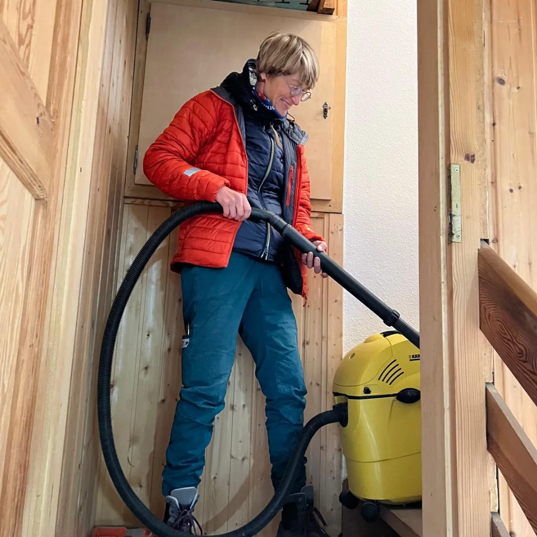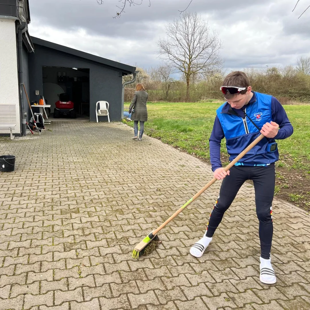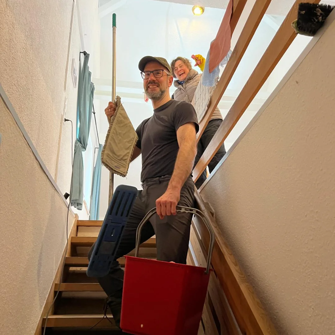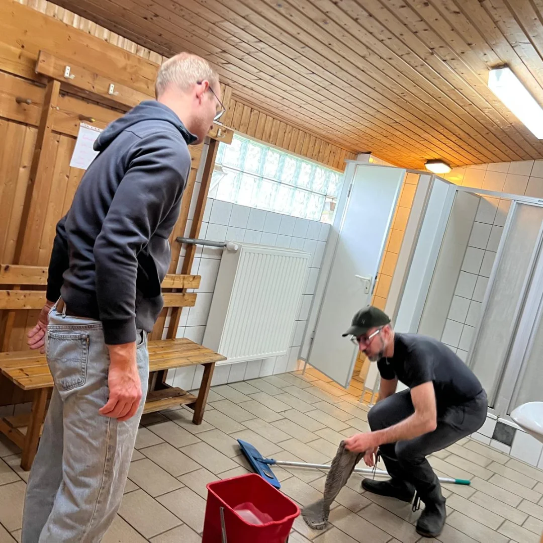 Bewaffnet mit Handschuhen, Eimer, reichlich Putzmittel usw. wurde gebürstet, geklopft, gesaugt. Sogar die Glasscheiben im Kraftraum wurden intensiv gereinigt. Achtung: Jetzt muss man dran denken, dass da Scheiben sind. Man sieht gar nichts mehr!