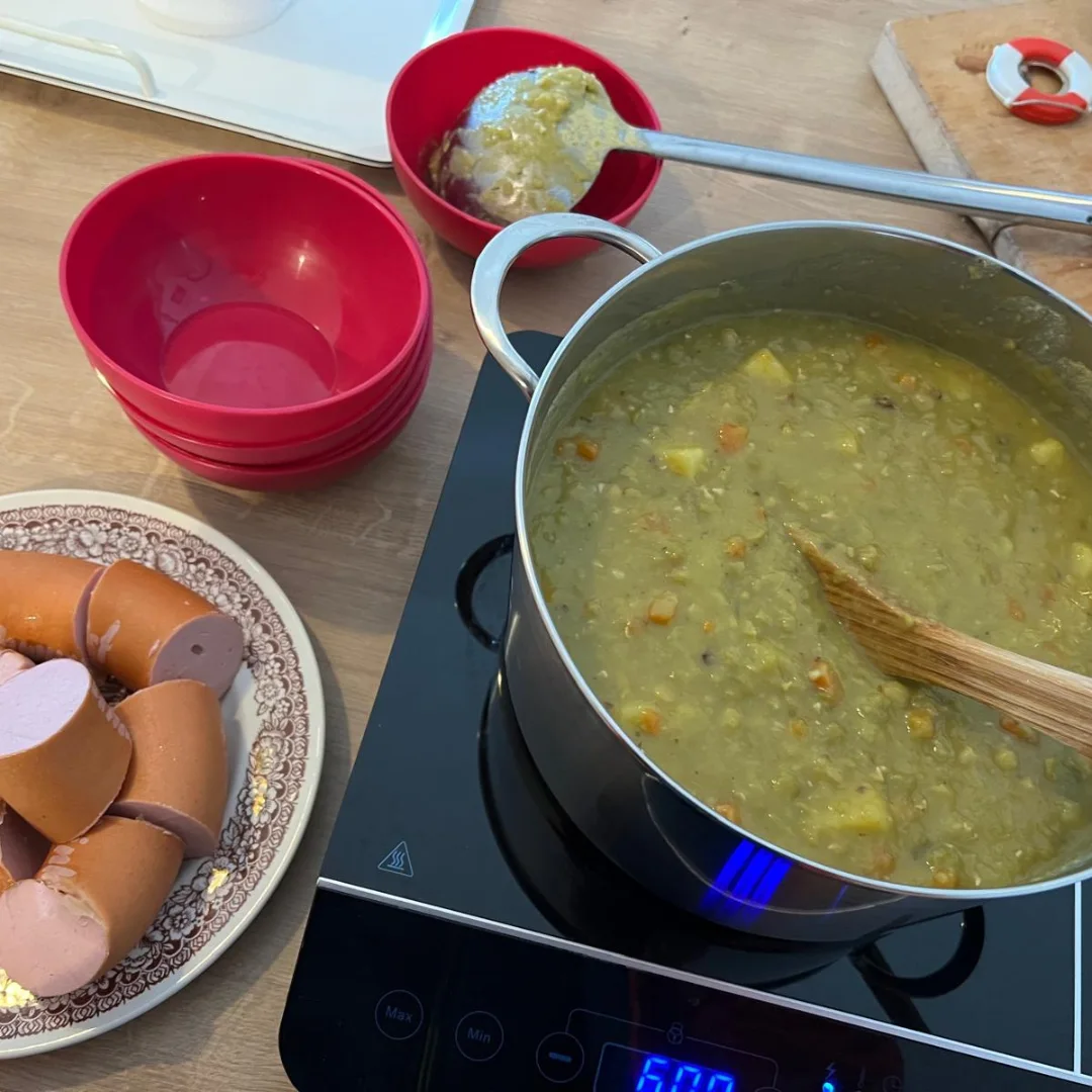 Nach getaner Arbeit gab es zur Stärkung Erbsensuppe, Fleischwurst, Brötchen und für den ein oder anderen auch ein Bier.