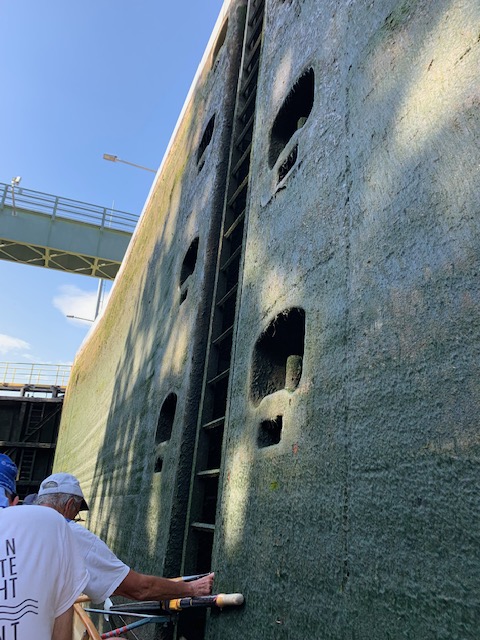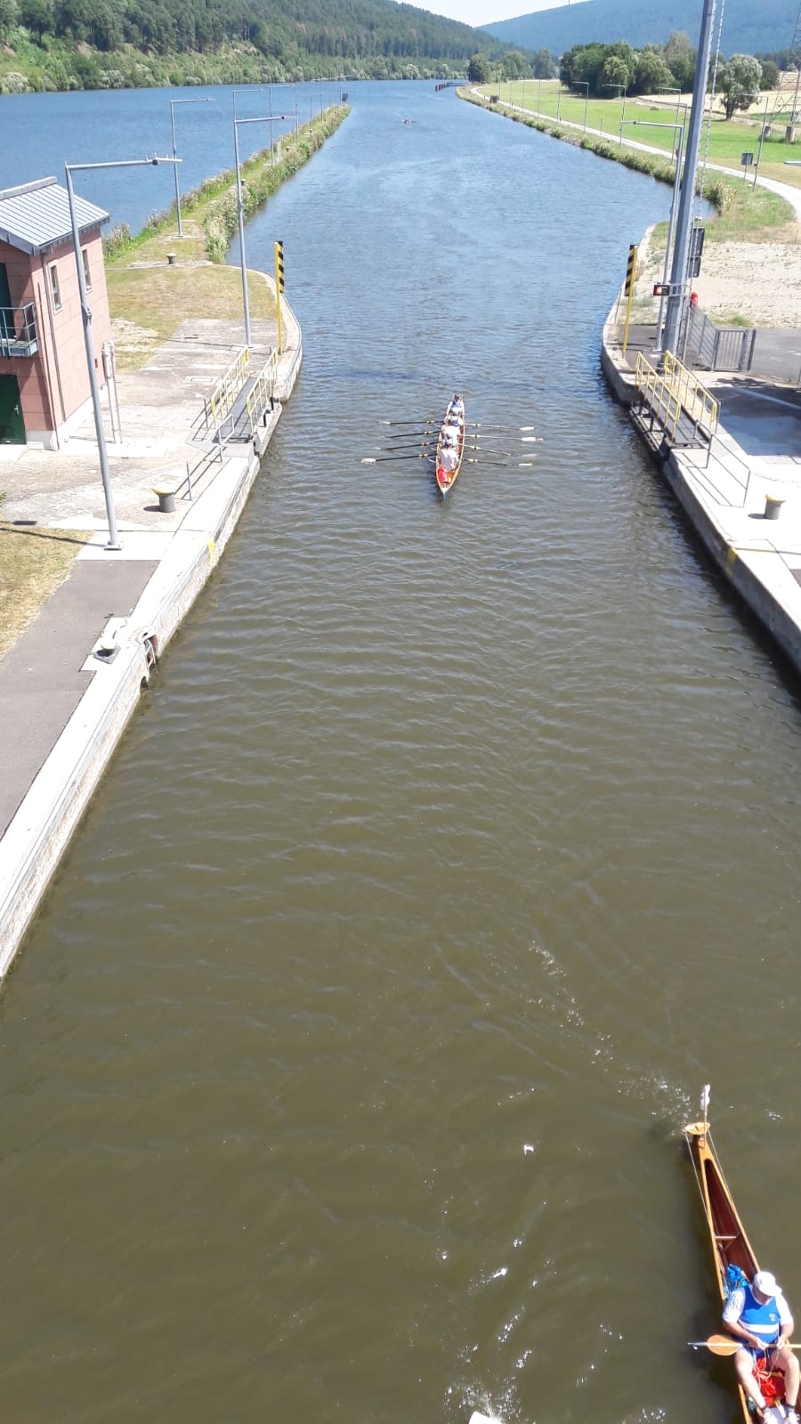 Die Strecke auf dem Main, ca. 43 km, war ein ruhiger Abschnitt, wenig Ausflugsverkehr und wenig Lastverkehr. Wir passierten viele interessante Dörfer und Städte am Ufer: Langenprozelten, die Klosterruine Schönrain, Lohr mit der alten Donaubrücke und Schloss, Erlach mit dem ehemaligen Benediktinerkloster und der Burg Rothenfels. 2 Großschiffahrtsschleusen erleichterten uns am Samstag (Schleuse Steinbach und Rothenfelde) die Überwindung der Höhendifferenzen auf dem Main. Zwischenfall zum Schluß: Ein holländischer Frachter, ein Motorboot und unsere drei Boote fuhren ein und wurden nach unten gelassen. Mit der Ausfahrt haperte es jedoch, weil der Niederländer wohl erst noch Probleme mit der Schleusenaufsicht klären mußte, bevor das Tor geöffnet wurde. In einer gefühlten 3/4 Stunde konnten wir so über zunehmende Rückenschmerzen, bessere Sitzpositionen und sonstige Bedürfnisse nachdenken. Dann ging es endlich wieder raus. Am Sonntag folgte die Schleuse Lengenfurt.
