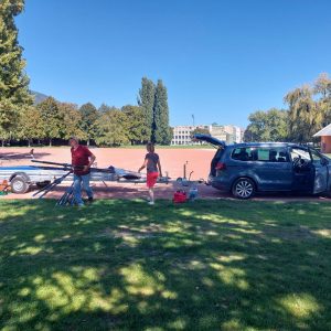 Es ist eben eine Fahrt mit vielen lieb gewonnen Traditionen, die wir manchmal sehr ernst und manchmal (ok, selten) weniger ernst nehmen. Zwei Boote vertraten den WRC in diesem Jahr, ein Doppelfünfer und der (verletzungsbedingt) leicht verjüngte Mastersvierer bei seiner achten Teilnahme. Bei der Anreise gab es die eine oder andere staubedingte Verzögerung, das Bilacmobil jedoch hob pünktlich gegen 9 Uhr in Lampertheim ab und wir eröffneten mal wieder den Reigen der Bootshänger als erste Abordnung auf dem frisch renovierten Seezugangsplatz in Neuchatel. Immerhin waren die Schilder schon aufgehängt! Kurz nach uns traf noch eine Premiere ein: die ersten englischen Teilnehmer der Bilac trafen mit einem etwas altertümlichen Bootshänger ein. Neugierig wie wir sind, erfuhren wir dass sie aus Stockton-on-Tees angereist sind. Dies gelingt mit einer Fährfahrt von Newcastle nach Amsterdam und einer zweitägigen Fahrt durch Frankreich nach Neuchatel. Da erscheint unser Aufwand doch eher wieder bescheiden und wir treten den (nicht existenden) Preis für die weiteste Anreise zur Bilac gerne ab.