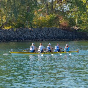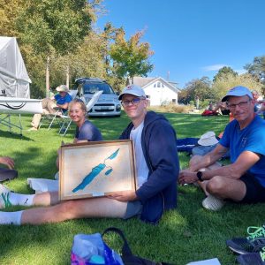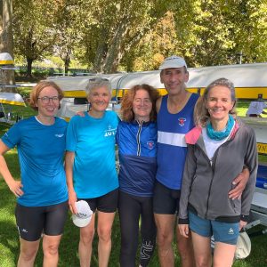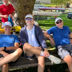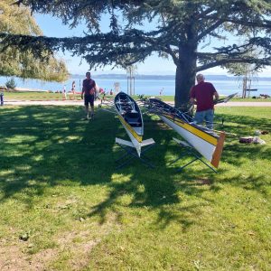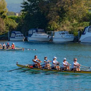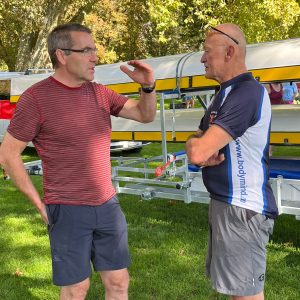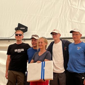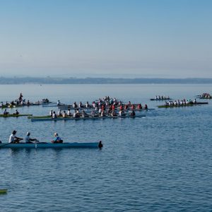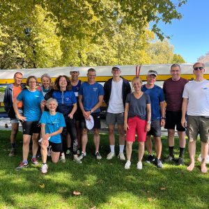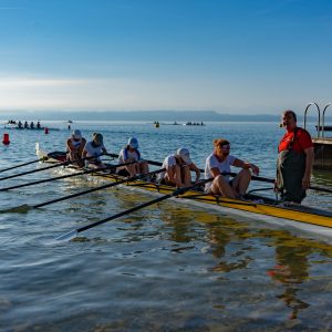 So kämpfen wir uns ins Ziel, das ein bisschen überraschend kommt, da wir die Verkürzung nicht so genau abschätzen konnten. Das war anstrengend, aber ein weiterer Vorteil der Seestrecke sind die vorhandenen Stege und vielen Helfer, die das Auswassern doch sehr erleichtern. Abriggern, Abtrocknen und drohende Unterhopfung bekämpfen heisst es nun. Siegerehrung ist um 14 Uhr. Immer ein bisschen spannend, ob sich nicht doch noch irgendwo ein weiterer Gig Doppelvierer vrobeigemogelt hat, aber es stellt sich heraus: zum sechsten Mal gewinnen wir den Ehrenpreis für den schnellsten 4x+ Gig. Beim sich ähnelnden Ehrenpreis stellt sich die leicht wechselnde Bootsbesatzung als Vorteil heraus – so darf jeder mal einen mitnehmen. Dieses Jahr geht er natürlich an Jonas, der sich dankenswerterweise kurzfristig bereit erklärt hat, mit den alten Männern zu rudern, nach dem Klaus leider verletzungsbedingt absagen musste. Der Doppelfünfer schneidet ebenfalls mit einer sehr guten Zeit und einer sehr guten Platzierung in der vorderen Hälfte des Feldes (113 Boote sind ins Ziel gekommen) ab.