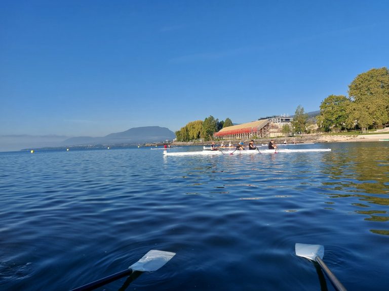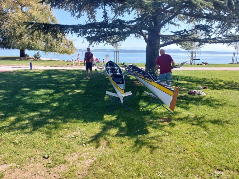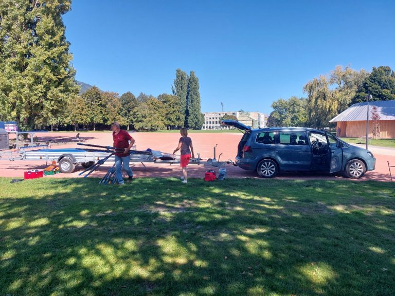 Es ist eben eine Fahrt mit vielen lieb gewonnen Traditionen, die wir manchmal sehr ernst und manchmal (ok, selten) weniger ernst nehmen. Zwei Boote vertraten den WRC in diesem Jahr, ein Doppelfünfer und der (verletzungsbedingt) leicht verjüngte Mastersvierer bei seiner achten Teilnahme. Bei der Anreise gab es die eine oder andere staubedingte Verzögerung, das Bilacmobil jedoch hob pünktlich gegen 9 Uhr in Lampertheim ab und wir eröffneten mal wieder den Reigen der Bootshänger als erste Abordnung auf dem frisch renovierten Seezugangsplatz in Neuchatel. Immerhin waren die Schilder schon aufgehängt! Kurz nach uns traf noch eine Premiere ein: die ersten englischen Teilnehmer der Bilac trafen mit einem etwas altertümlichen Bootshänger ein. Neugierig wie wir sind, erfuhren wir dass sie aus Stockton-on-Tees angereist sind. Dies gelingt mit einer Fährfahrt von Newcastle nach Amsterdam und einer zweitägigen Fahrt durch Frankreich nach Neuchatel. Da erscheint unser Aufwand doch eher wieder bescheiden und wir treten den (nicht existenden) Preis für die weiteste Anreise zur Bilac gerne ab.