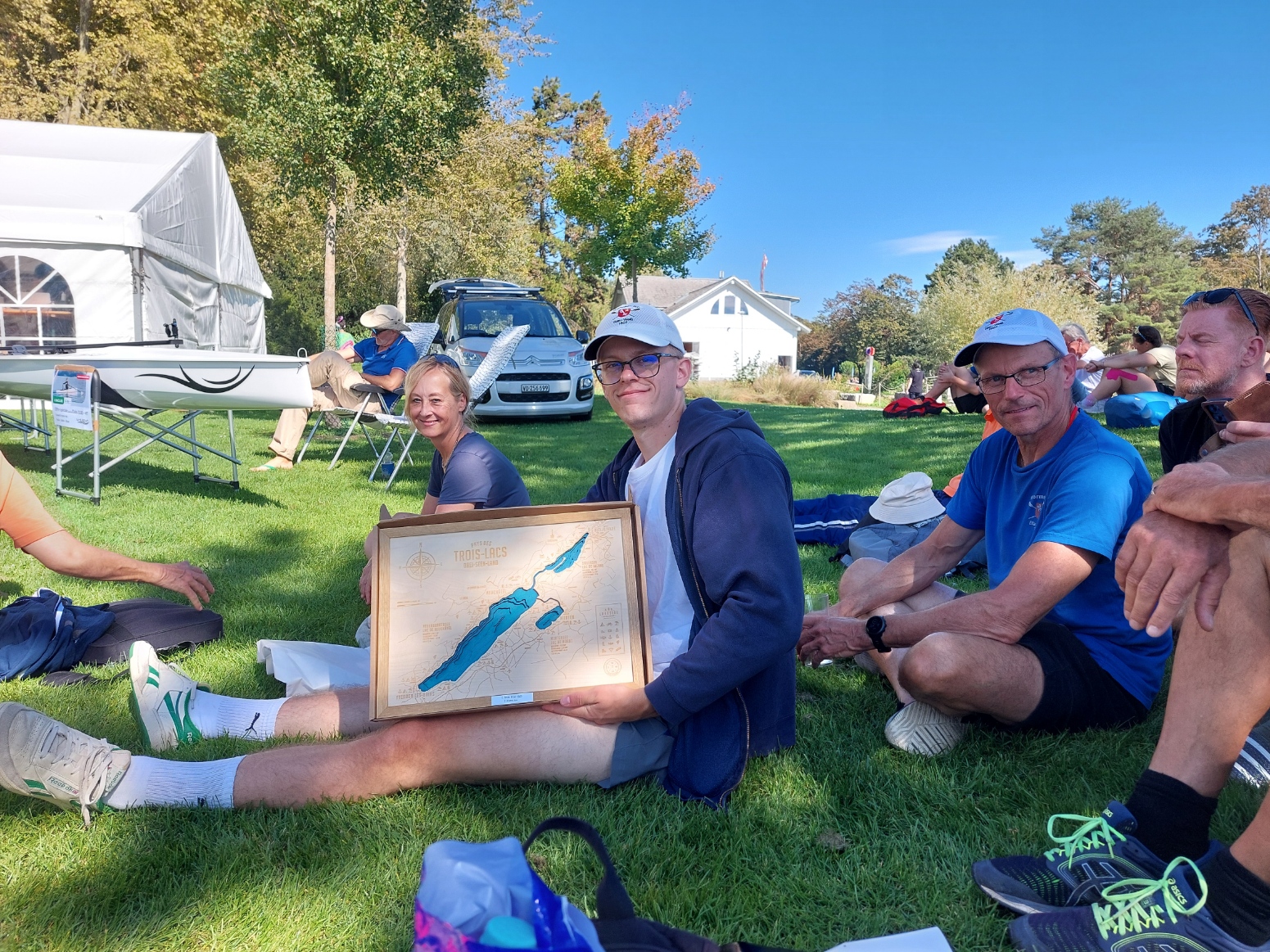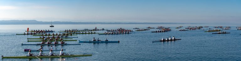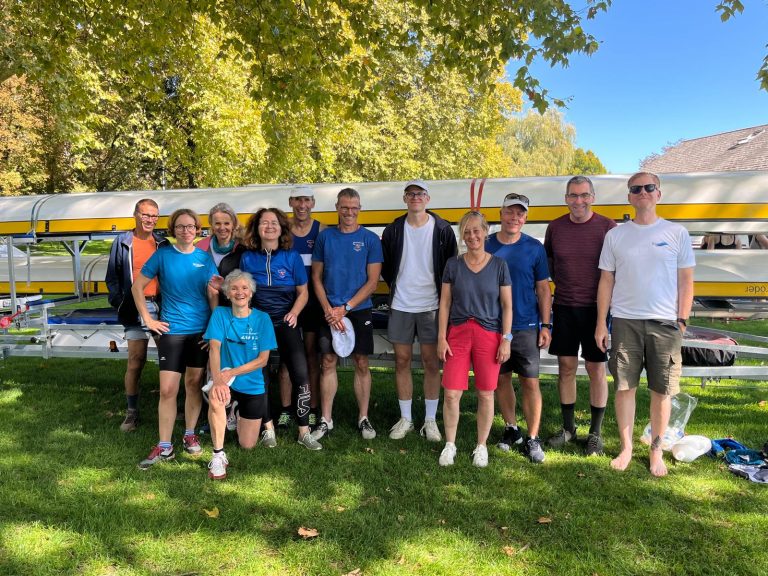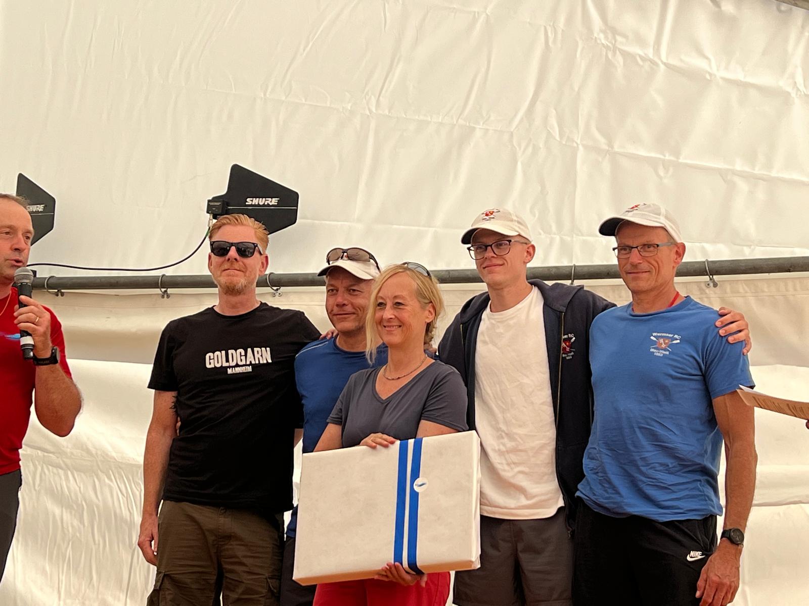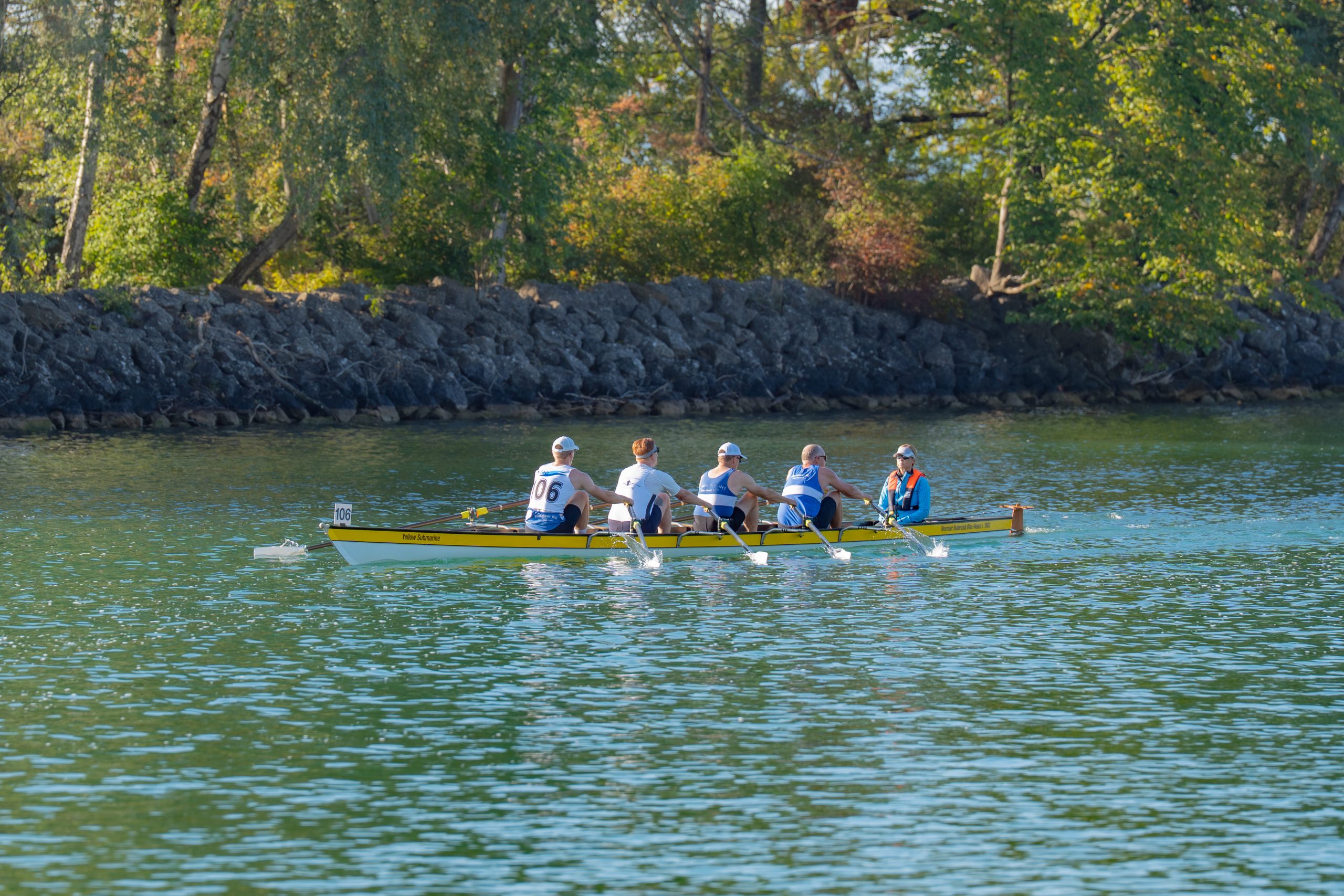 So kämpfen wir uns ins Ziel, das ein bisschen überraschend kommt, da wir die Verkürzung nicht so genau abschätzen konnten. Das war anstrengend, aber ein weiterer Vorteil der Seestrecke sind die vorhandenen Stege und vielen Helfer, die das Auswassern doch sehr erleichtern. Abriggern, Abtrocknen und drohende Unterhopfung bekämpfen heisst es nun. Siegerehrung ist um 14 Uhr. Immer ein bisschen spannend, ob sich nicht doch noch irgendwo ein weiterer Gig Doppelvierer vrobeigemogelt hat, aber es stellt sich heraus: zum sechsten Mal gewinnen wir den Ehrenpreis für den schnellsten 4x+ Gig. Beim sich ähnelnden Ehrenpreis stellt sich die leicht wechselnde Bootsbesatzung als Vorteil heraus – so darf jeder mal einen mitnehmen. Dieses Jahr geht er natürlich an Jonas, der sich dankenswerterweise kurzfristig bereit erklärt hat, mit den alten Männern zu rudern, nach dem Klaus leider verletzungsbedingt absagen musste. Der Doppelfünfer schneidet ebenfalls mit einer sehr guten Zeit und einer sehr guten Platzierung in der vorderen Hälfte des Feldes (113 Boote sind ins Ziel gekommen) ab.
