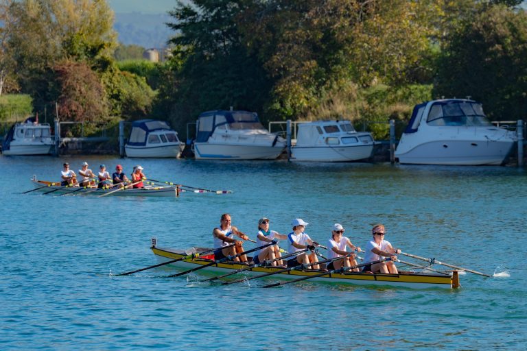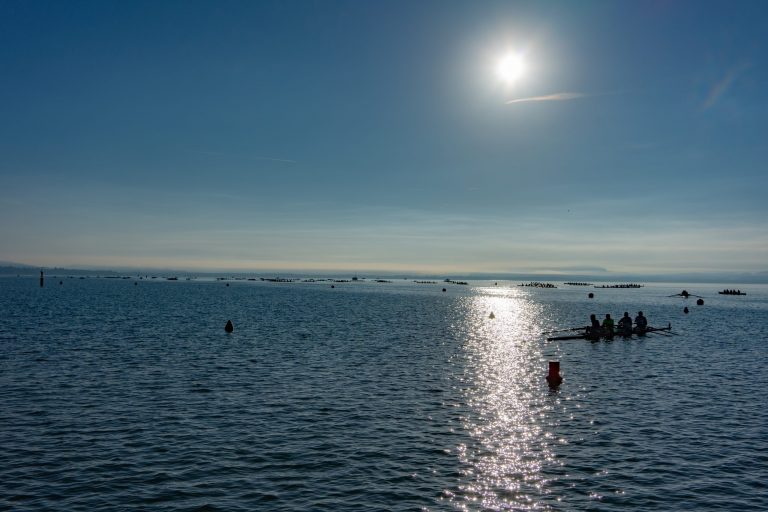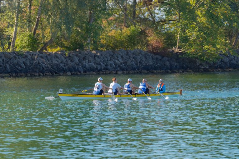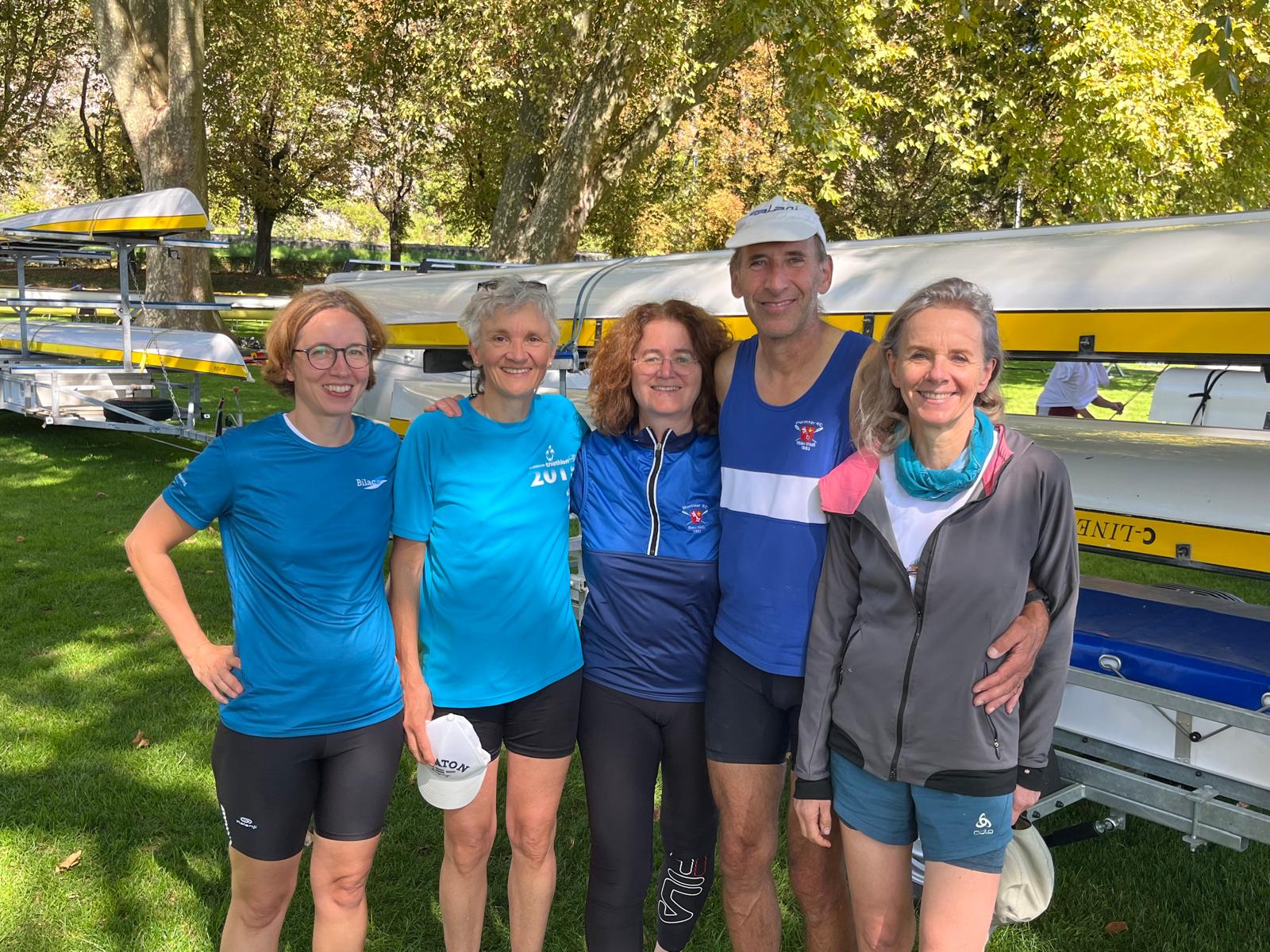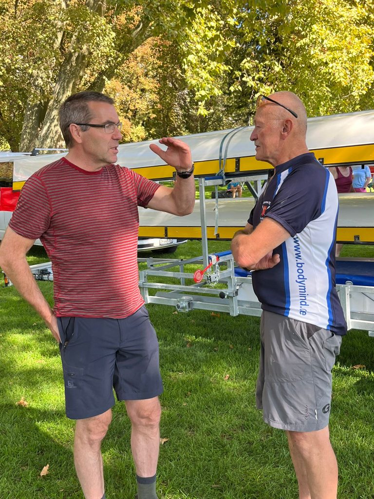 So kämpfen wir uns ins Ziel, das ein bisschen überraschend kommt, da wir die Verkürzung nicht so genau abschätzen konnten. Das war anstrengend, aber ein weiterer Vorteil der Seestrecke sind die vorhandenen Stege und vielen Helfer, die das Auswassern doch sehr erleichtern. Abriggern, Abtrocknen und drohende Unterhopfung bekämpfen heisst es nun. Siegerehrung ist um 14 Uhr. Immer ein bisschen spannend, ob sich nicht doch noch irgendwo ein weiterer Gig Doppelvierer vrobeigemogelt hat, aber es stellt sich heraus: zum sechsten Mal gewinnen wir den Ehrenpreis für den schnellsten 4x+ Gig. Beim sich ähnelnden Ehrenpreis stellt sich die leicht wechselnde Bootsbesatzung als Vorteil heraus – so darf jeder mal einen mitnehmen. Dieses Jahr geht er natürlich an Jonas, der sich dankenswerterweise kurzfristig bereit erklärt hat, mit den alten Männern zu rudern, nach dem Klaus leider verletzungsbedingt absagen musste. Der Doppelfünfer schneidet ebenfalls mit einer sehr guten Zeit und einer sehr guten Platzierung in der vorderen Hälfte des Feldes (113 Boote sind ins Ziel gekommen) ab.