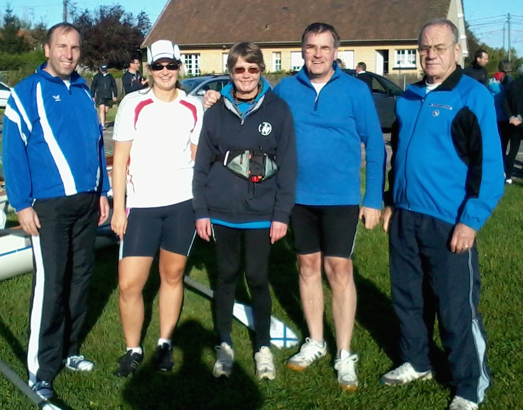 Am Sonntagmorgen machten wir uns wieder auf den Weg zum Bootshaus und wurden von dort nach Houlle gebracht, dem Einsetzpunkt der Boote. Wie in jedem Jahr hatte unser Partnerverein vor Ort schon die Boote ruderbereit gemacht und eine Stärkung für alle Teilnehmer aufgebaut. Da wir zu viert waren, verstärkte uns mit Aurelie eine Graveliner Ruderin als Schlagfrau. Aurelie hat in diesem Jahr bei den französischen Universitäts-Meisterschaften eine Silbermedaille im Doppelvierer gewonnen.