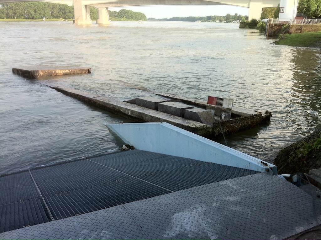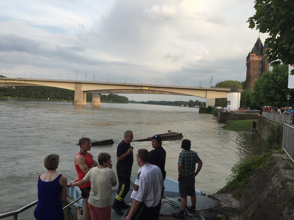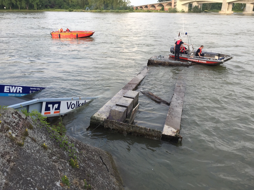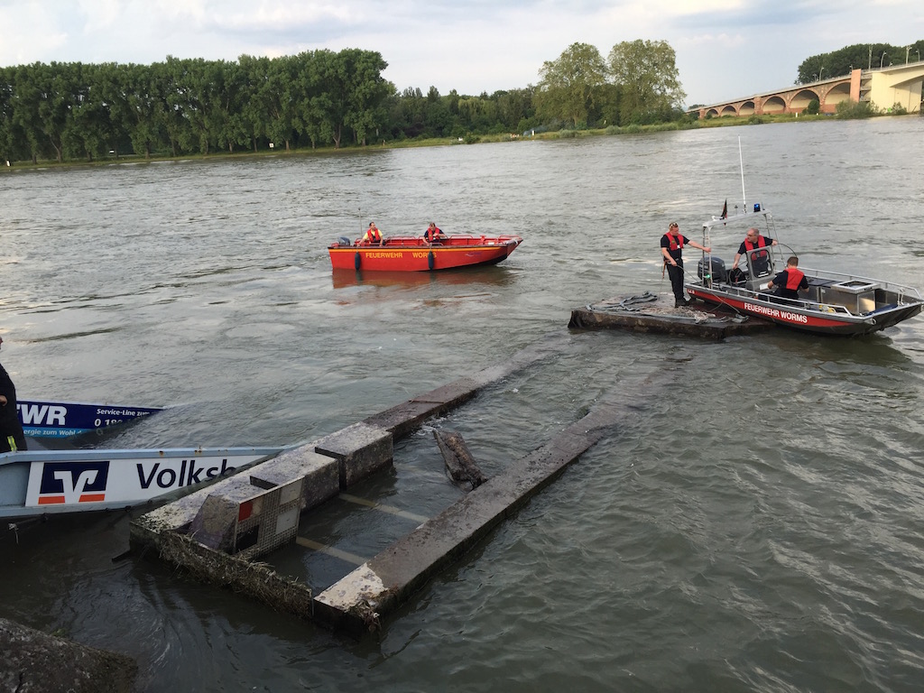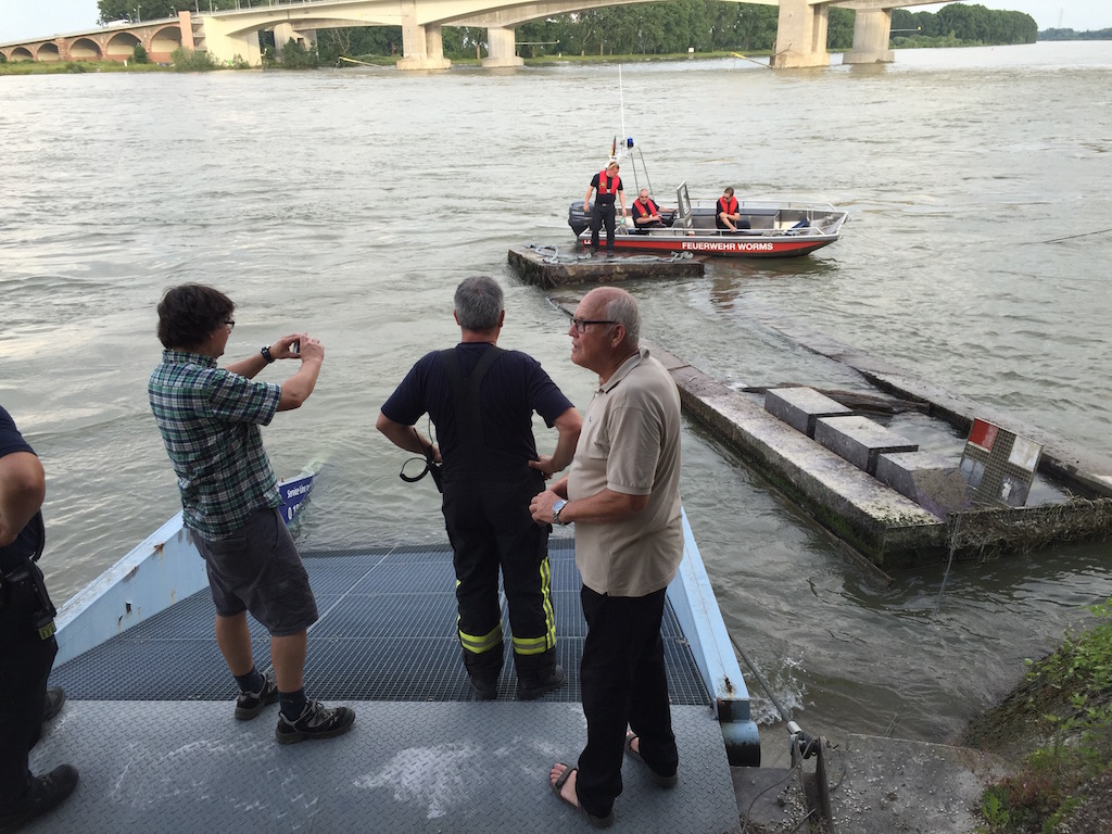 Die große Steganlage des Wormser Ruderclubs Blau-Weiß, in Höhe der Gaststätte Hagenbräu, wurde am Montag, 6.6.16 zwischen 10 Uhr und 15.45 Uhr aus der Verankerung gerissen, um 180 Grad umgedreht und schwer beschädigt. Sie schwimmt jetzt kopfüber im Rhein.