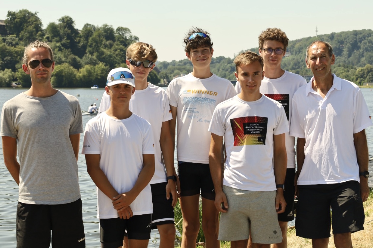 Der Baldeneysee in Essen war Austragungsort der diesjährigen Rudermeisterschaften der Altersklassen 15/16 Jahre, 17/18 Jahre und der 19-22 jährigen. Durch seine guten Saisonergebnisse mit Siegen in Mannheim, Köln und Hamburg ging Lukas Scheuren vom WRC mit Ruderern von Esslingen, Nürtingen, Offenbach, Hanau und Mannheim im Leichtgewichts-Juniorenachter 17/18 Jahre als Mitfavorit an den Start. Im 3-Bootefeld setzte sich die Renngemeinschaft zur Streckenmitte der 2000 Meter an die Spitze, wurde aber von der Renngemeinschaft aus dem Norden mit einem starken Spurt überholt. Ungefährdet wurde die 2. Position gehalten und Lukas Scheuren, der nächstes Jahr noch in der Juniorenklasse starten kann, konnte mit seinen Renngemeinschaftskameraden seinen ersten nationalen Vize-Titel feiern. Die weiteren WRC Starter Lukas Schambach, Noah Heinzel, Moritz Nultsch, Louis Keil und Niko Urbach fuhren gute Vorläufe und Halbfinale, konnten sich für das große Finale aber nicht qualifizieren.