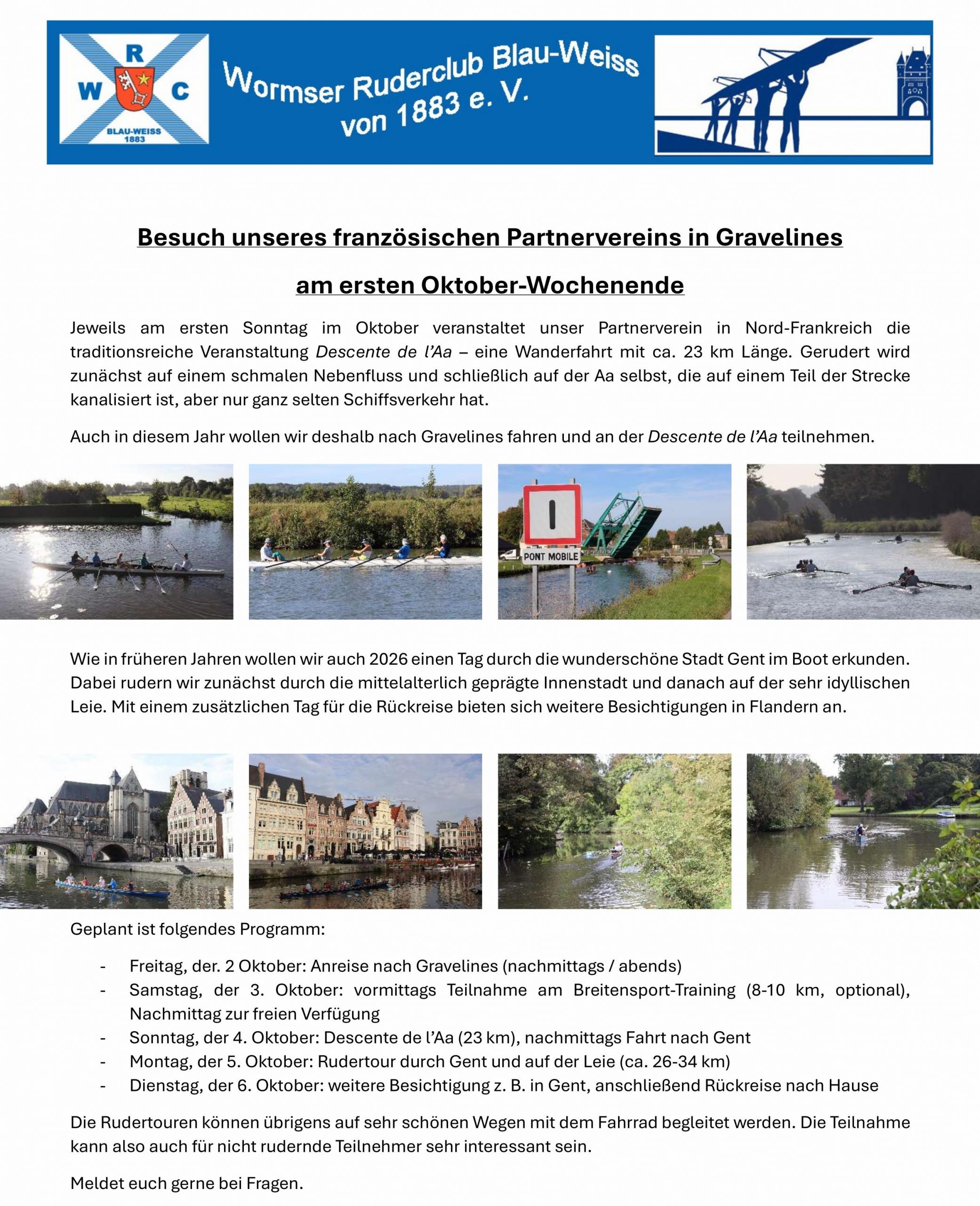 Besuch des Partnervereins – Descente de l’AaStartdatum: 02.10.2026Enddatum: 06.10.2026Ort: Gravelines (Frankreich) und Gent (Belgien)Kontakt: Christian SchmidtAnmeldung erbeten bis 15. Mai an chrschmidt@gmx.eu oder 0179/4113385 (Telefon / WhatsApp)als PDF herunterladen