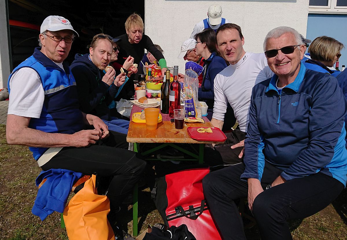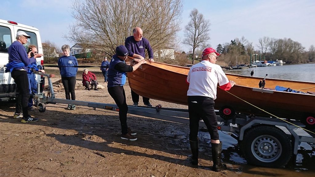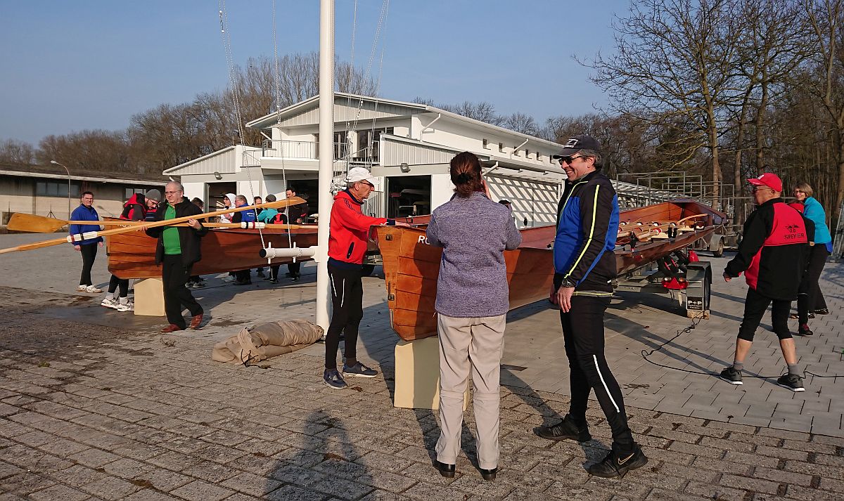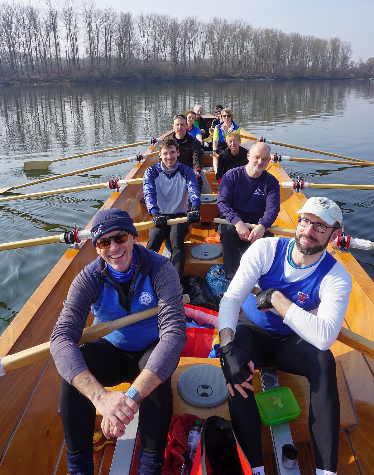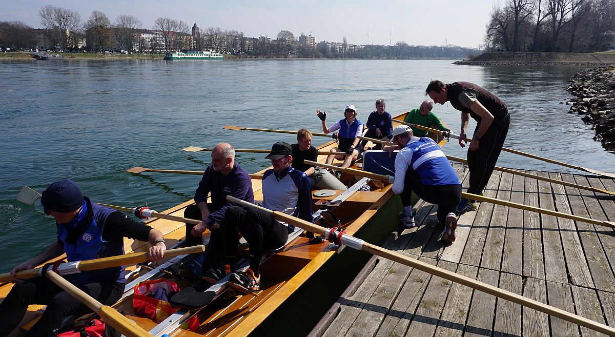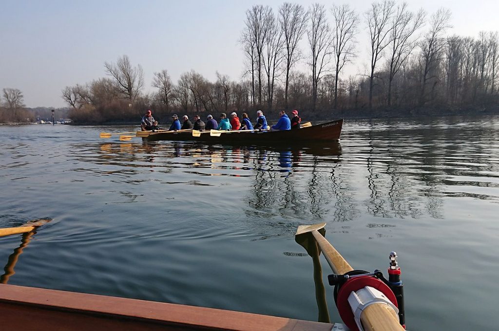 Das Wasser in den Booten, die wir aus ihrem Winterschlaf weckten, war teilweise gefroren. Mit Winde ließen wir die beiden Boote Charlie und Konrad II. zu Wasser. Die kräftige Sonne wärmte uns und bescherte uns einen wunderschönen Rudertag.
