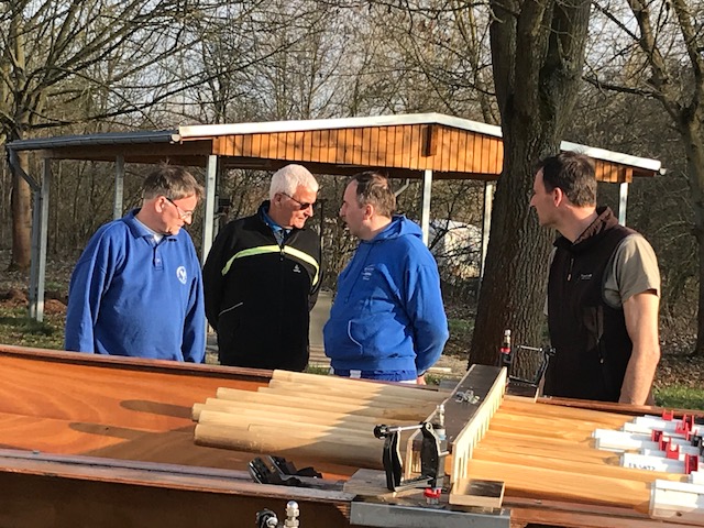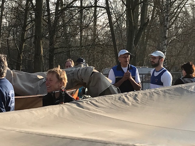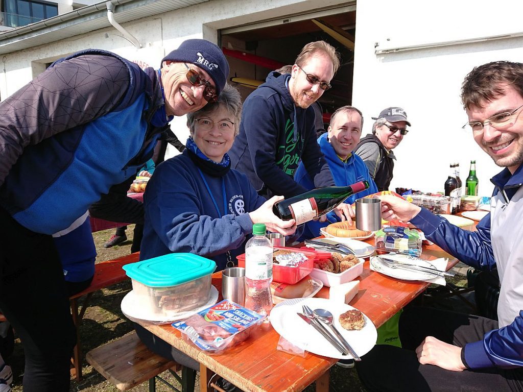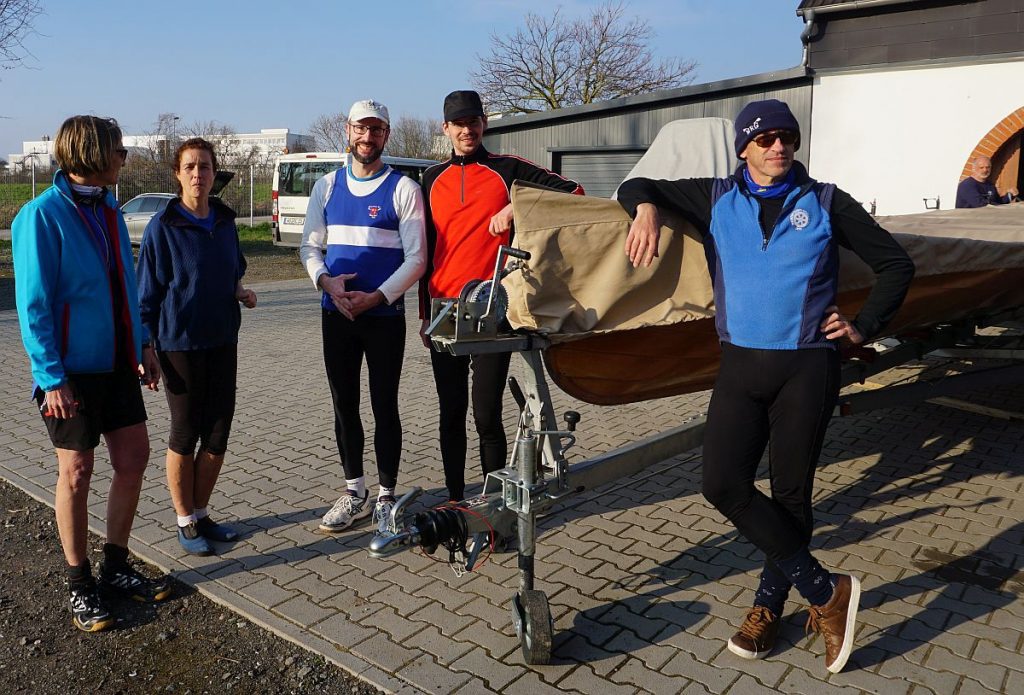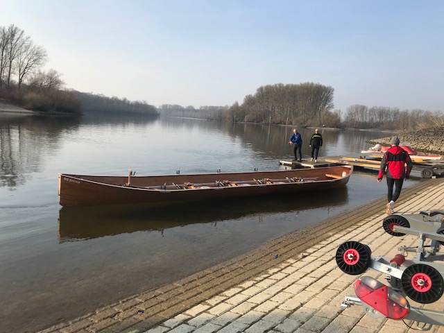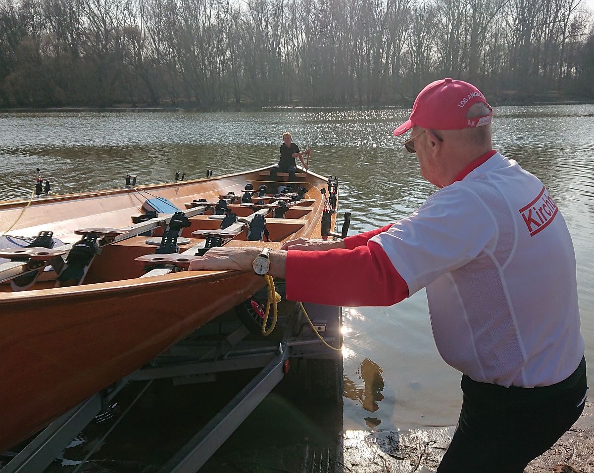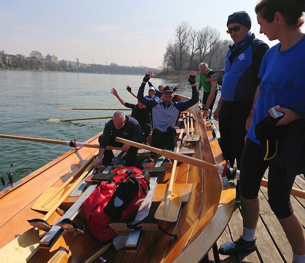 Das Wasser in den Booten, die wir aus ihrem Winterschlaf weckten, war teilweise gefroren. Mit Winde ließen wir die beiden Boote Charlie und Konrad II. zu Wasser. Die kräftige Sonne wärmte uns und bescherte uns einen wunderschönen Rudertag.