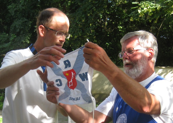 Nach knapp drei Stunden erreichten wir gegen 10 Uhr schließlich Steg und Bootshaus des RC Neptun Darmstadt, dem offiziellen Startpunkt der Wanderfahrt. Außer uns waren Mannschaften des Weisenauer RV, des Mainzer RV und des RV Ingelheim gekommen; insgesamt sollten neun Boote an der Fahrt teilnehmen. Die Vertreter des Wormser RC in ihrem einheitlichen Dress fielen dabei natürlich positiv auf. Mehrfach stellten langjährige Vereinskollegen fest, dass sie das ja seit mindestens 20 Jahren nicht erlebt hätten.