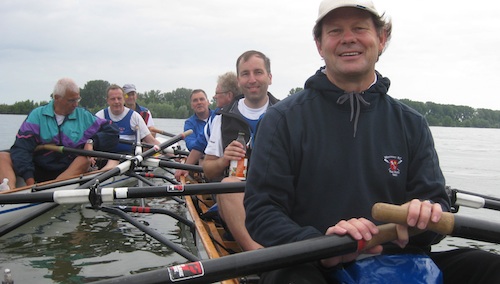 So machten wir uns frühmorgens auf den Weg rheinabwärts. Ein strahlend blauer Himmel versprach schönstes Ruderwetter. Die noch kühle Temperatur – es waren nur etwas mehr als 10° C – und das damit verbundene Tragen von Jacken und Westen verdeckten den Höhepunkt des heutigen Tages: den einheitlichen Dress aller acht Ruderkameraden, die mit dem gesteuerten Vierer Karl Engelbach und dem fußgesteuerten Dreier Heinz Schüssler unterwegs waren.