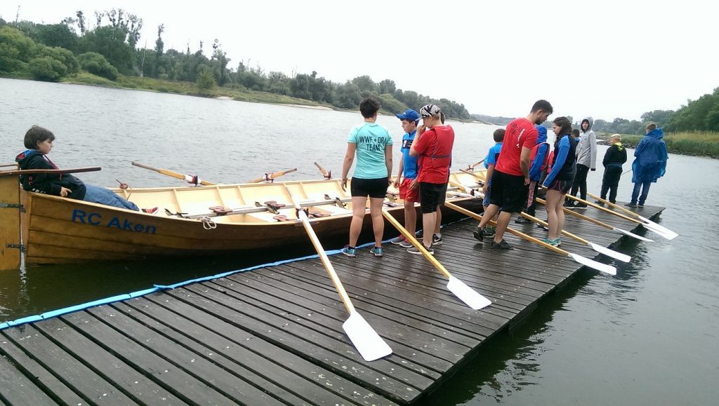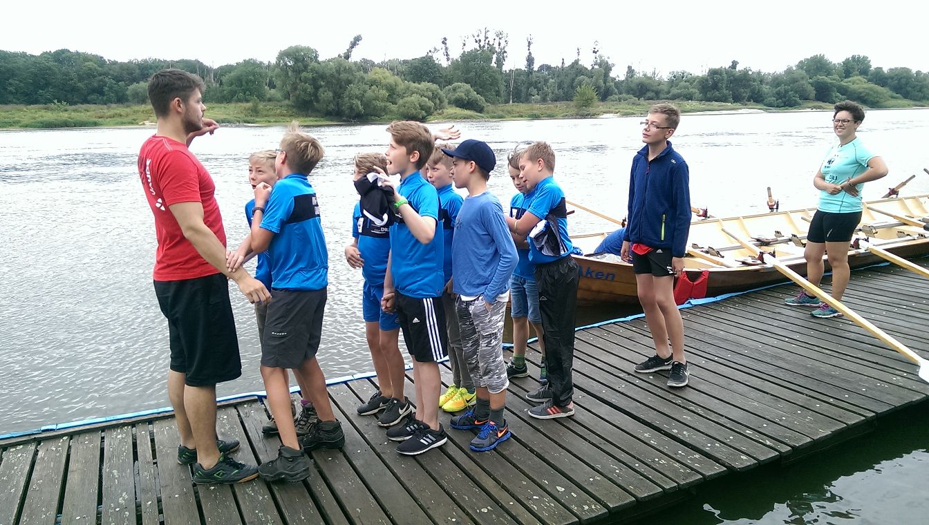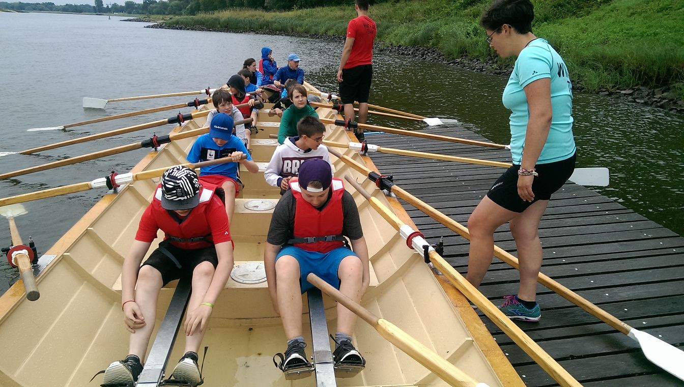 Danach versuchten wir, die Gruppen halbwegs fair einzuteilen. Denn alle wollten sofort in die Boote; die Neugierde war groß. Wir Ruderer mussten allerdings unsere Pläne ändern, als das Wetter uns einen dicken Strich durch die Rechnung machte. Rudern auf der Mulde war aus sicherheitstechnischen Gründen bei starkem Wind nicht möglich, sodass wir im Hafen ruderten. Das war auch für die Kids schon aufregend genug und brachte sehr viel Freude.