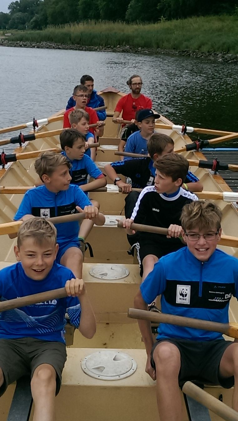 stand im Vordergrund und bei heftigen Winden, Regen und inzwischen fließendem Gewässer (Elbe) war die Aufteilung immer: 1 erfahrener Trainer + 1 Betreuer (Erwachsener) und jeweils 1 Kind mit mehr oder weniger Rudererfahrung, sodass lediglich 2 völlig unerfahrene Kinder in einem 4+ saßen.