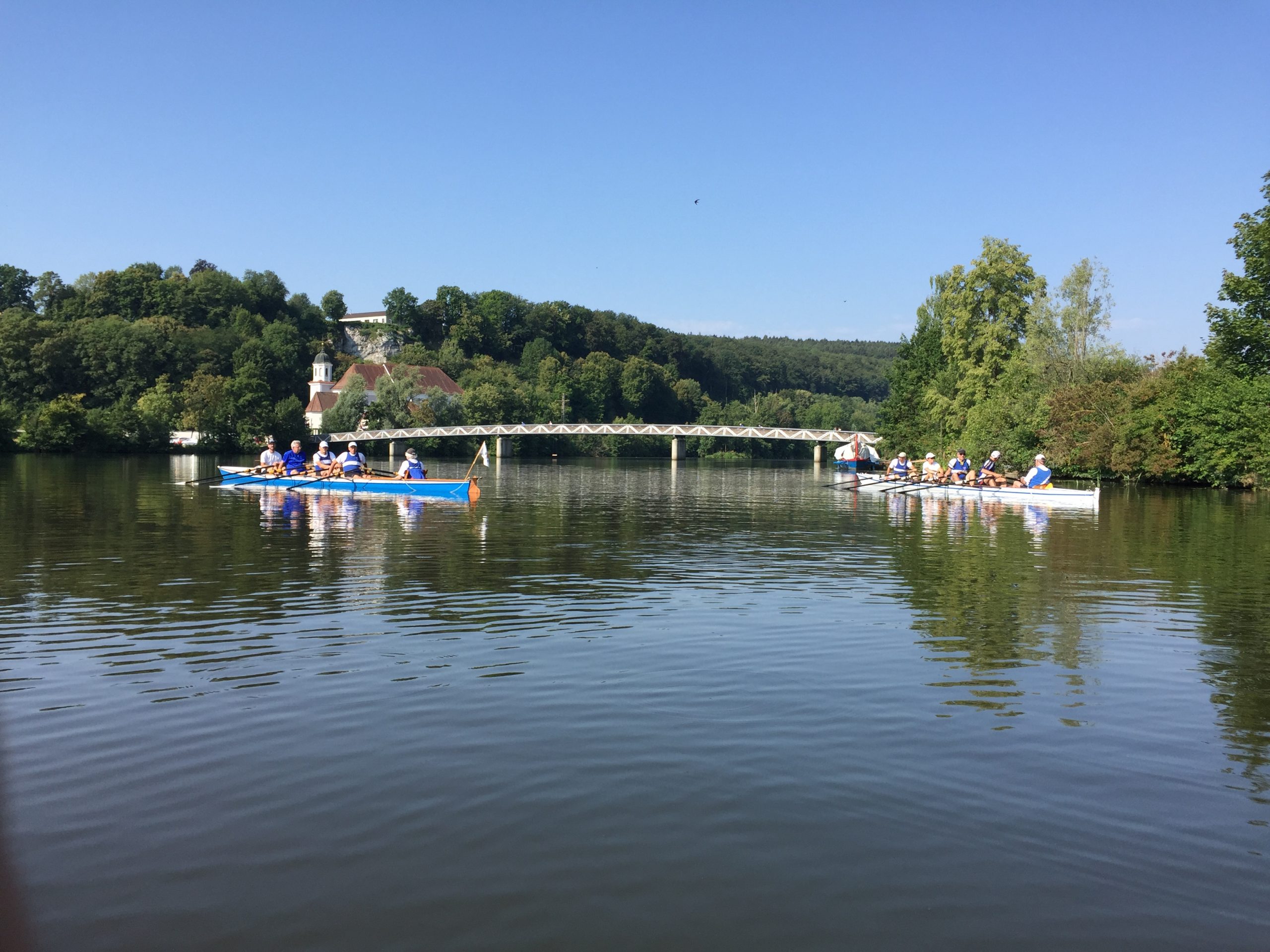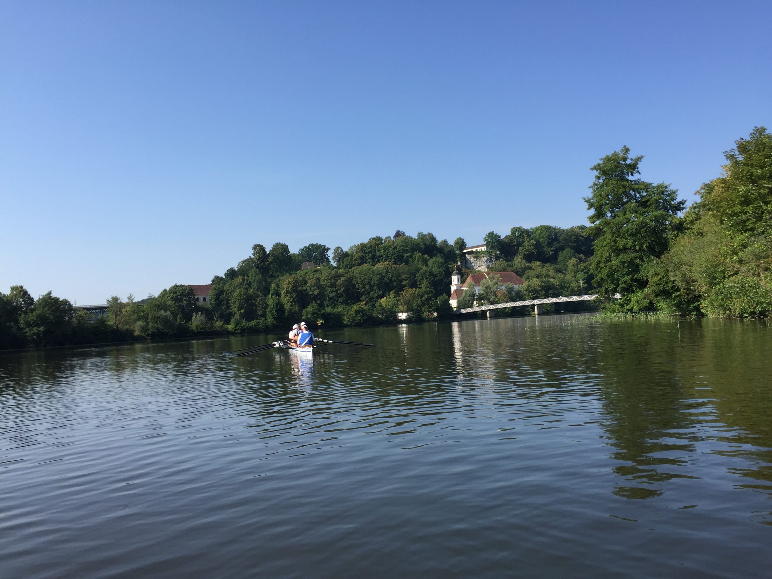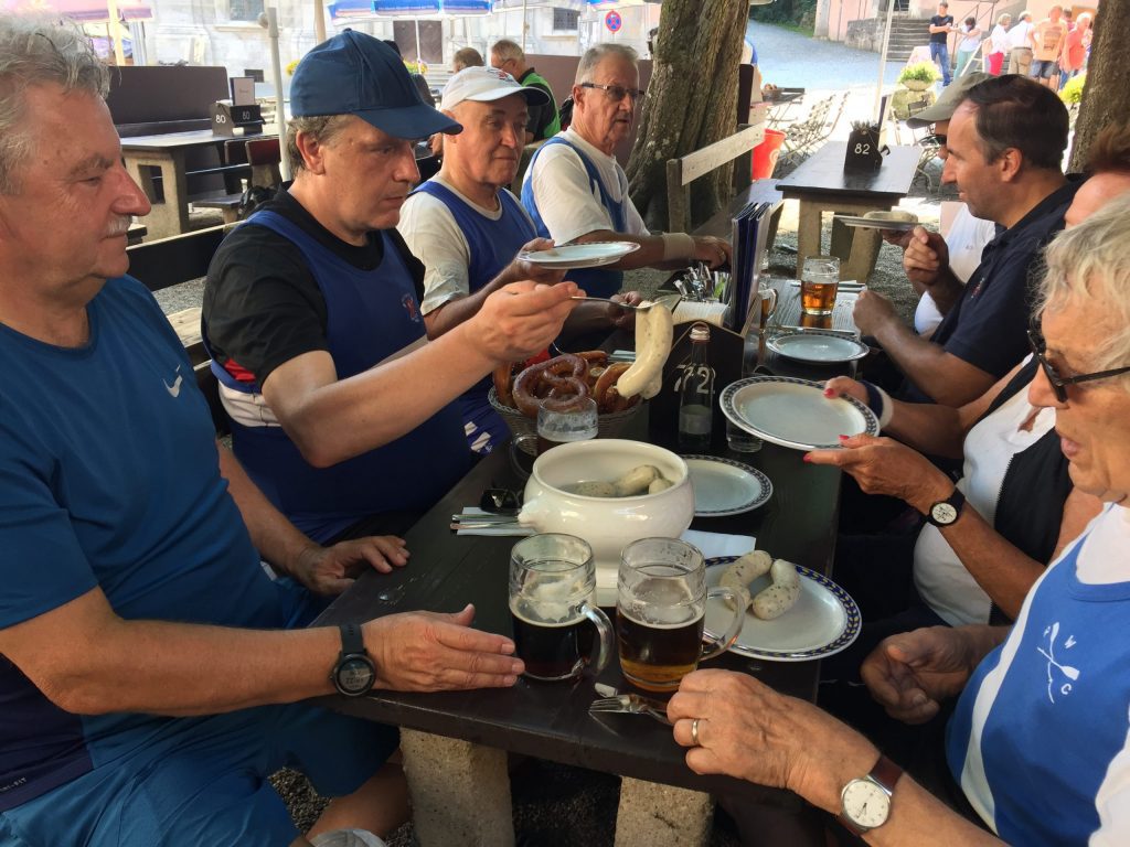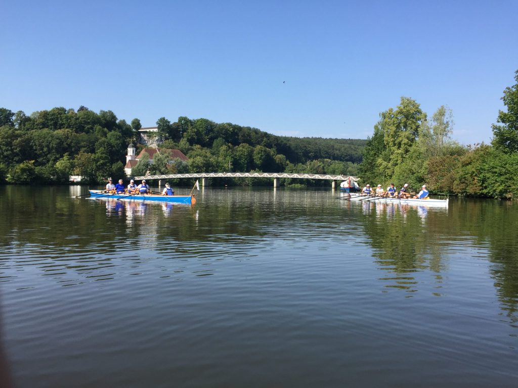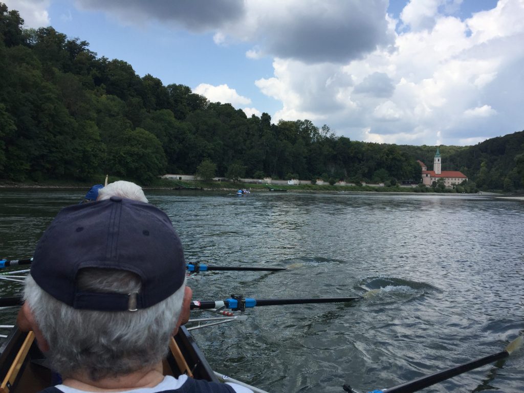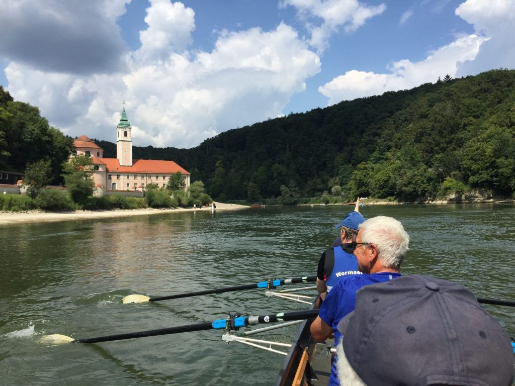 Die Wochenend-Wanderfahrt des Wormser RC Blau-Weiß 1883 ging in diesem Jahr mal wieder in die Gegend von Regensburg. Landschaftlicher Höhepunkt war der Donaudurchbruch, durch den wir gleich hinter Kloster Weltenburg ruderten. Zuvor legten wir jedoch am Kloster an, denn dort warteten im Garten der angeblich ältesten Klosterbrauerei der Welt nicht nur „Weißwurst mit Brezn“ als zweites Frühstück auf uns Ruderer.