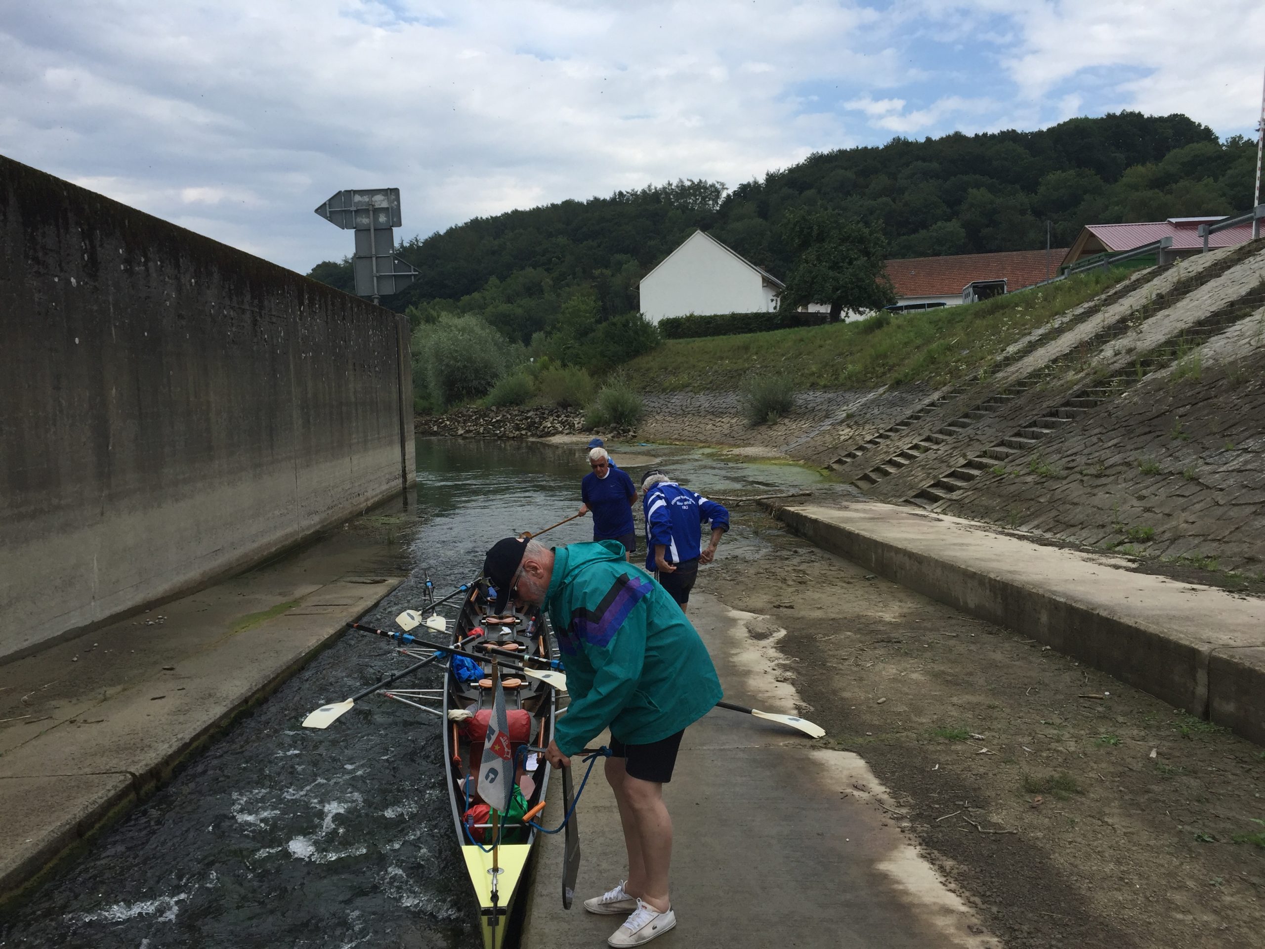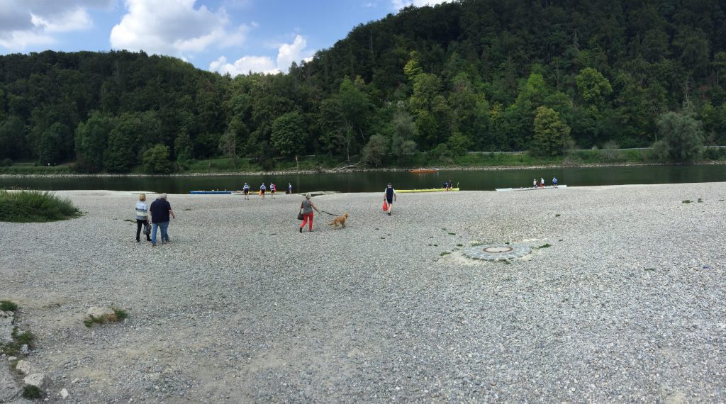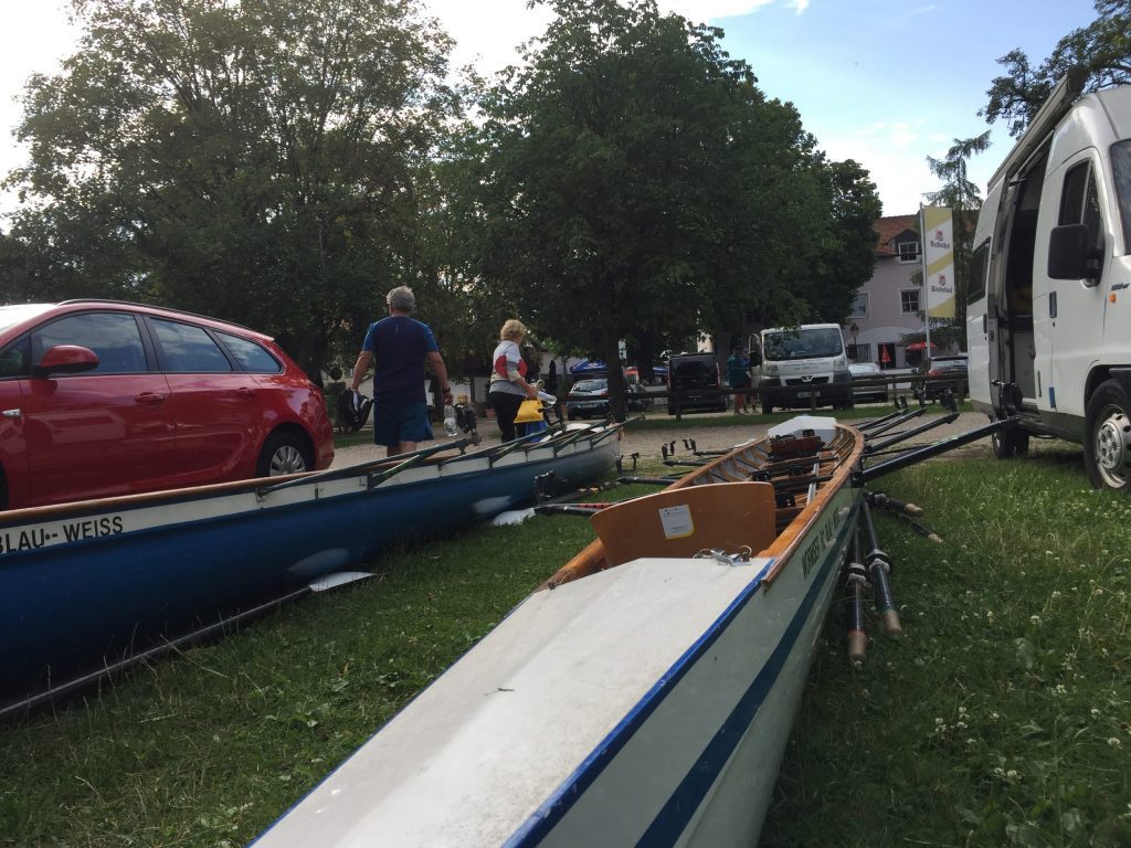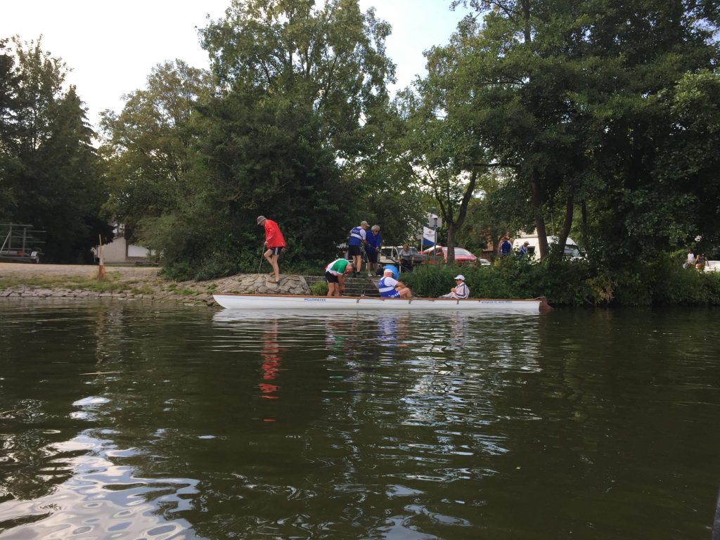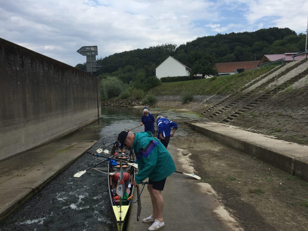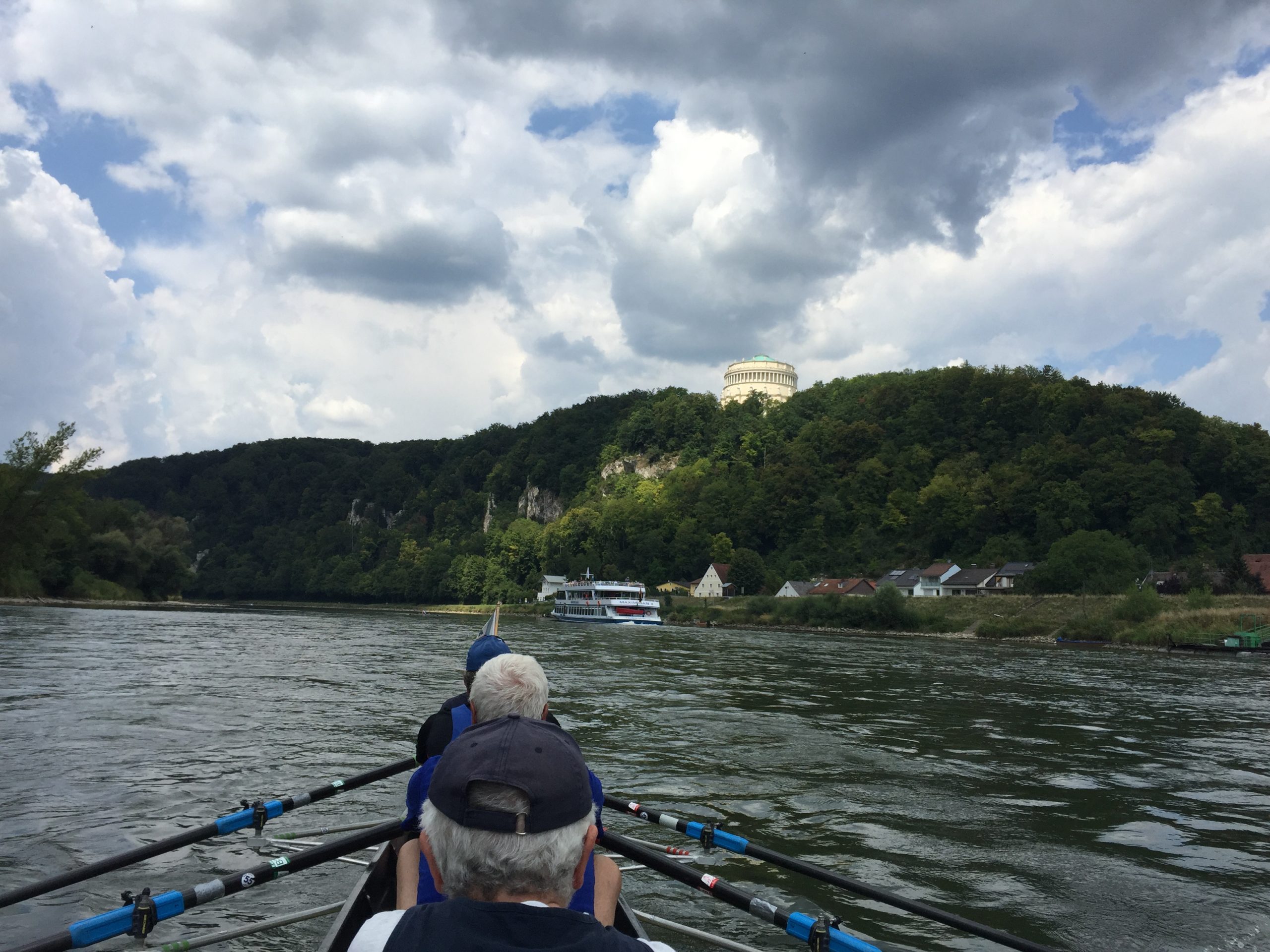 Der Schiffsverkehr hielt sich in Grenzen, da die Berufsschiffahrt wegen Niedrigwasser weitestgehend gesperrt war. Nur ein paar Ausflugsdampfer aus Kelheim zwangen uns hin und wieder zu einer zusätzlichen kleinen Ruderpause, um „Wellen anzunehmen“. Auch den Blick auf die Befreiungshalle bei Kelheim, erbaut von Ludwig dem I., konnten wir so besser genießen. Die Sonne gab ihr bestes, konnte aber um die Mittagszeit ein kleines Gewitter nicht ganz vertreiben. Während der erste Donner verhallte, landeten wir gerade noch rechtzeitig vor einem kräftigen, aber warmen Schauer im Sportboothafen Kehlheim an. Die leckeren Kuchen von Elke und Dieter halfen uns, die Zeit in gemütlicher Runde zu überstehen. Nachdem das Donnerwetter gut überstanden war und die Sonne wieder schien, führte uns der erste Rudertag bei minimaler Strömung weiter von Kehlheim über Aschach – mit einer interessanten Bootsgasse – bis zu unserem Übernachtungsquartier „Hotel Krieger“ in Mariaort.