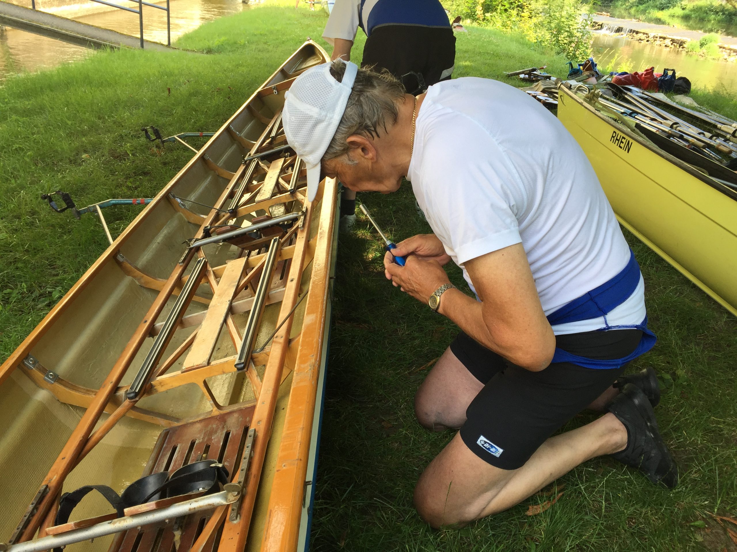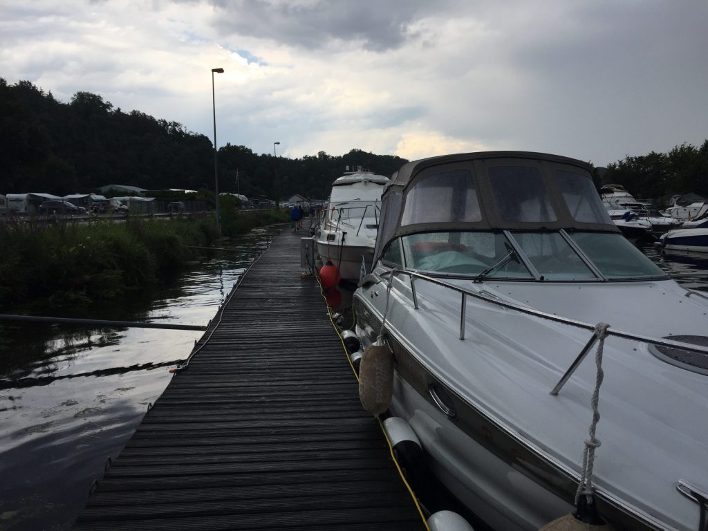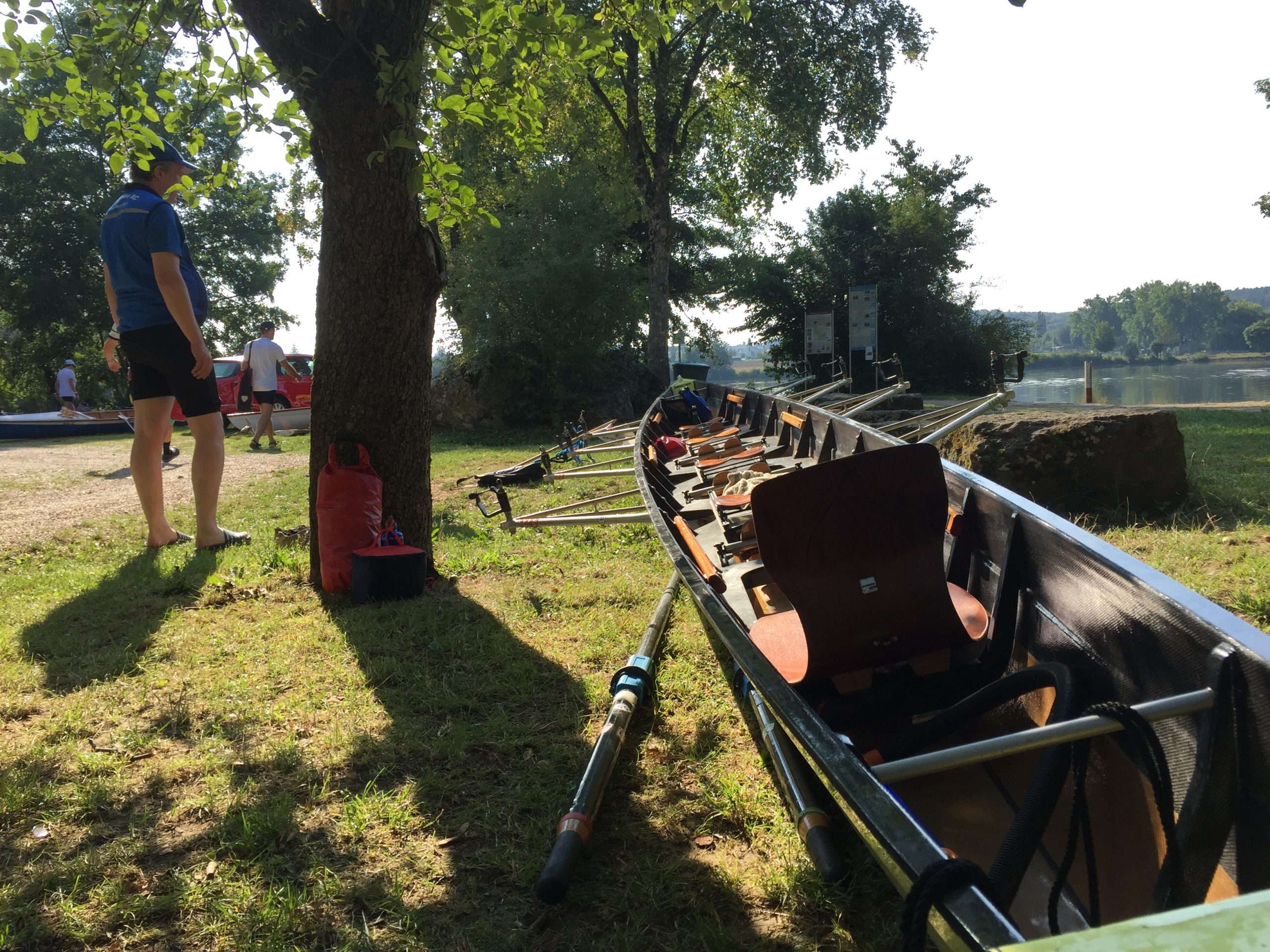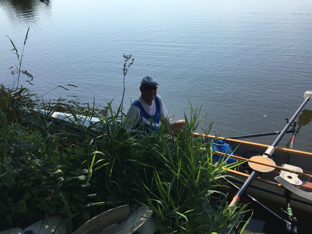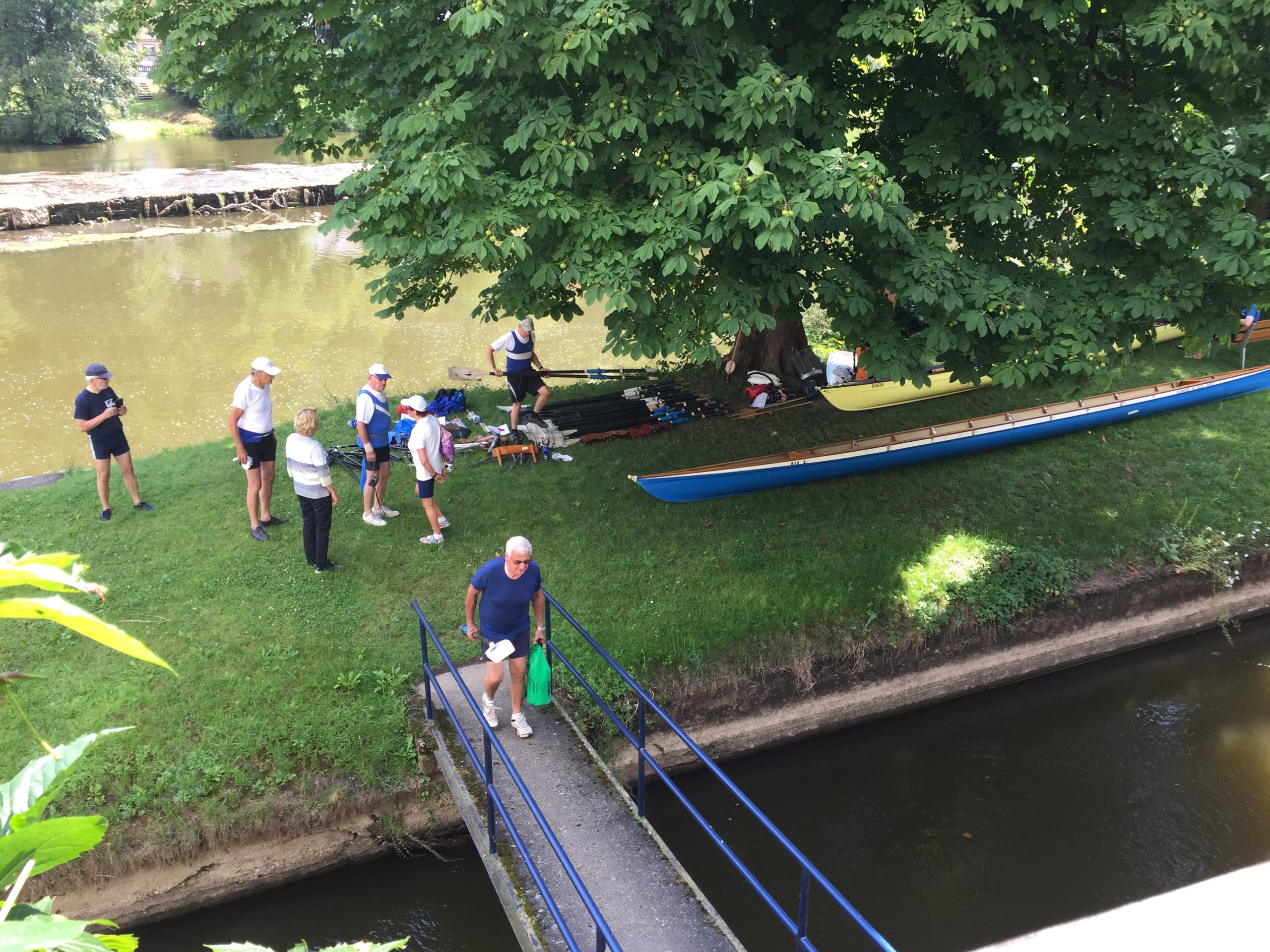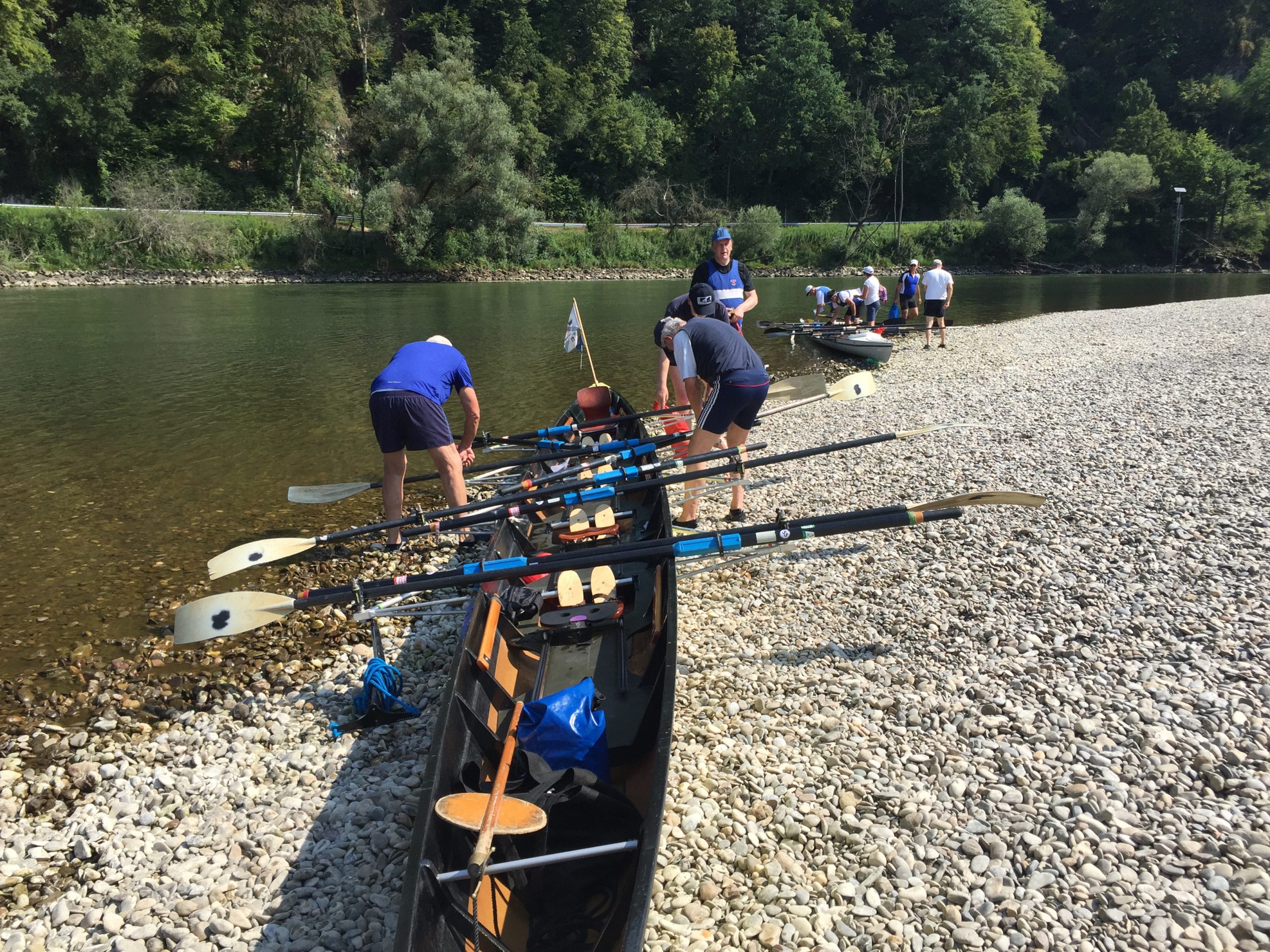 Der Schiffsverkehr hielt sich in Grenzen, da die Berufsschiffahrt wegen Niedrigwasser weitestgehend gesperrt war. Nur ein paar Ausflugsdampfer aus Kelheim zwangen uns hin und wieder zu einer zusätzlichen kleinen Ruderpause, um „Wellen anzunehmen“. Auch den Blick auf die Befreiungshalle bei Kelheim, erbaut von Ludwig dem I., konnten wir so besser genießen. Die Sonne gab ihr bestes, konnte aber um die Mittagszeit ein kleines Gewitter nicht ganz vertreiben. Während der erste Donner verhallte, landeten wir gerade noch rechtzeitig vor einem kräftigen, aber warmen Schauer im Sportboothafen Kehlheim an. Die leckeren Kuchen von Elke und Dieter halfen uns, die Zeit in gemütlicher Runde zu überstehen. Nachdem das Donnerwetter gut überstanden war und die Sonne wieder schien, führte uns der erste Rudertag bei minimaler Strömung weiter von Kehlheim über Aschach – mit einer interessanten Bootsgasse – bis zu unserem Übernachtungsquartier „Hotel Krieger“ in Mariaort.