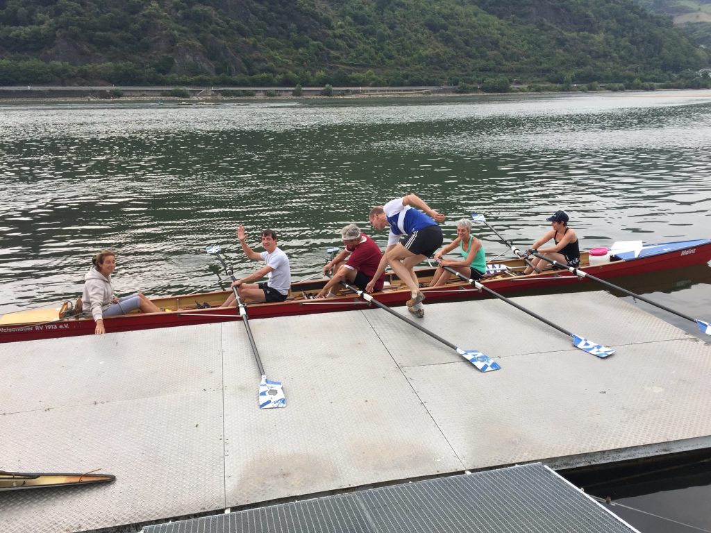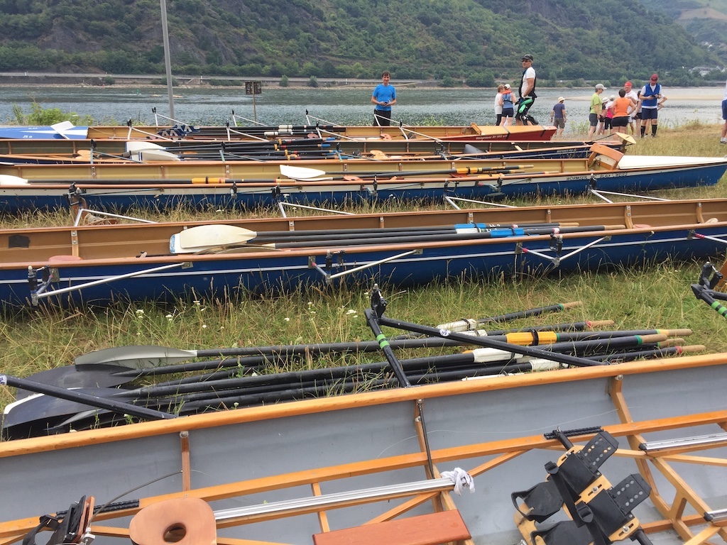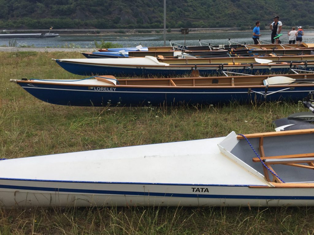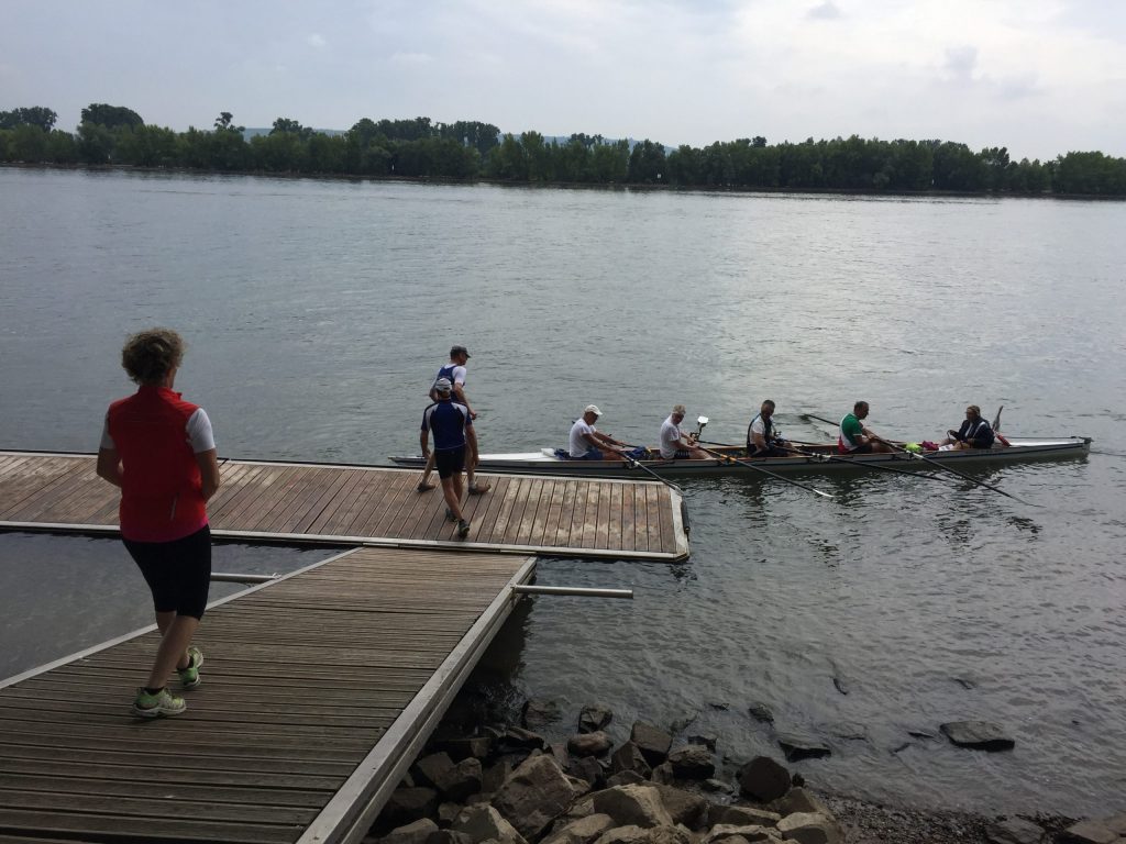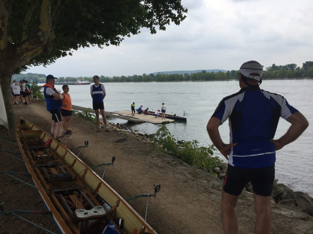 Die Sonne schien auf den Rhein bei Worms. Während die ersten Skulls schon auf den Steg transportiert wurden, kamen vier Ruderer noch vom Bahnhof. Herzliche Begrüßung, Boote zu Wasser bringen, Sachen verstauen, an Lenzpumpen und Piddelhaken denken, Bug- und Heckleinen befestigen, Steuer einhängen, fertig machen zum Ablegen und los geht’s.