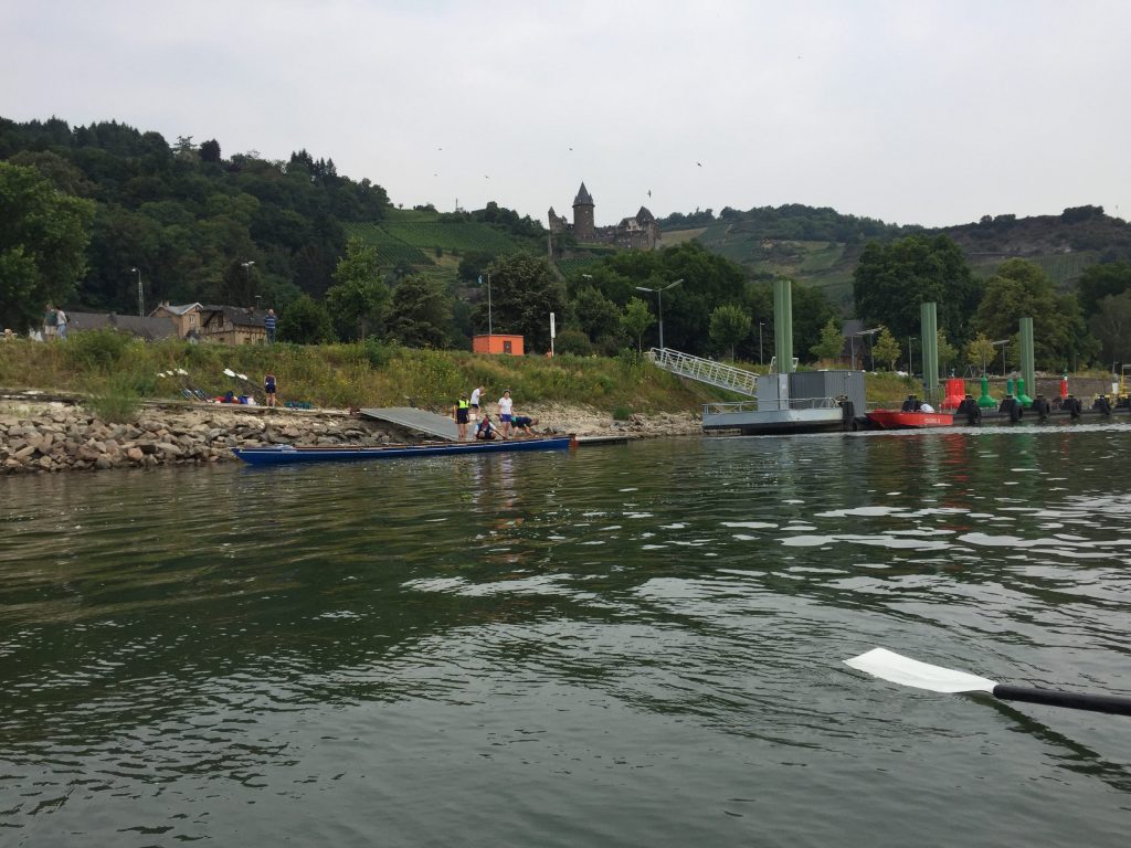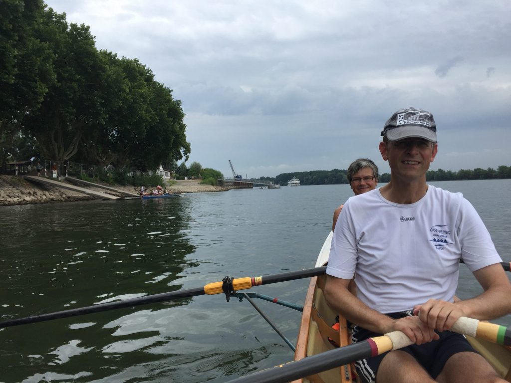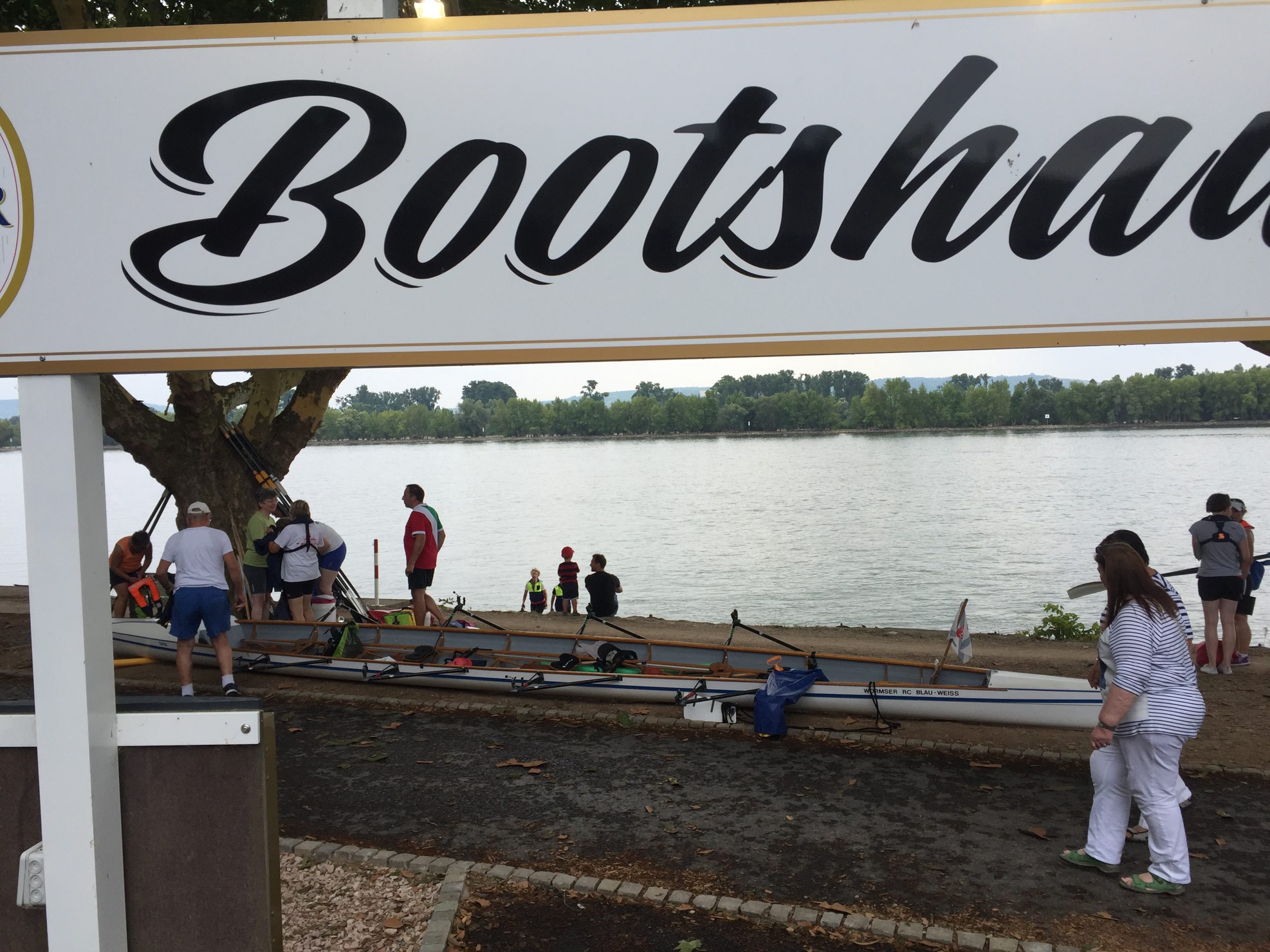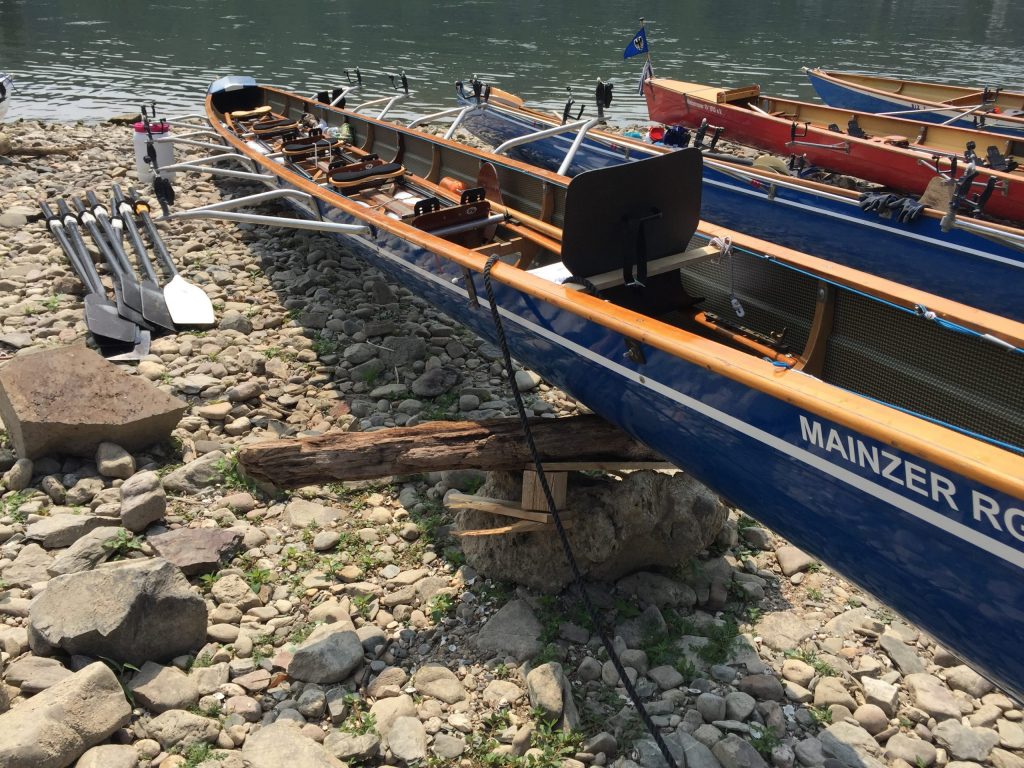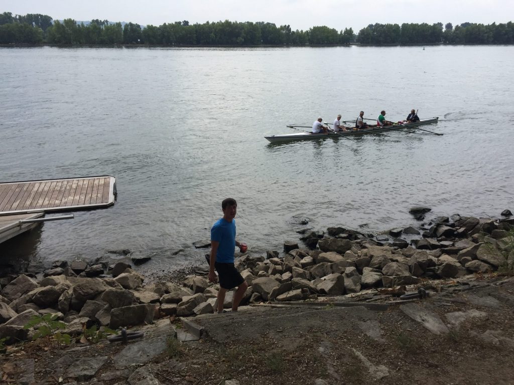 Die Sonne schien auf den Rhein bei Worms. Während die ersten Skulls schon auf den Steg transportiert wurden, kamen vier Ruderer noch vom Bahnhof. Herzliche Begrüßung, Boote zu Wasser bringen, Sachen verstauen, an Lenzpumpen und Piddelhaken denken, Bug- und Heckleinen befestigen, Steuer einhängen, fertig machen zum Ablegen und los geht’s.