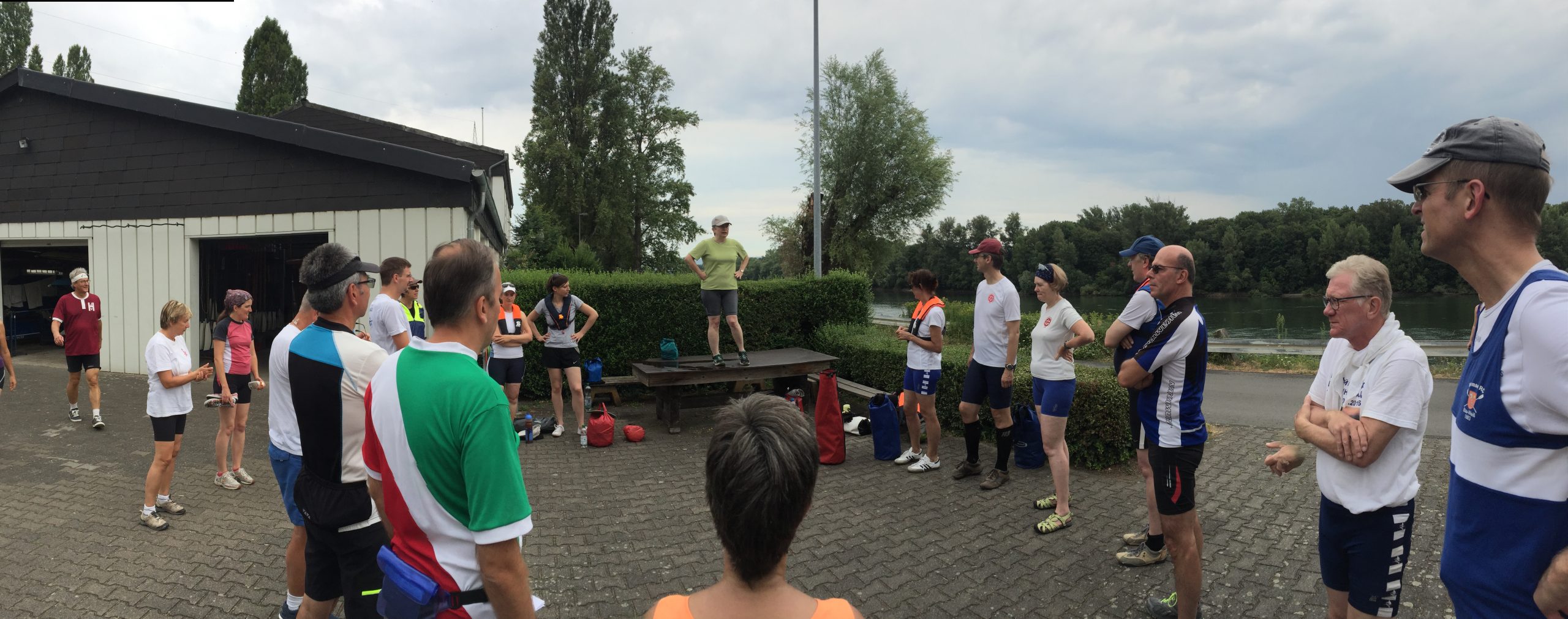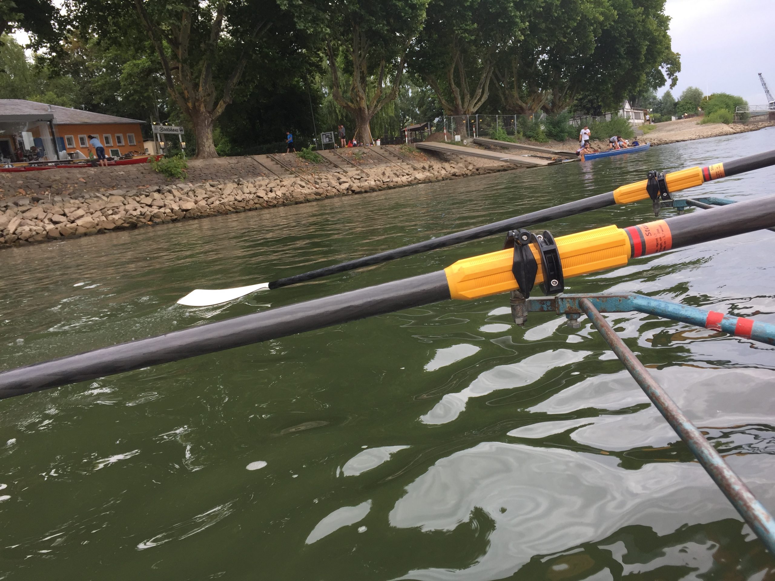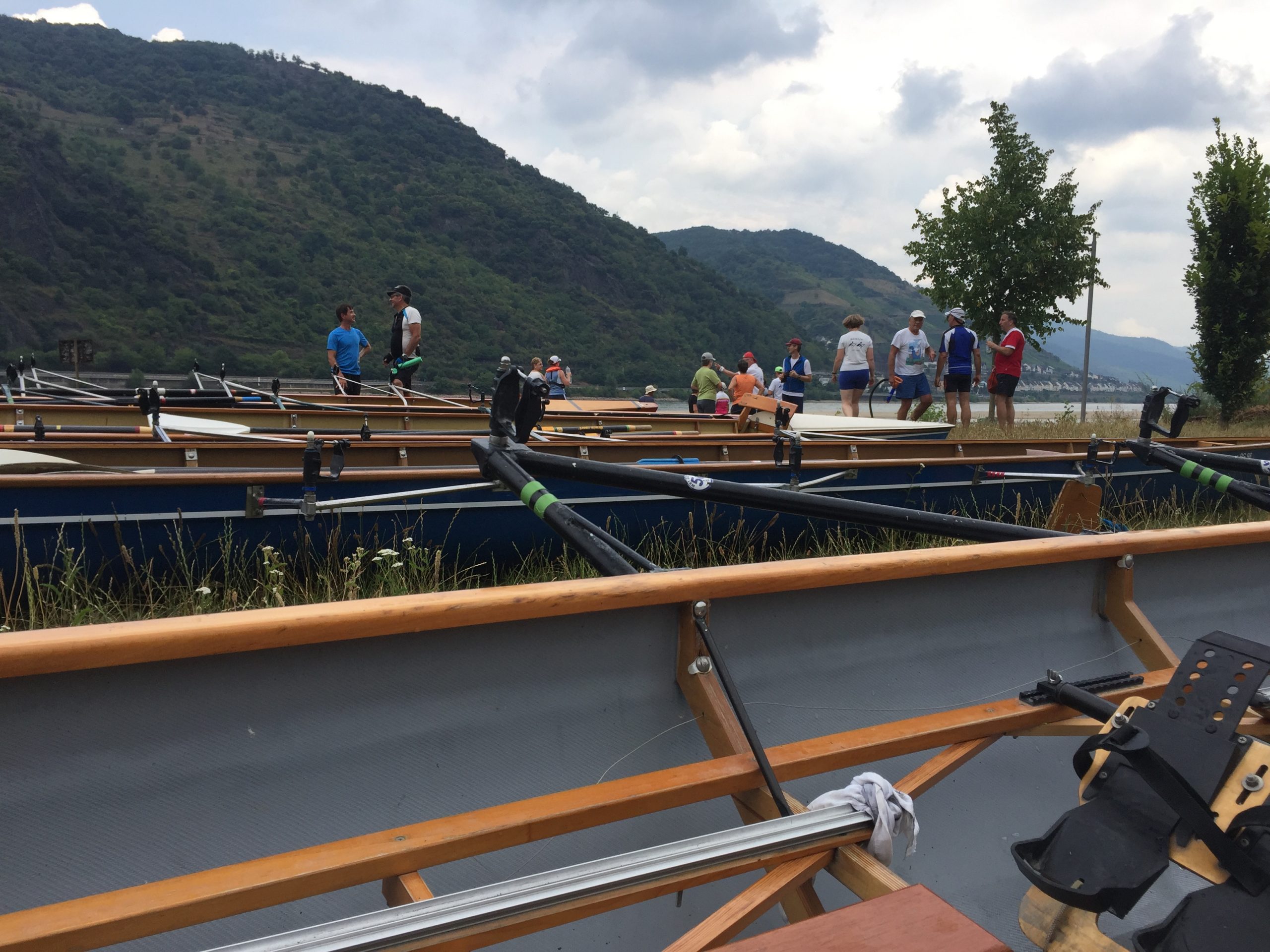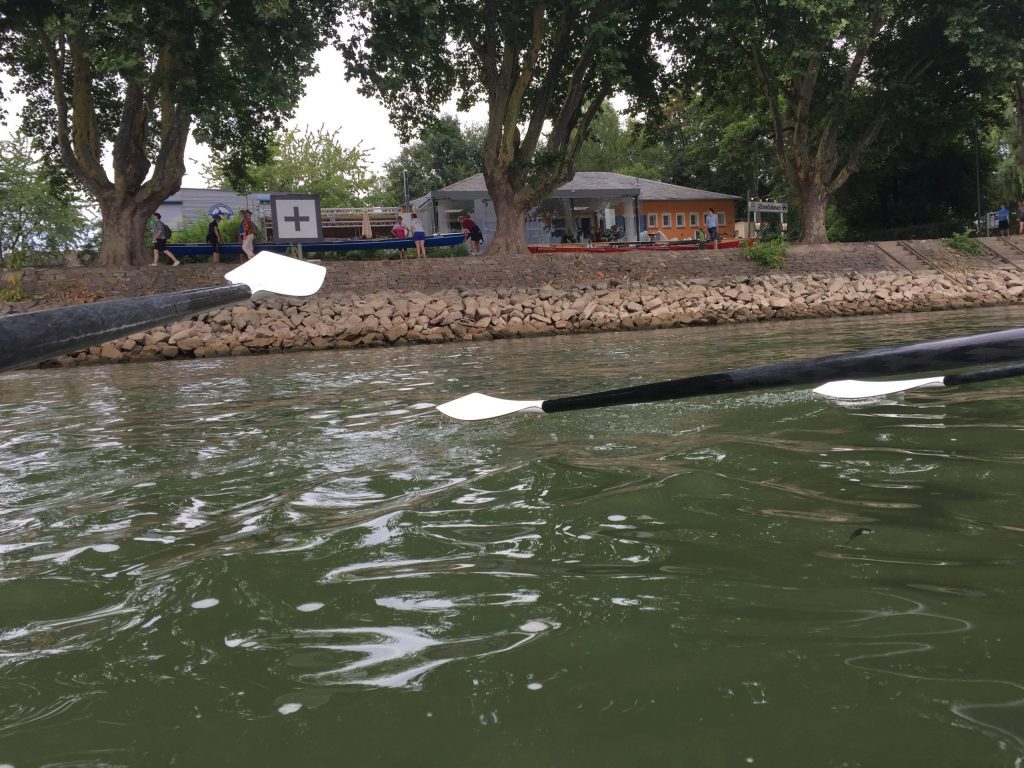 Die Sonne schien auf den Rhein bei Worms. Während die ersten Skulls schon auf den Steg transportiert wurden, kamen vier Ruderer noch vom Bahnhof. Herzliche Begrüßung, Boote zu Wasser bringen, Sachen verstauen, an Lenzpumpen und Piddelhaken denken, Bug- und Heckleinen befestigen, Steuer einhängen, fertig machen zum Ablegen und los geht’s.