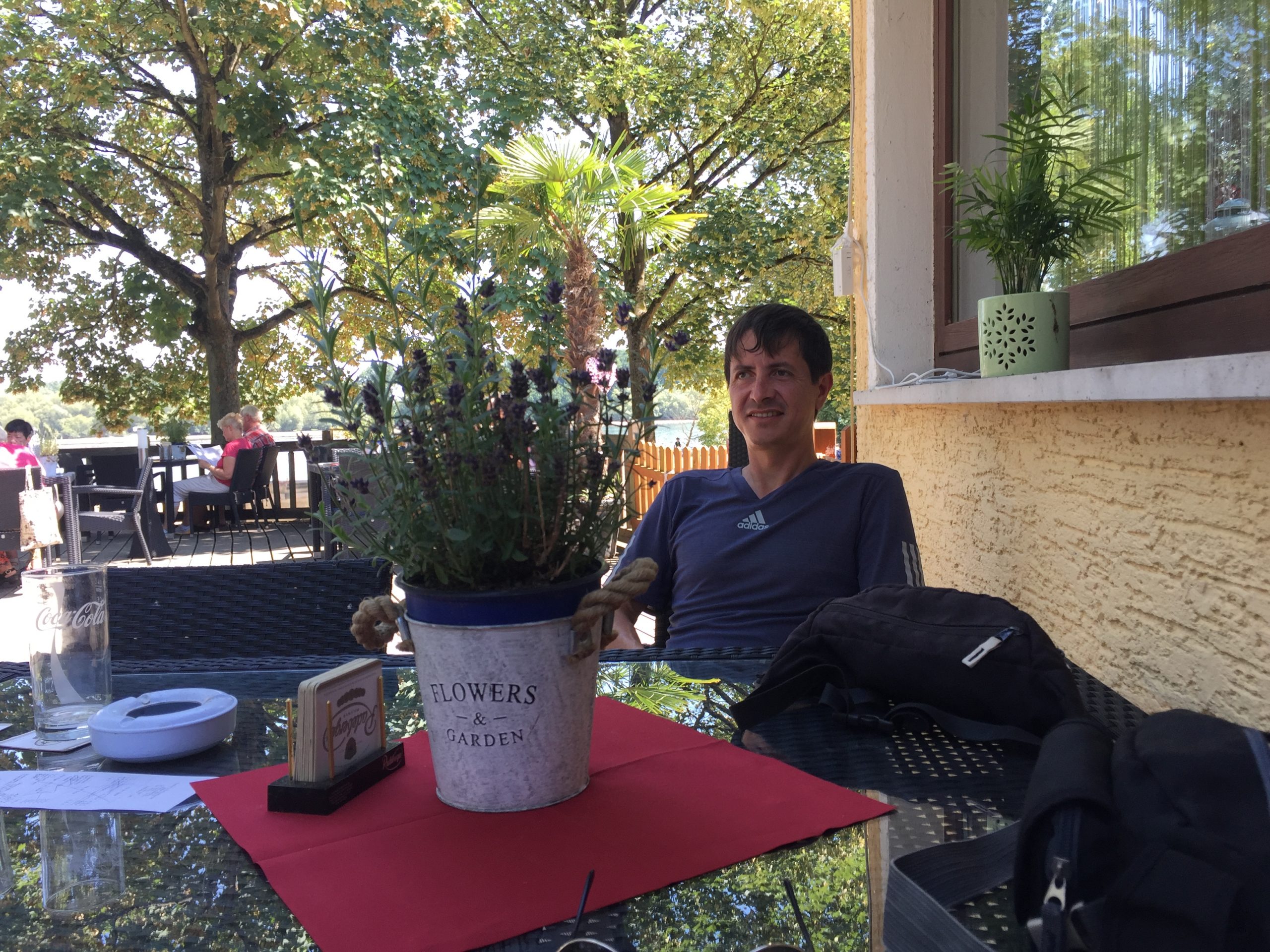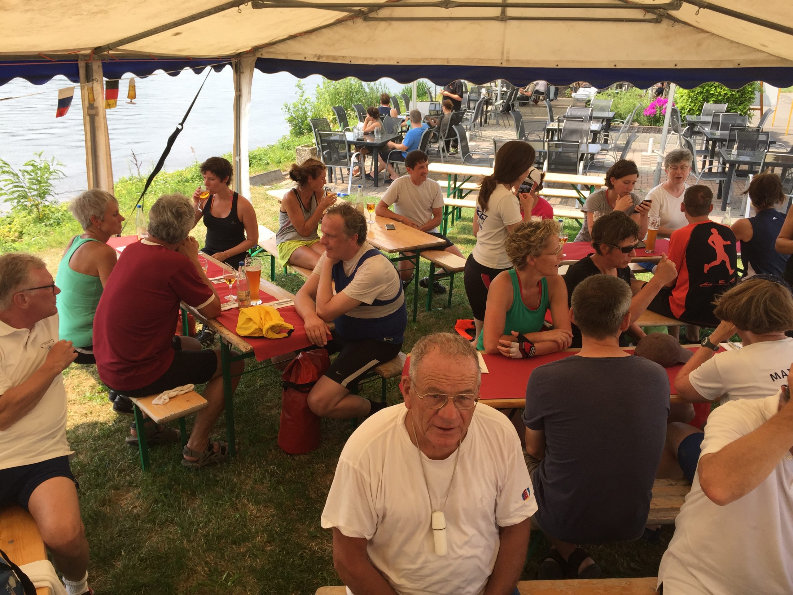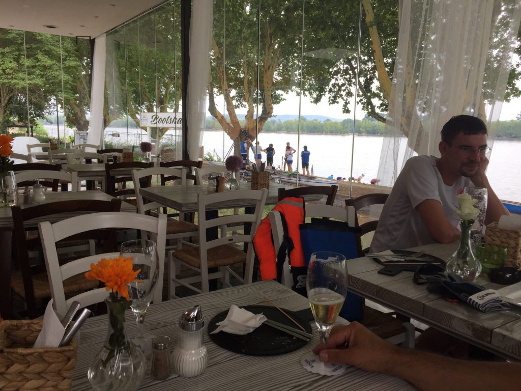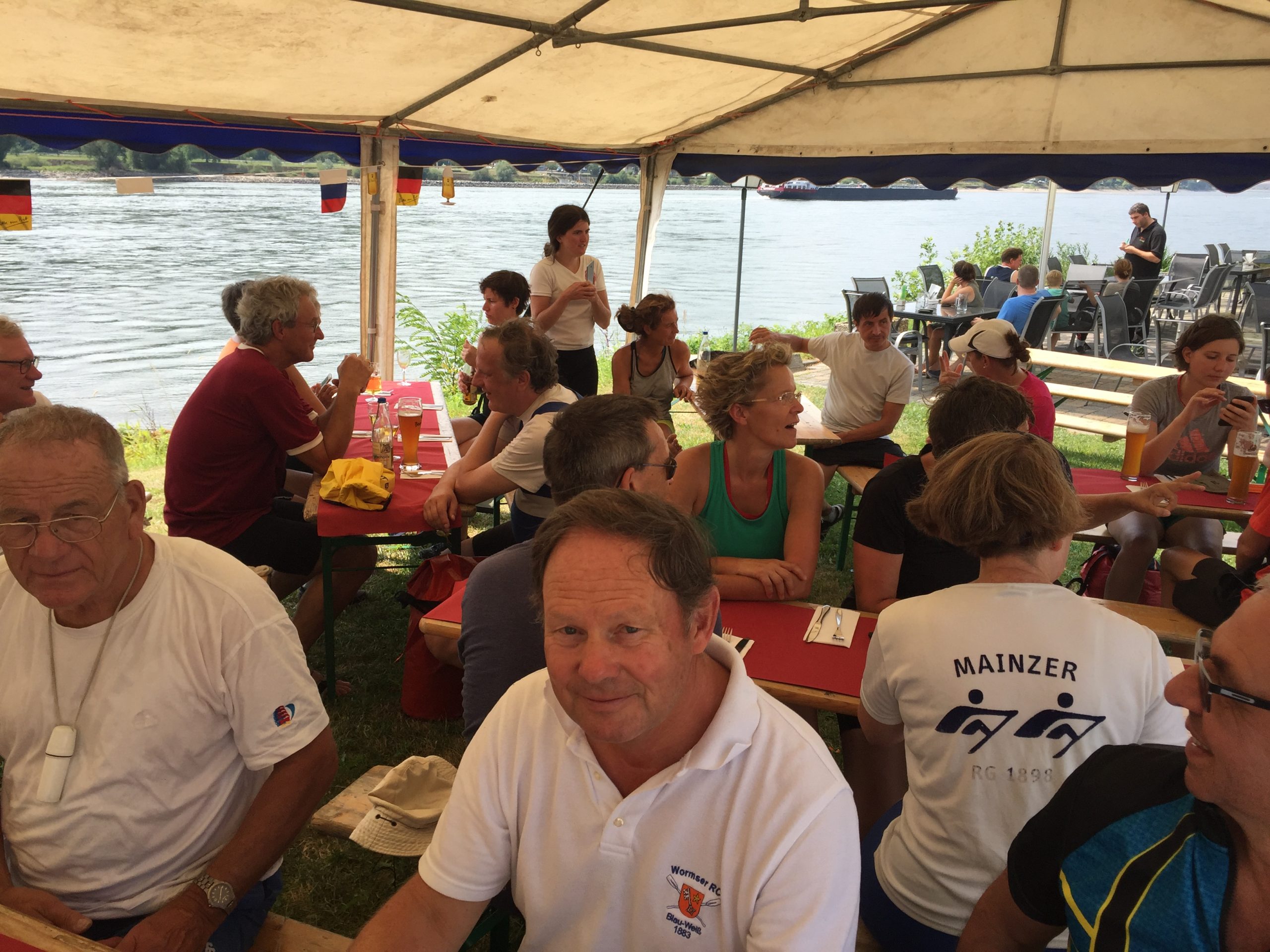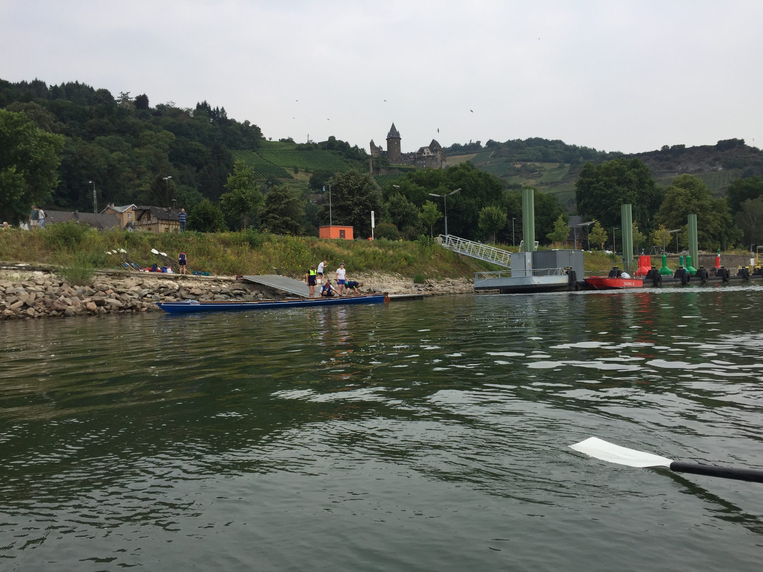 Der weitere Beschluss, in Oppenheim die nächste Pause zu machen, kam bei allen gut an. Nach gekonntem Anlegemanöver im flachen Wasser an der Bucht gab es trotz hektischem Betrieb auf der Terrasse für jeden etwas Erfrischendes zu trinken. Erste Kuchen, Flammkuchen oder Pommes wurden geordert und nach einer gefühlten Ewigkeit auch geliefert.