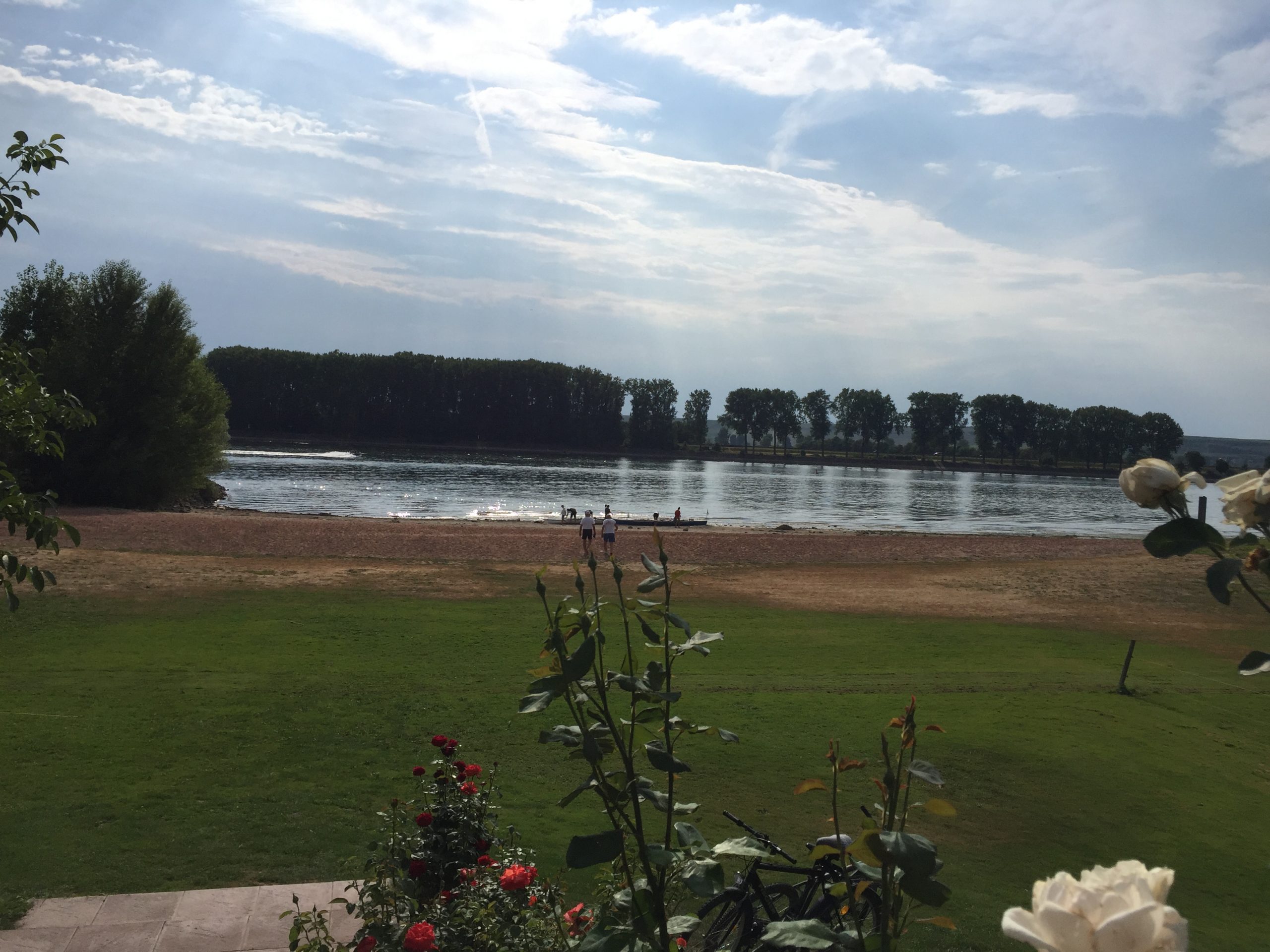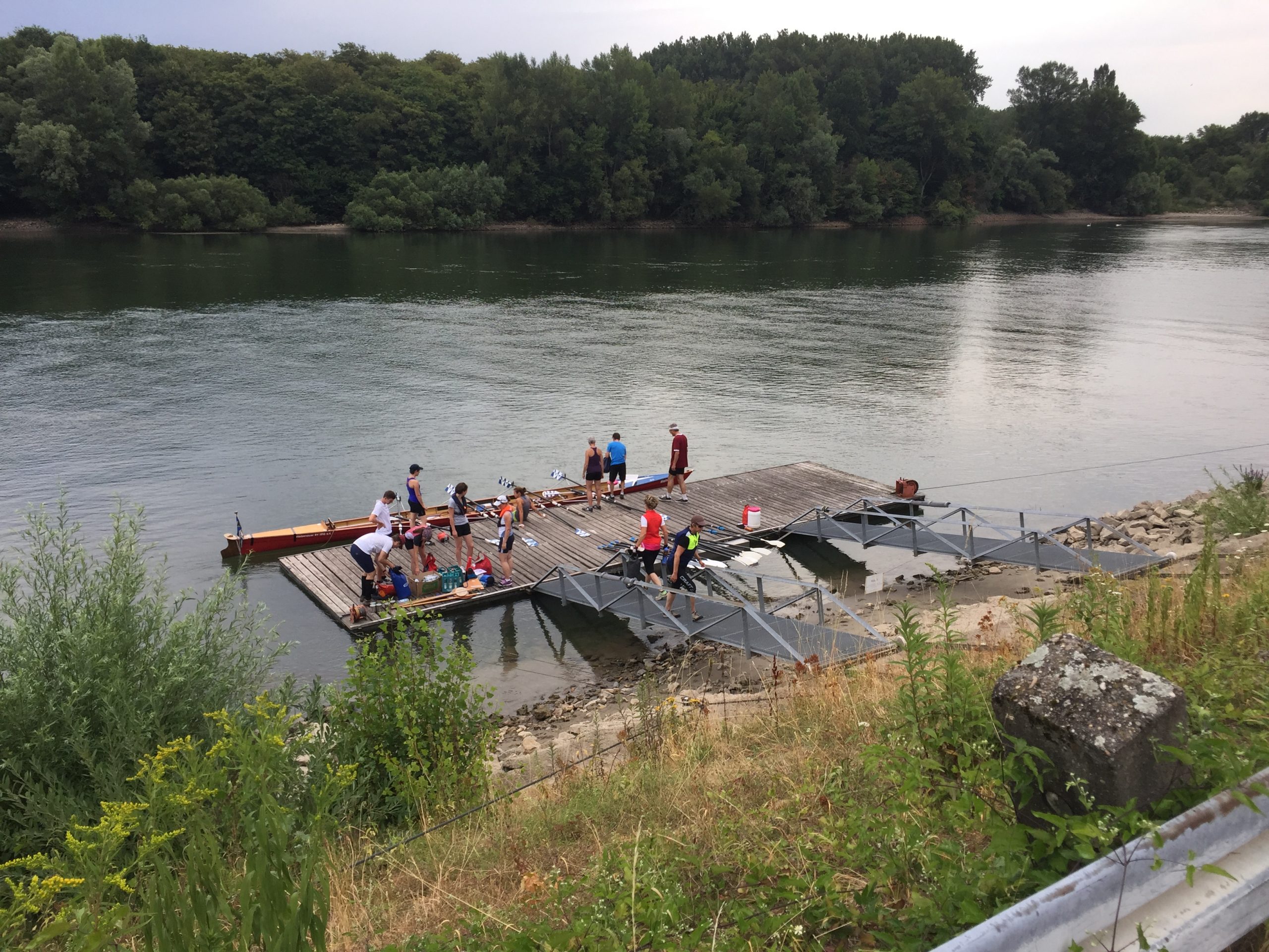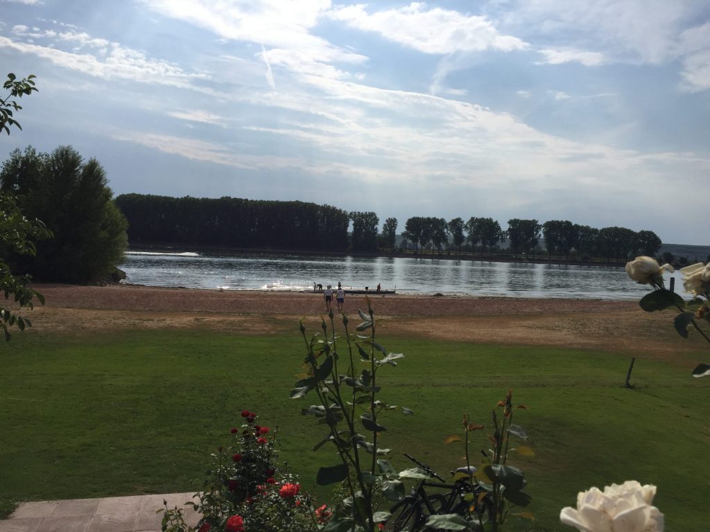 Das Niedrigwasser hatte den Vorteil, dass die Berufsschiffahrt nicht wie sonst aktiv war und wir gemächlich Richtung Kernkraftwerk Biblis zum ersten ausgedehnten „Ruder-halt“ ruderten.