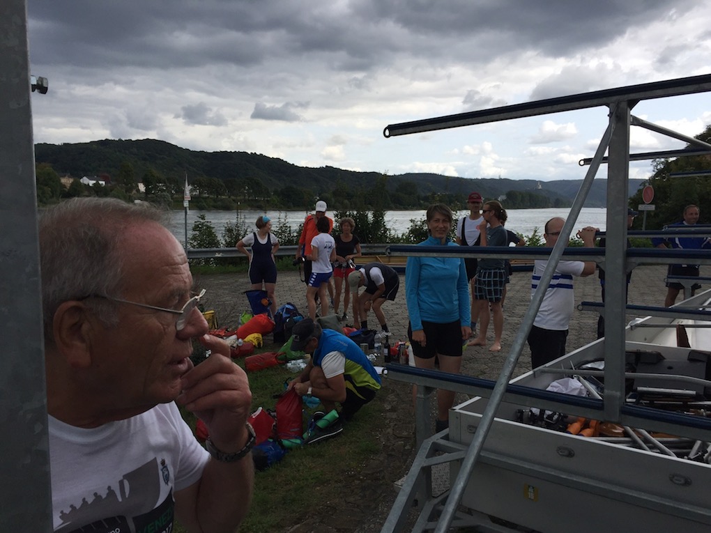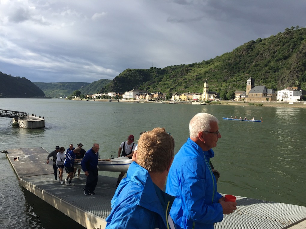 Der große Bus holte am Sonntagmorgen alle am Kronprinzen wieder ab und fuhr uns über Serpentinen mit dem unbeschreiblich schönen Ausblick über das Tal der Loreley zum Bootshaus. Wie üblich führte uns die Fahrt traditionell zum RC Germania Boppard. Mittagessen by Selfservice war angesagt. Alle mitgebrachten Brote, Würste, Tomaten, Gurken, Käsesorten, Äpfel, Kekse und diverse „Getränke“ kamen auf den Tisch.