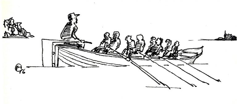 Die Sonne schien auf den Rhein bei Worms. Während die ersten Skulls schon auf den Steg transportiert wurden, kamen vier Ruderer noch vom Bahnhof. Herzliche Begrüßung, Boote zu Wasser bringen, Sachen verstauen, an Lenzpumpen und Piddelhaken denken, Bug- und Heckleinen befestigen, Steuer einhängen, fertig machen zum Ablegen und los geht’s.
