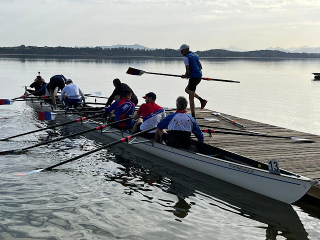 Schon letztes Jahr unser Saisonabschluss: die Regatta des Waginger Rudervereins. 18 km sind zu rudern, mit jeweils einer Schleife im Waginger und im Tachinger See. Die Anfahrt ist nicht ganz ohne, Waging liegt in der Nähe des Chiemsees kurz vor der österreichischen Grenze, aber immerhin waren wir ja Titelverteidiger von letztem Jahr.