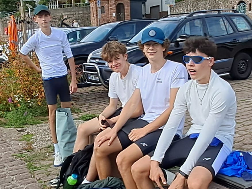 In der Nacht von Samstag auf Sonntag regnete es recht stark, die Boote waren voll Wasser. Vom Frühstück gestärkt und ausgecheckt begannen wir den Tag mit gemeinschaftlichem Booteausleeren mit Lenzpumpen, Bechern und Flaschen. Dann ging es aber rasch in die Boote, nach und nach durch zwei Schleusen Richtung Heidelberg, Und schon kam der windige und wellige Abschnitt kurz vor Heidelberg, unserem Ziel der Wanderfahrt. Durch ein paar schnelle Schläge und kleine Wettrennen kamen wir schneller durch als gedacht. Mit dem Wetter hatten wir wirklich Glück, so waren die 15 km des Tages sehr schön zu rudern. Dann war auch schon wieder Abriggern und Aufladen angesagt, während die Autofahrer ihre Autos herbeiholten. Von der RGH nach Lampertheim, wieder Abladen und aufriggern aller Boote. Kurzentschlossen ruderten neun Freiwillige zwei Boote nach Worms, um zu Wasser dem Nibelungenlauf aus dem Weg zu gehen, sodass der Hänger in Lampertheim bleiben konnte und alle Boote in „ihre“ Halle kamen.