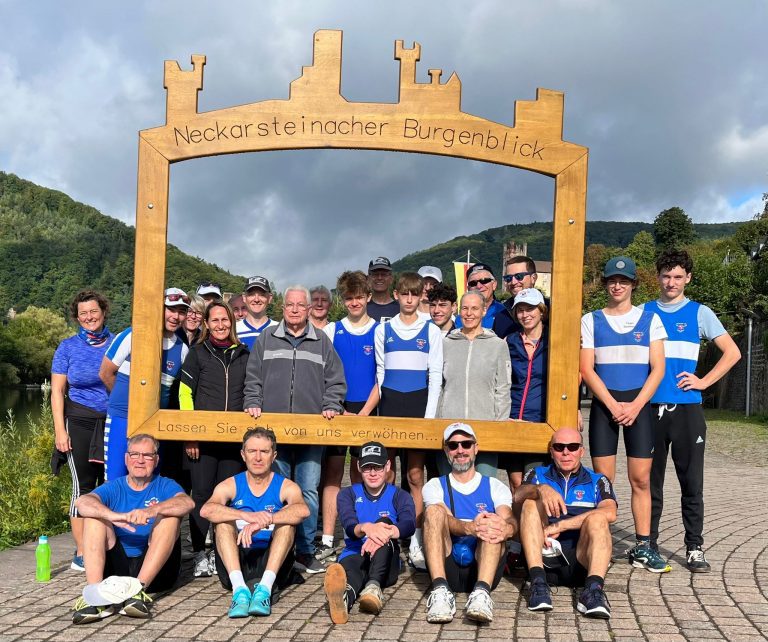 Samstag nach dem Frühstück fuhren wir mit den PKWs und Clubbus zum Start nach Zwingenberg und legten bald ab. Trotz Regenvorhersage hatten wir samstags überwiegend Sonne und ruderfreundliches Wetter. Auch die drei Schleusen stellten kein Problem dar und wir konnten während des Ruderns den Anblick der grünen, stark bewaldeten Natur genießen. In Eberbach passierten wir die Bootswerft Empacher. Zwischendurch wurde für ein Picknick angelegt und anschließend zum Tagesziel Neckarsteinach gerudert, wo bereits das Essen im Biergarten „Zum Schwanen“, dank rechtzeitig fertiggestellter Sammelbestellung, auf uns wartete. Wir legten an, hoben die Boote auf den Parkplatz und stellten einige für die Nacht, in der definitiv Regen angekündigt wurde, kieloben auf Böcke. Während die Ersten im Biergarten verweilten, wurden die „Autofahrer“ zu ihren Autos gebracht, damit nach gemeinsamem Essen alle Teilnehmer wieder mit ihnen zur JH gelangen konnten. Dort klang der Abend deutlich ruhiger aus als Tags zuvor, wohl wegen der knapp 30 geruderten Kilometer.