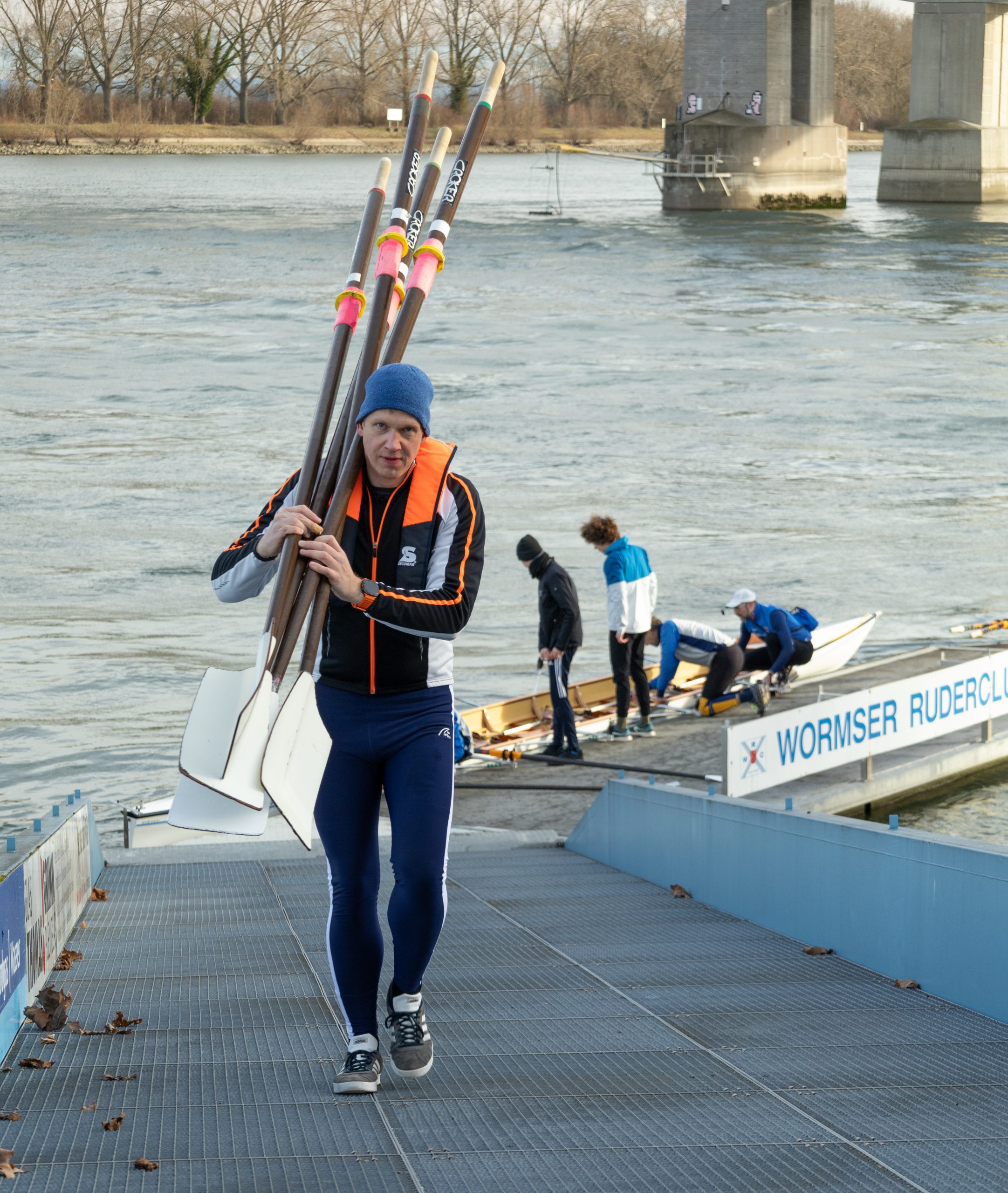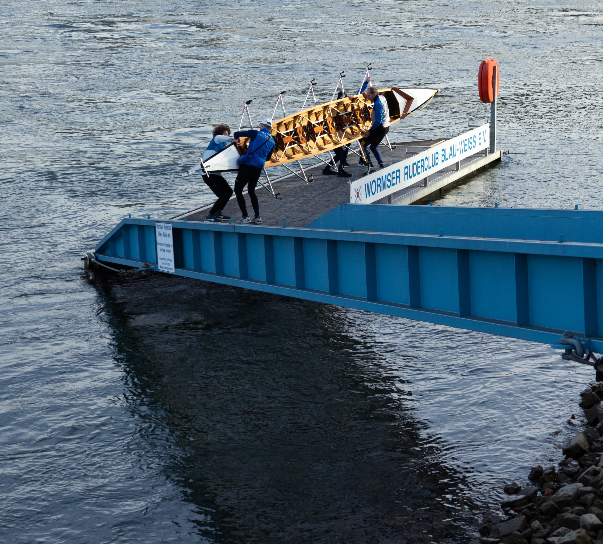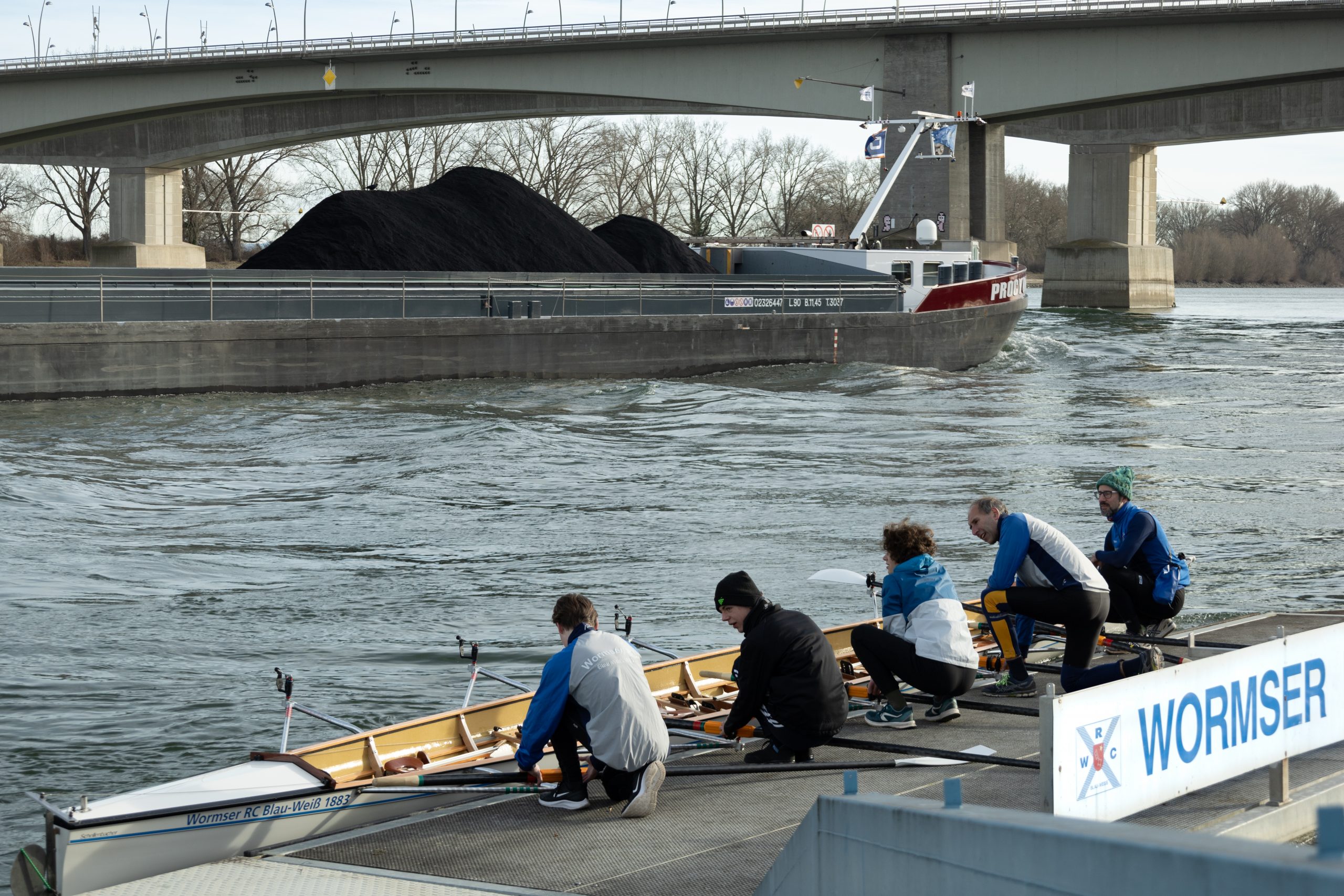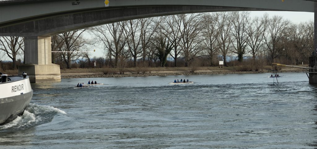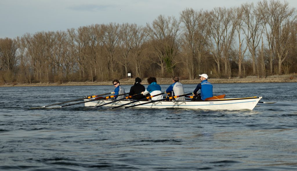 Die 1. Vorsitzende Sabine Teigland und viele Mitglieder und Freunde des WRC konnten vom Ufer aus um 14 Uhr vier Boote vor der Pritsche begrüßen. Die Ruderer setzten sich aus jungen Rennruderern mit Trainer und erfahrenen Wanderruderern und Breitensportlern zusammen. Die Ausfahrt ging an dem Tage zum zweiten Bootshaus am Lampertheimer Altrhein oder nur kurz in den Floßhafen. Das gemeinsame Einfinden vor dem Anleger erforderte Geschick und Teamarbeit. Die Sonne lachte und frühlingshafte Temperaturen machten die Ausfahrt zu einem schönen Erlebnis, da störten auch kräftige Wellen der Großschiffahrt nicht.