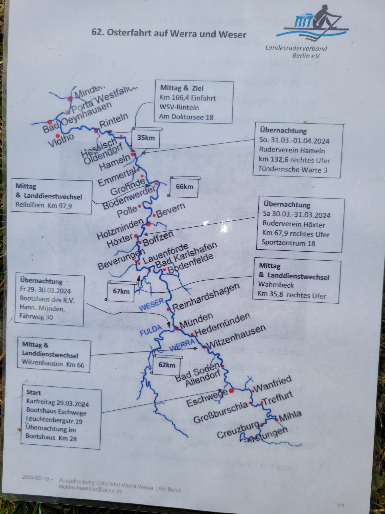 Bereits Ende 2023 war die 40. (?) Auflage der Osterwanderfahrt auf rudern.de ausgeschrieben. Es versprach ein Stück Neuwasser mit vielen Ruderkilometern mit nur einem Urlaubstag. Also – angemeldet, Zugticket gebucht und hinein ins Abenteuer. Wer denkt schon, dass ältere Herrschaften auf Luftmatratzen vier Nächte in Bootshäusern nächtigen? Und es waren etliche Wiederholungstäter dabei.