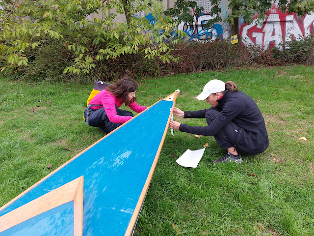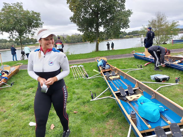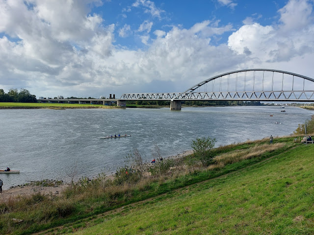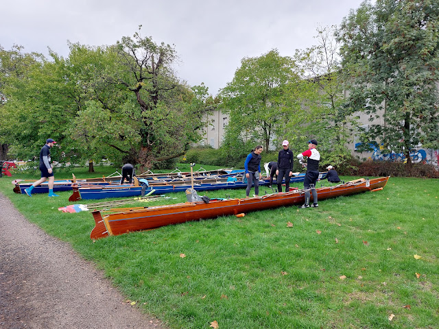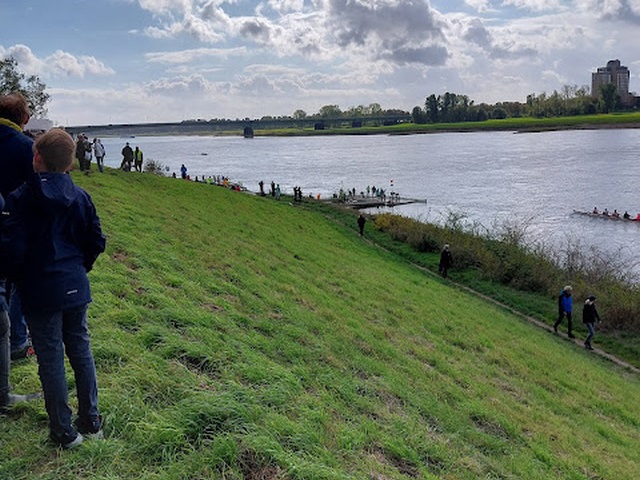 Etwa 8 km vor dem Ziel an der Fleher Brücke dann ein richtig heftiger Gegensturm, die Zeit sagt immer noch 4 min/km, aber das ist so nach 35 km ein heftiges Programm. Erst 2 km vor dem Ziel wird es wieder etwas ruhiger und wir bekommen noch einen ganz guten Endspurt hin. Sehr professionell organisiert ist das Anlegen, es gibt Rollwagen und Helfer, das ist nach 2:20 h Rudern doch ganz angenehm. Wir legen uns erstmal trocken in der Umkleide des Düsseldorfer RV und verfolgen dann den Rest entspannt am Streckenrand. Das Wetter wird ein bisschen besser, die Ergebnisse trudeln ein und wir können doch recht zufrieden sein. Die Zeit von 2:19,40 bringt uns auf den zweiten Platz (von 15) in der offenen Mixed-Klasse (mit dem Durchschnittsalter sind wir knapp an Masters C vorbei, A und B wurde nicht angeboten) und insgesamt erreichen wir einen 6. Platz von 150 Booten. Rückfahrt von Düsseldorf ab 17:45 h, etwa um 20:30 zuhause, ein gelungener, wenn auch etwas nasser Rudertag.