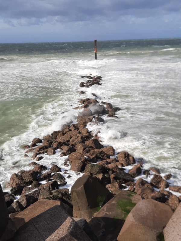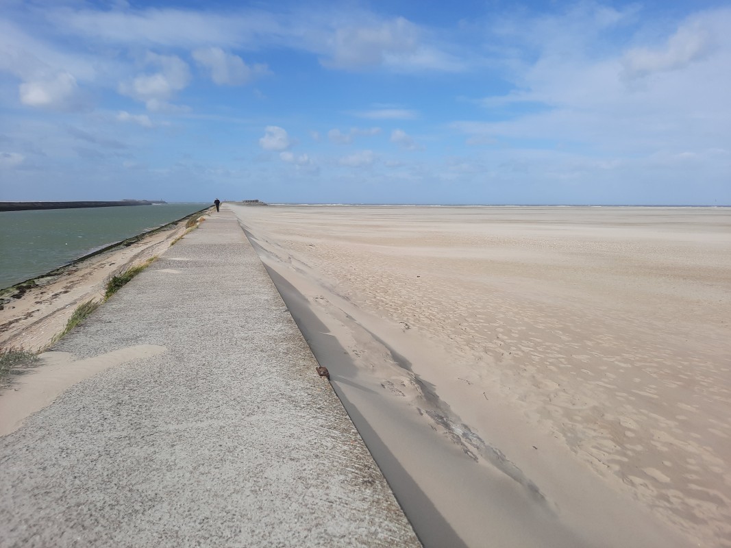 Später machte ich mich alleine auf den Weg entlang der Mole, die fast einen Kilometer weit in die Brandung führt. Der Wind blies so heftig, dass ich mehrmals stehen bleiben musste; ich hatte Angst, dass ich weggeweht werde. Später las ich, dass es Böen mit bis zu 60 km/h waren! Trotzdem schaffte ich es bis ganz nach vorne – ein Gefühl von Naturgewalt, das ich nie vergessen werde. Zurück am Leuchtturm – der an diesem Tag wegen des Sturms übrigens geschlossen war – ruhte ich mich kurz aus, bevor ich noch im Sturm durchs Watt zum ablaufenden Wasser lief. Insgesamt kamen so fast 20.000 Schritte zusammen.