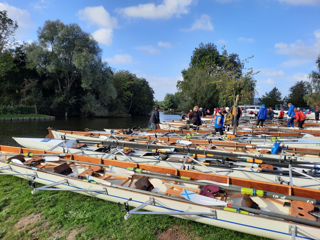 Bei kaltem Wetter versammelten wir uns früh morgens am Bootshaus unseres Partnervereins. Von dort brachte uns ein Bus zum Startpunkt. Schon beim Aussteigen herrschte geschäftiges Treiben: Überall Boote, Ruderer, helfende Hände, aufgeregtes Stimmengewirr. Die Freunde unseres Partnervereins hatten bereits alles vorbereitet – Boote aufgeriggert, Skulls bereitgelegt, heiße Getränke, Obst, Schokolade und Gebäck für alle. Nach einer kurzen Ansage wurde Boot für Boot ins Wasser gelassen. Anne und Christian ruderten in einem französischen Vierer, wir anderen – Holger S., Michelle, Susanne, Holger und ich – saßen in einem von Susanne gesteuerten Vierer.