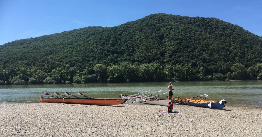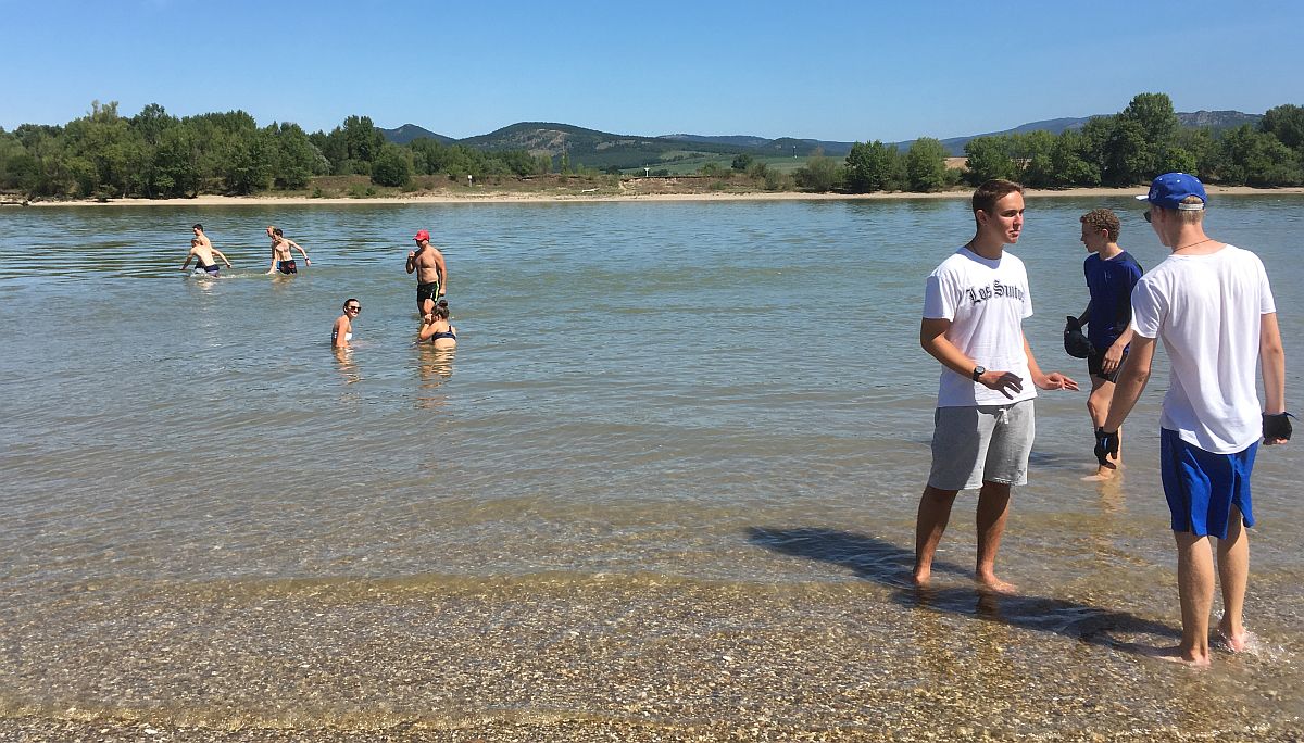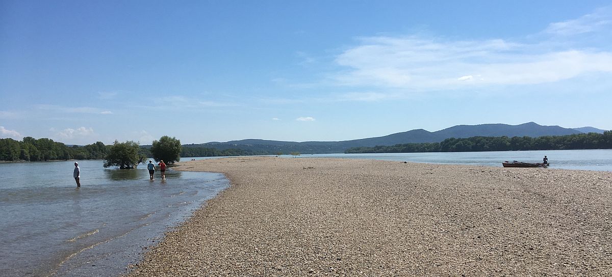 Am Donnerstag war die Wanderfahrt auf der Donau von Esztergom nach Visegrad vorgesehen. In gemischten Mannschaften mit 4 Booten konnten wir direkt auf dem Strom vor der Donaubrücke ablegen. Wir fuhren unter der Brücke hindurch und an der Basilika vorbei. Die Donau zeigte ihre eindrucksvolle Breite. Das Wasser lies sich nicht davon abbringen von unten in das Holzklinkerboot einzudringen. Mit einem Schwamm wurde es von Petra immer wieder zurück in die Donau geschöpft, das Leck dichtete sich nach einiger Zeit von selber ab. Anfangs markierte der Fluss hier die Grenze zur Slowakei. Wir pausierten auf einer Sandbank und konnten dort mitten im Fluss rasten und ein wenig baden. Es wurde aber auch schon an diesem Tag sehr heiß, so dass wir in Dömös am Campingplatz die Fahrt beendeten. Der Landdienst hatte dort das Freibad genießen können und zusammen genossen wir das Mittagessen im Camping-Etterem. Visegrad erreichen wir dann beim nächsten Mal.