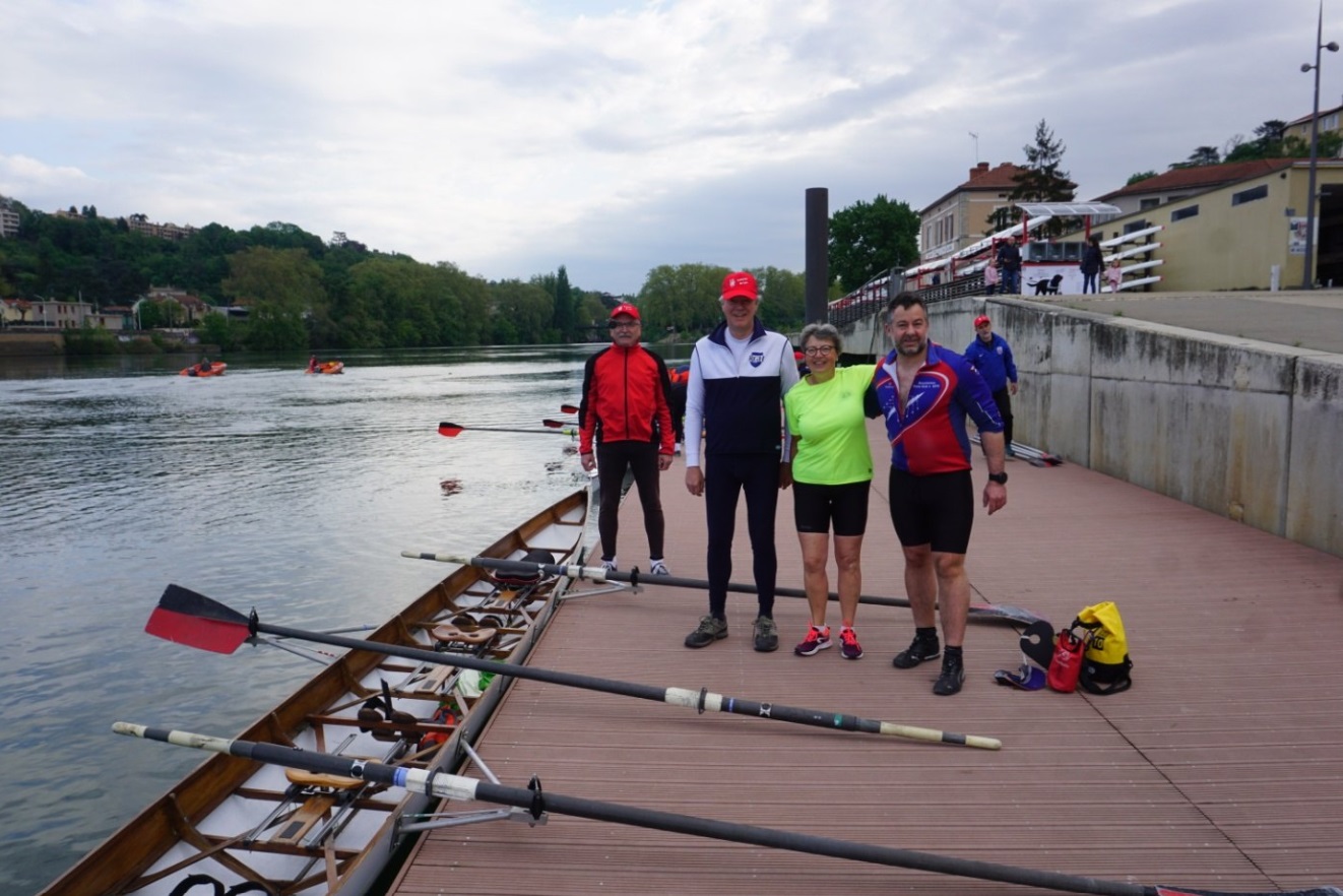 Montags war das Highlight der Tour: ca. 80 Boote ruderten nach dem Glockenschlag Saone-abwärts und ein Stück die Rhone hinauf, nach der Wende ging es überwiegend gegen die Strömung zurück. Ich war im Riemenvierer eingeteilt, das Boot wohl mit starken Ruderern besetzt, aber ein Riemenboot ist nun mal langsamer unterwegs als ein Skullboot. So konnten wir die Waterfront von Lyon zweimal ausgiebig bewundern, wobei sich manche Gebäude in grün und orange von dem sonst üblichen sehr abhoben.